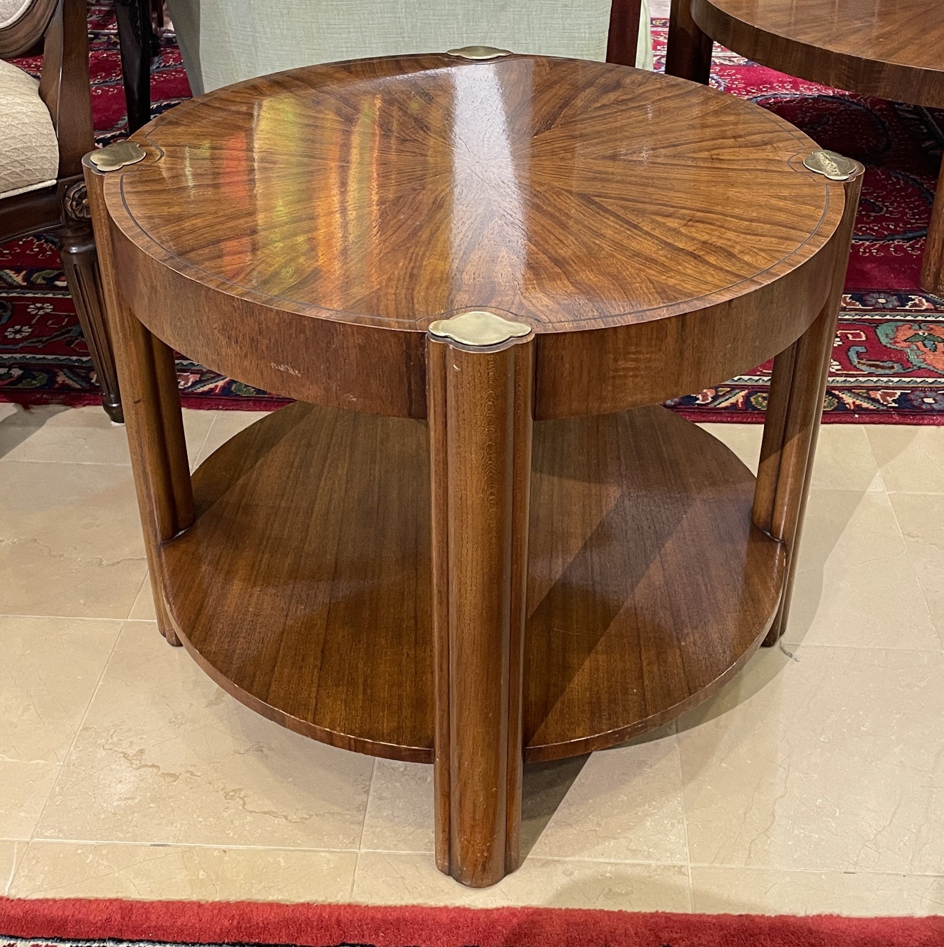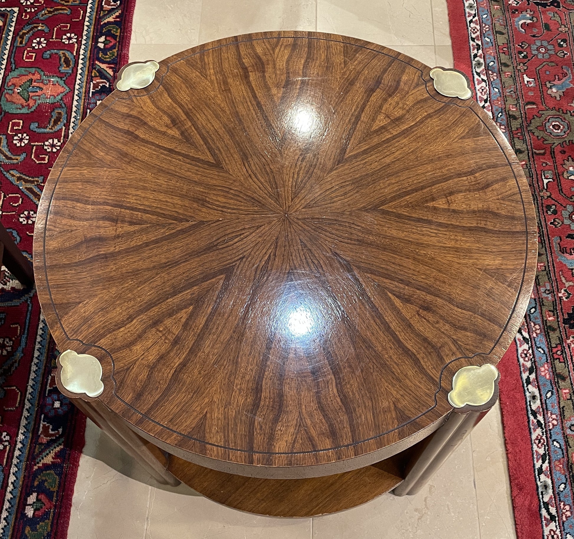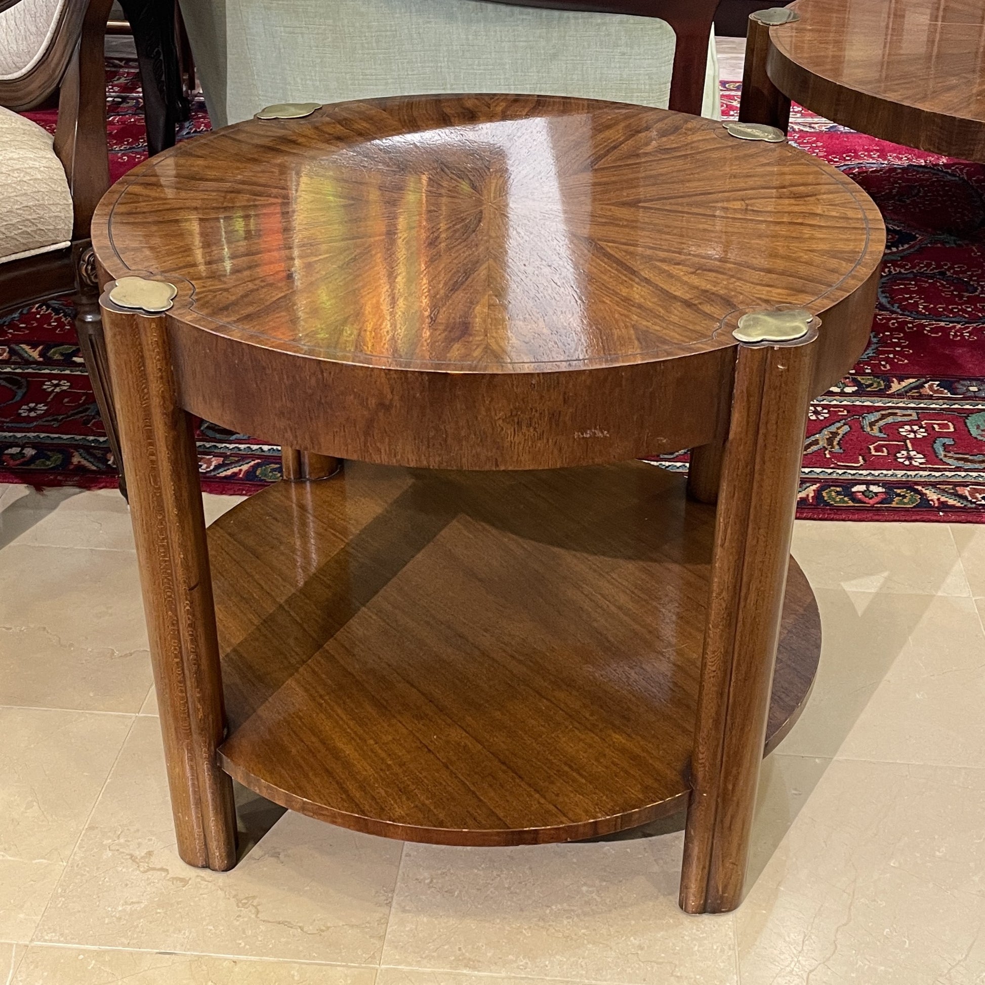 Baker two tier end table with brass clover accents. This art deco end table stands atop four clover shaped legs with shining brass accents at their apex. The mahogany table features two tiers - one thinner one near the base, and a thicker, more sturdy tier on top. Sturdy, stunning, and sleek, this piece would make a great addition to a living space.
