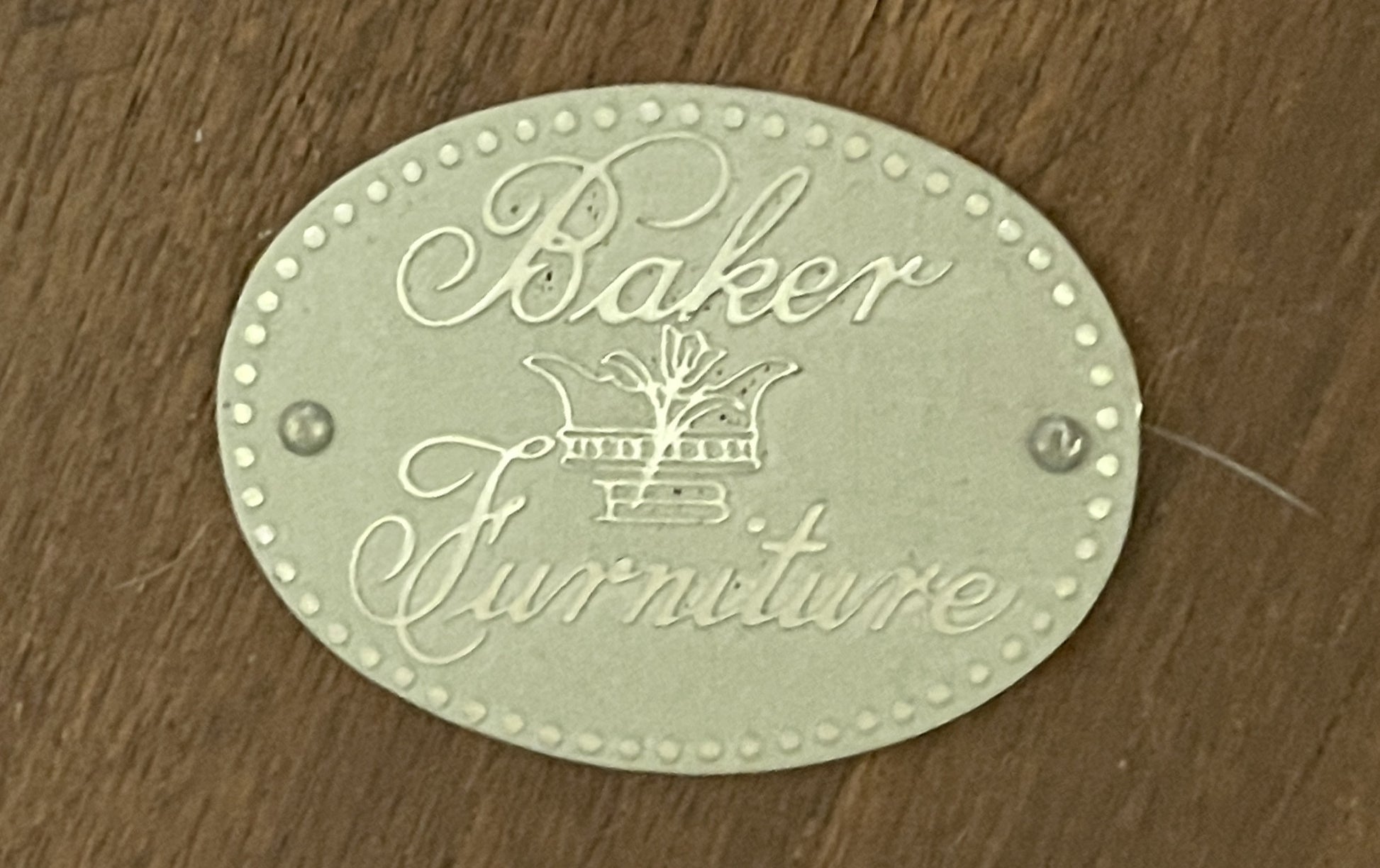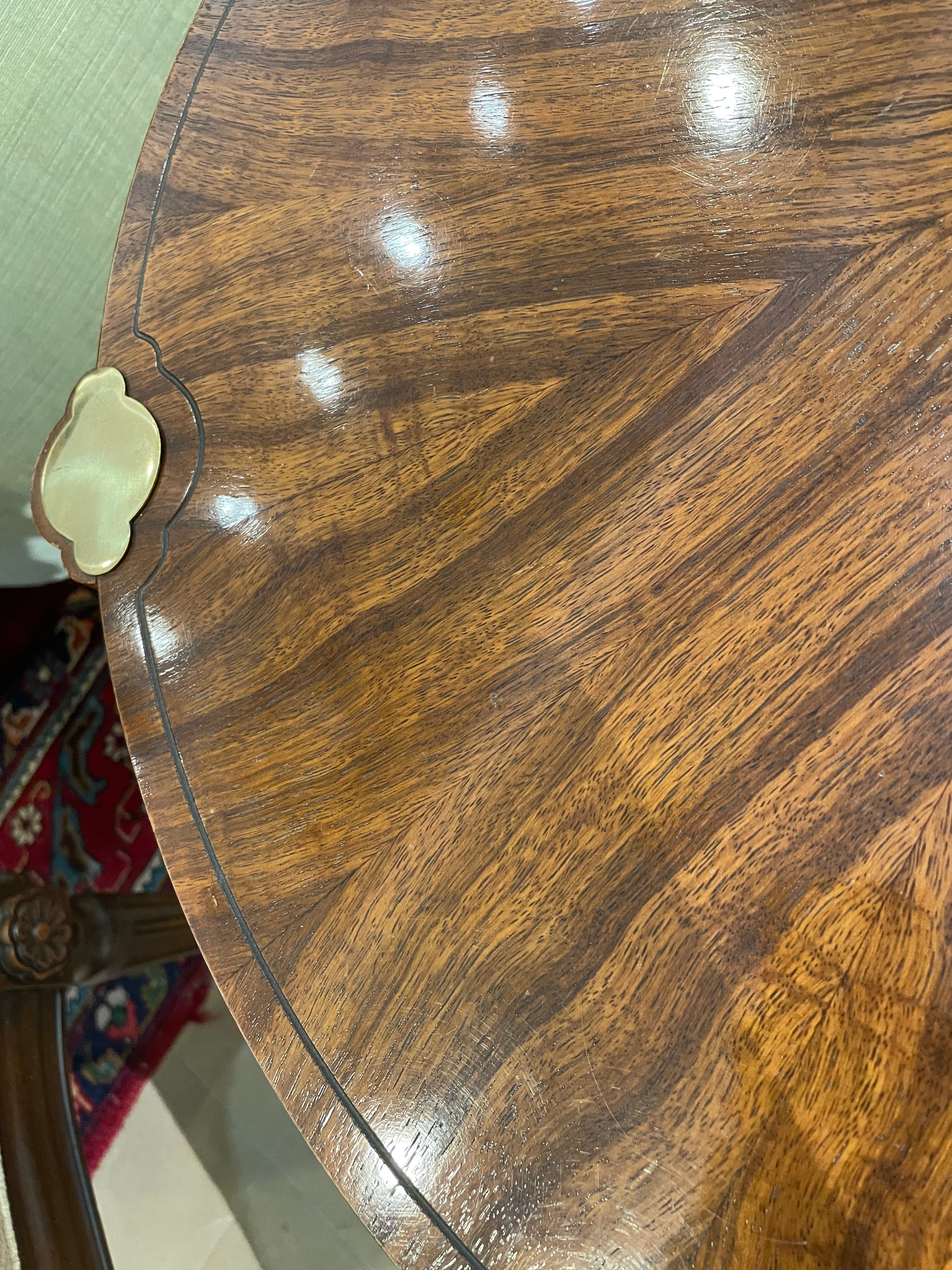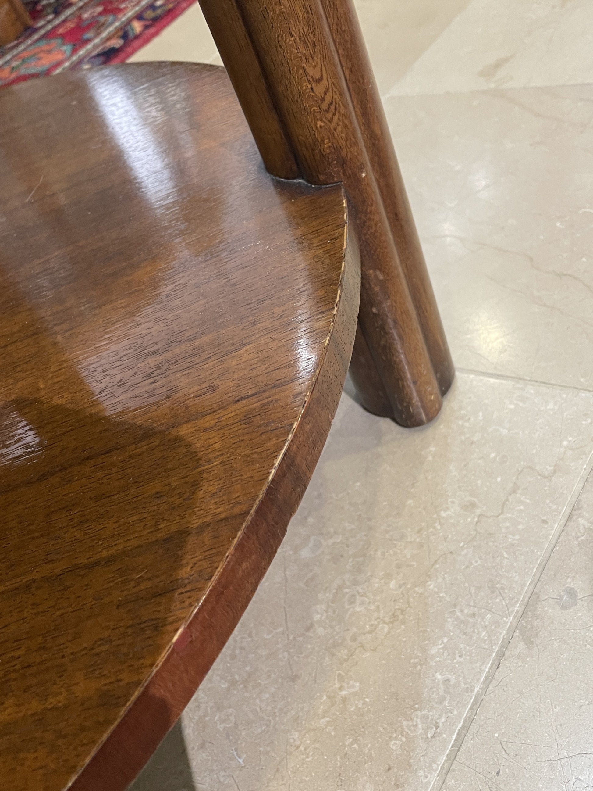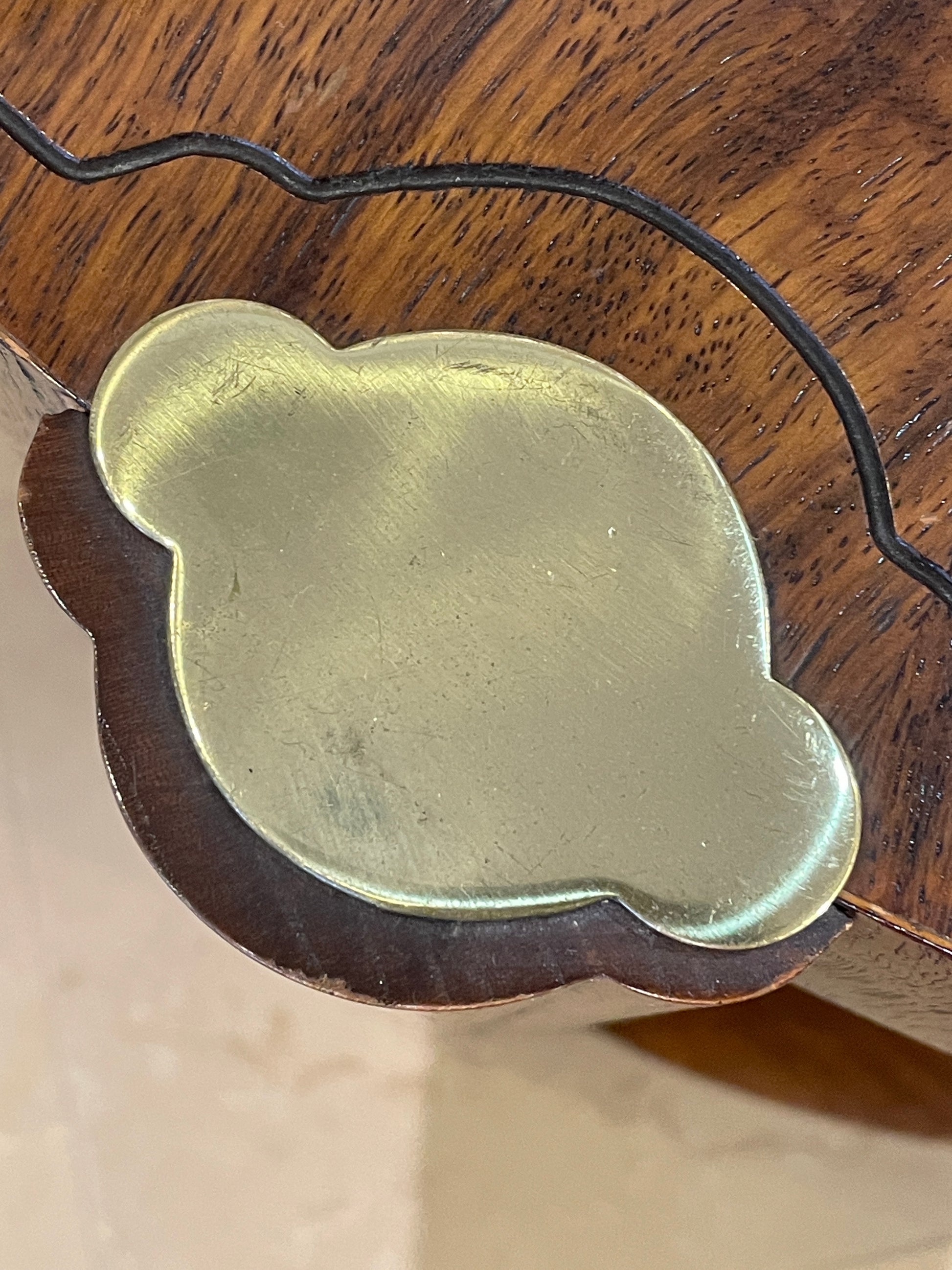 Baker two tier end table with brass clover accents. This art deco end table stands atop four clover shaped legs with shining brass accents at their apex. The mahogany table features two tiers - one thinner one near the base, and a thicker, more sturdy tier on top. Sturdy, stunning, and sleek, this piece would make a great addition to a living space.