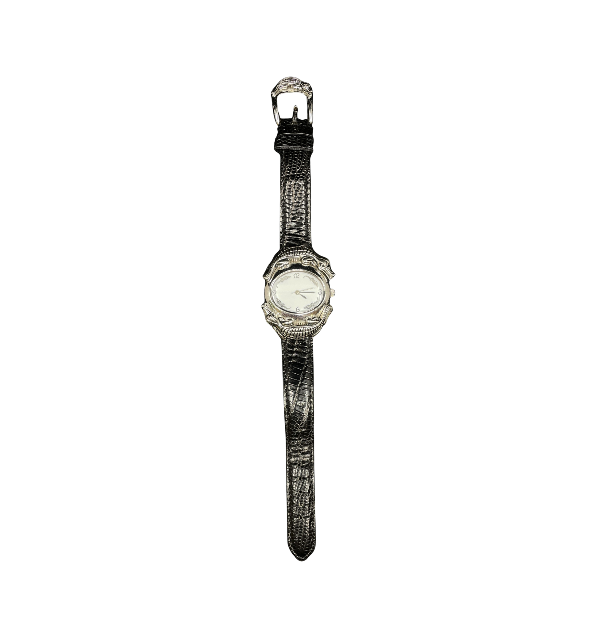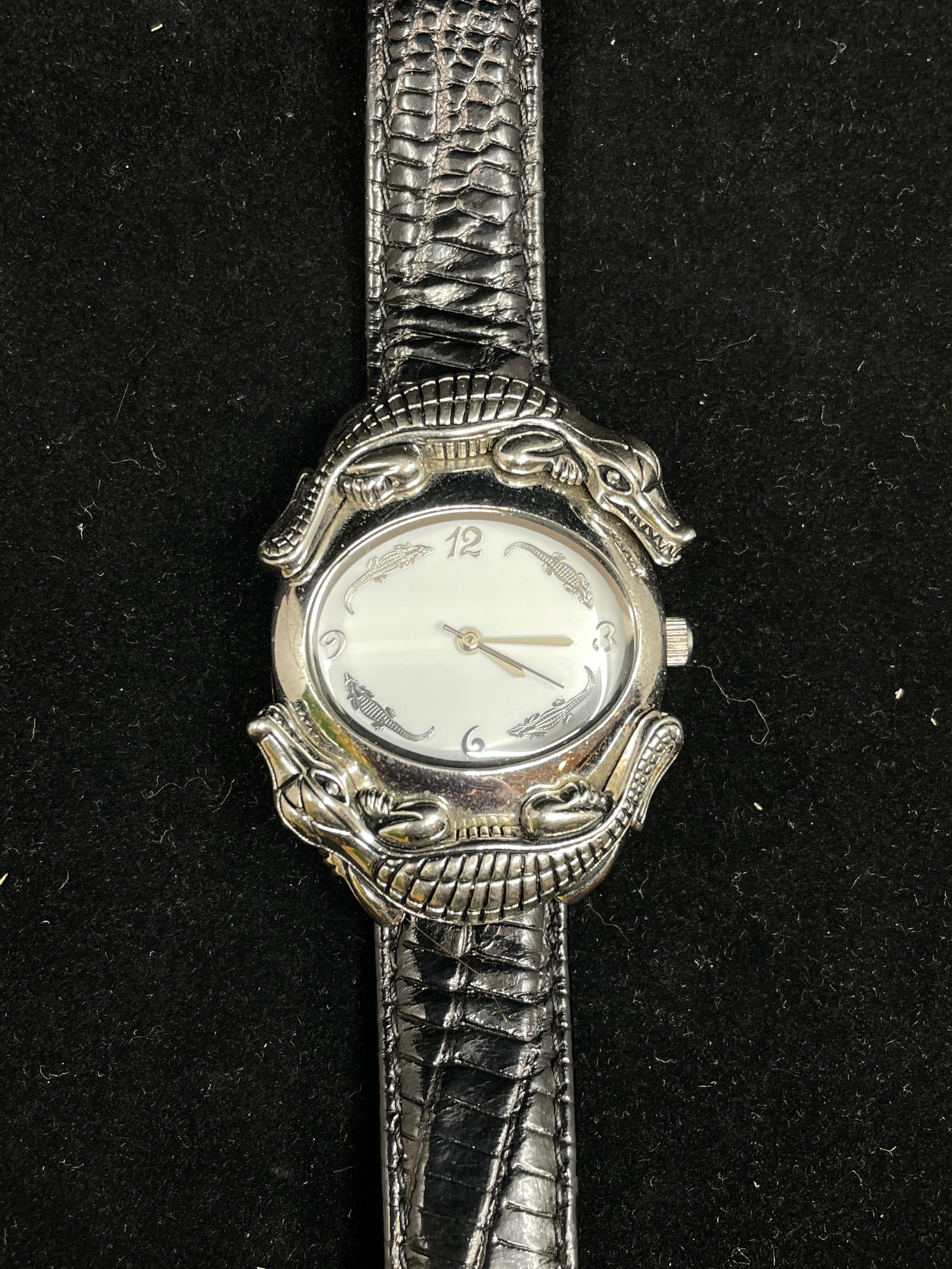 Barry Kieselstein-Cord alligator watch. Marked 925 sterling silver on the back. This charming watch has a reptilian flare throughout! The black genuine leather band has a slight alligator skin texture. The hardware is made of sterling silver and stainless steel. The buckle hardware features an alligator on the uppermost part of the frame. The oval shaped white face of the watch is surrounded by two more alligators, and the face of the watch itself has alligators positioned between the analog hour markings. The hours noted in Arabic numerals are 12, 3, 6, and 9. The clock is powered by a battery-operated quartz-movement. A charming unisex watch perfect for the alligator lover in your life!