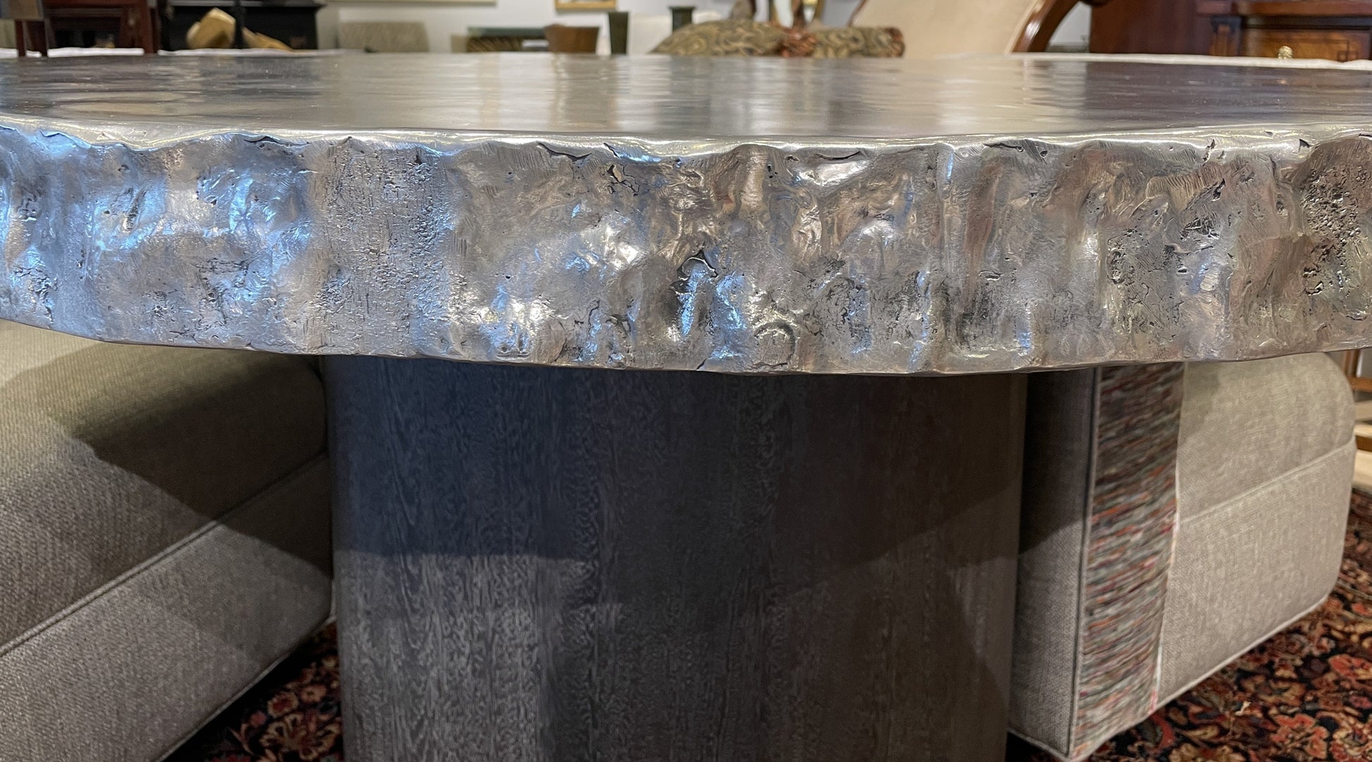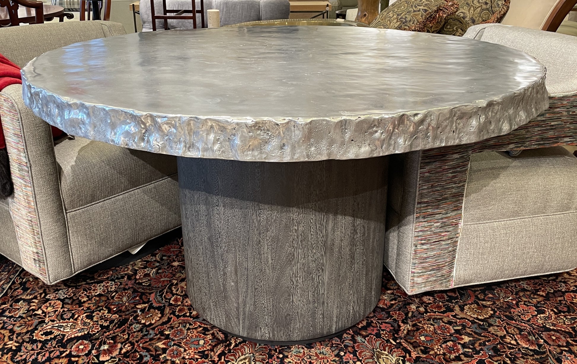 Bernhardt "Cahill" dining table. This beautiful dining table features a base crafted from suar wood and an aluminum tabletop. The base is cylindrical in shape and full of beautiful woodgrain details. The wood itself has an ashy, medium toned appearance. The tabletop has a textured edge and sleek, shiny top with a slight texture. A gorgeous modern piece that would make a great game table.