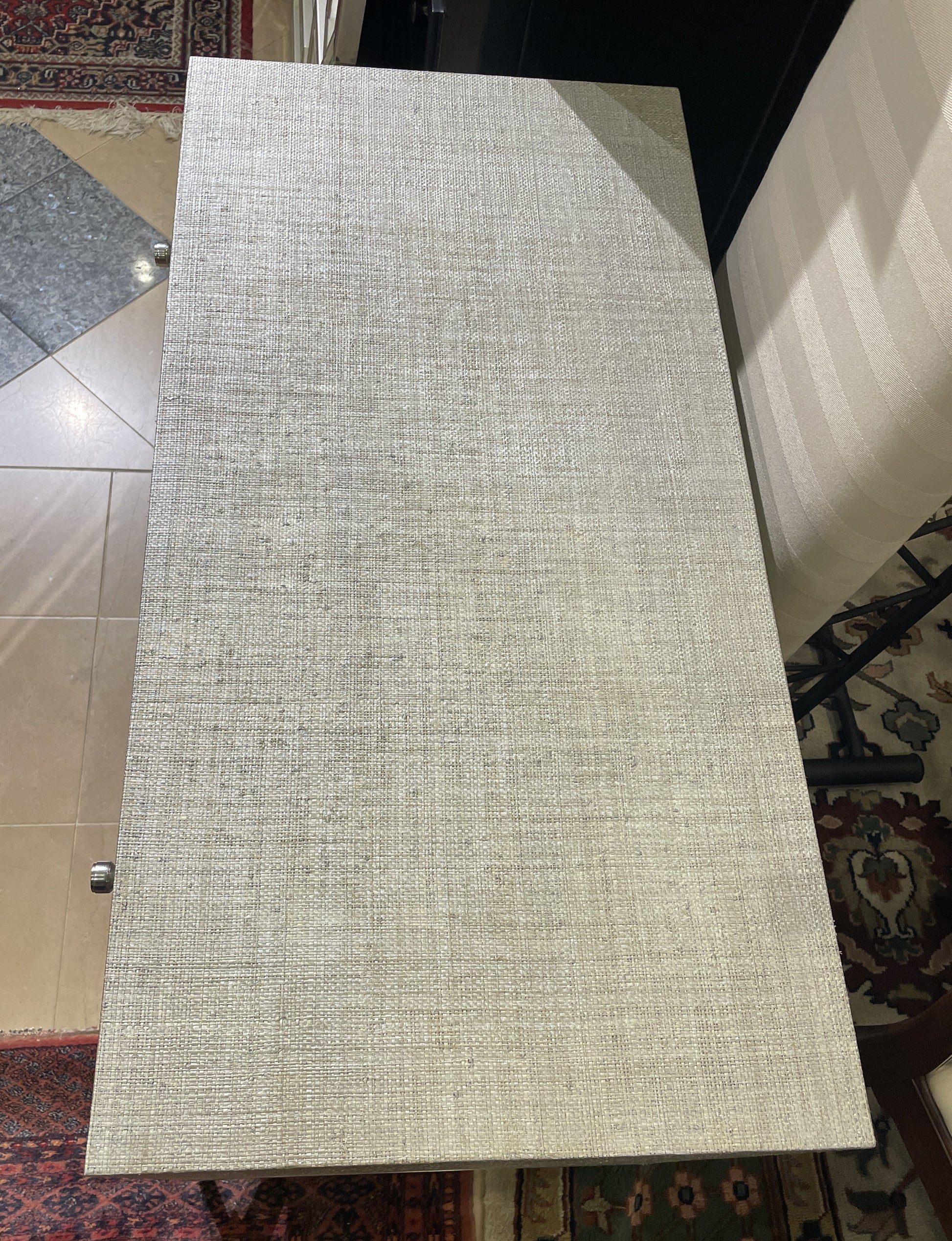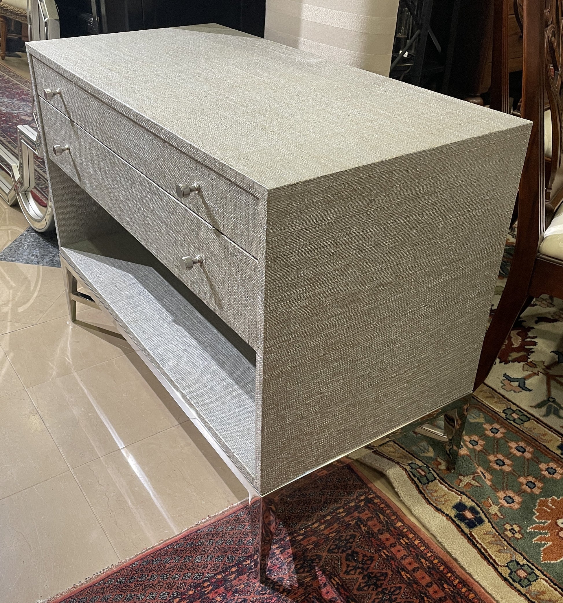 Bernhardt "Saba" grasscloth nightstands, a pair. This beautiful pair of nightstands features a glasscloth exterior in gray. Each nightstand includes two pull out drawers and one compartment for storage. The drawers each have two silver colored cylindrical pull knobs. Each nightstand sits on four silver colored tapered legs that are connected with an X-shaped stretcher. A charming set of nightstands with an eye-catching textured appearance that is sure to add modern flare to any space.
