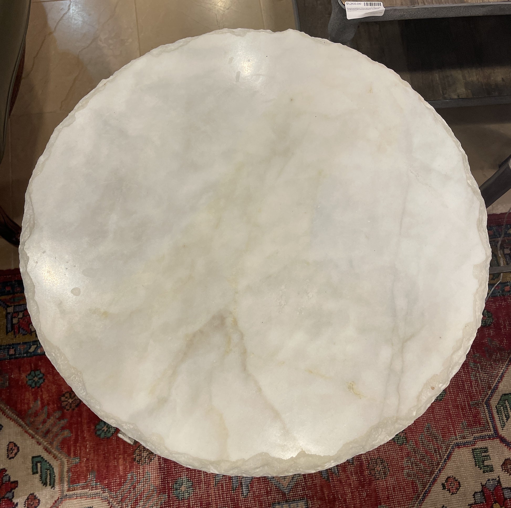 Bernhardt "Hadera" stone top accent table. Hammered steel and white alabaster marble are the key materials to this elegant table. The hammered steel pedestal base sits on three short feet. Atop the base sits the gorgeous circular alabaster marble tabletop that is almost pure white with subtle gray marbleization that ever so slightly peeks through. The edge of the tabletop has an organic shape, as if it has not been touched since taken from the earth. The top of the tabletop has a smooth, glossy finish. A modern little table full of character of charm.