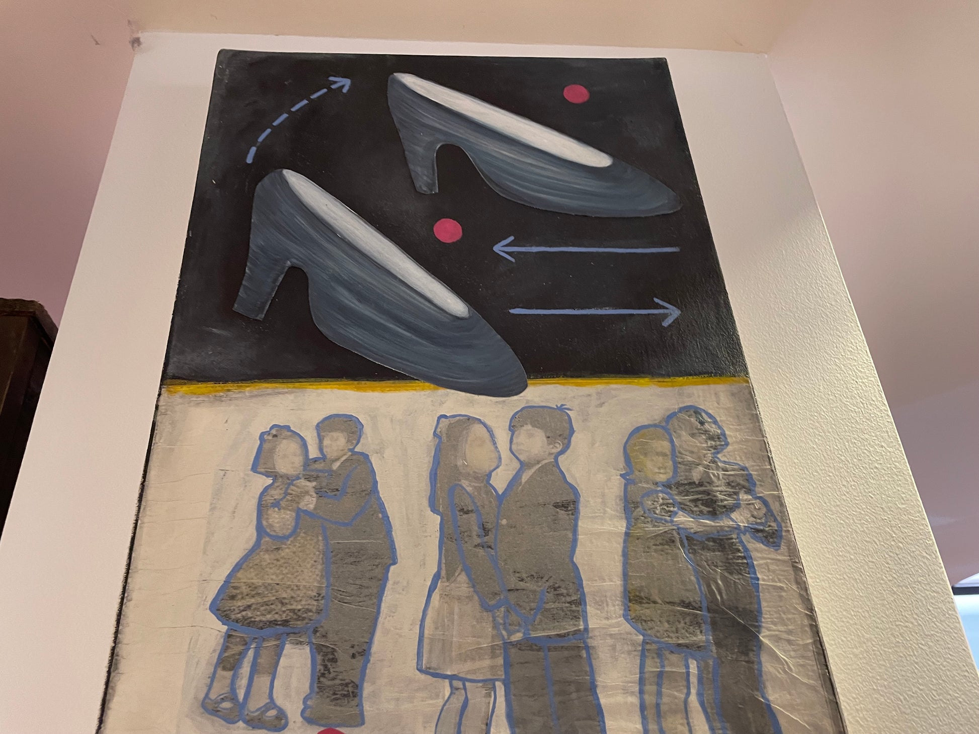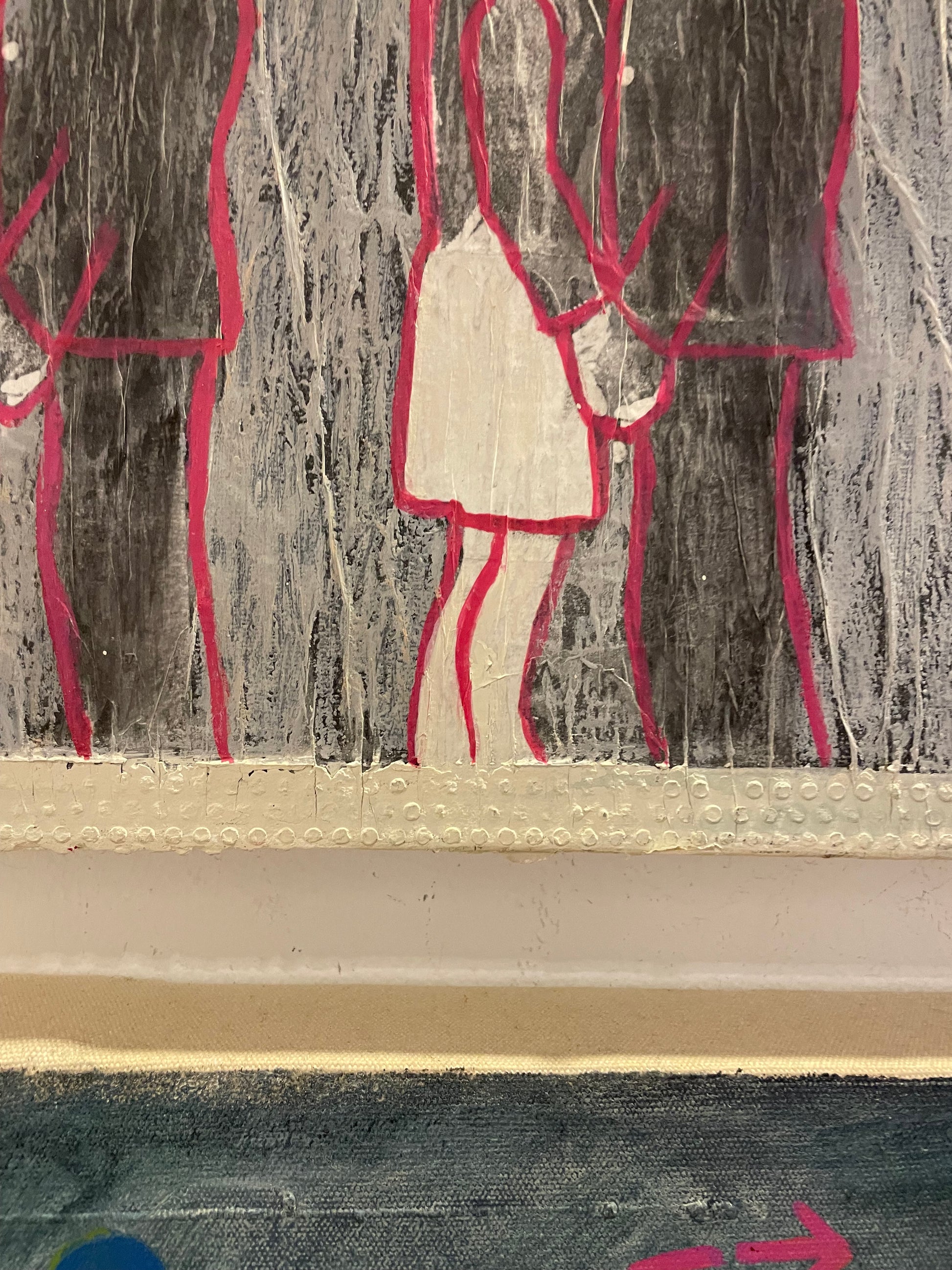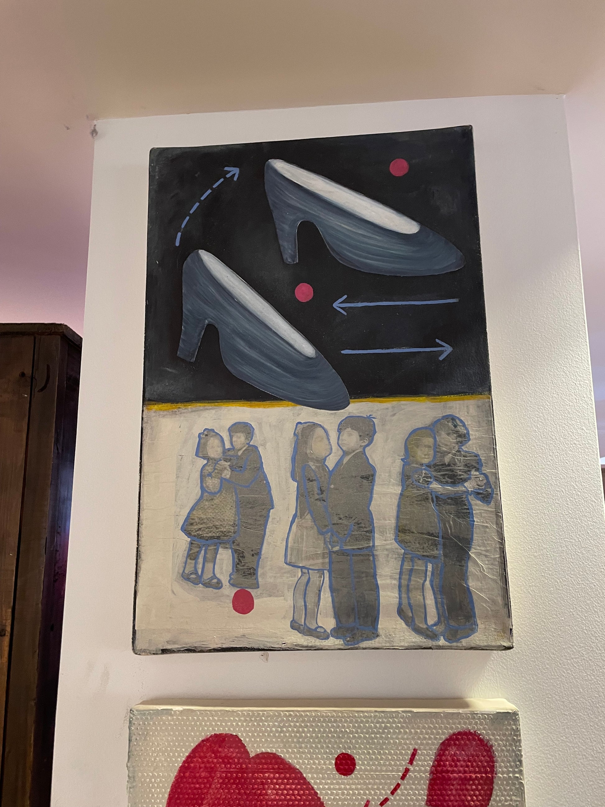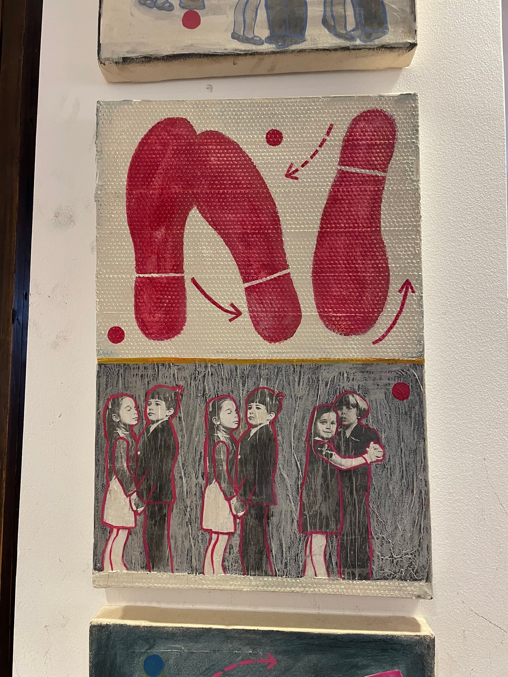 Set of three mixed media art pieces by award-winning artist Betsy Lester. Each piece depicts dancers and their corresponding foot movements, coming together to illustrate a series of dance instructions Features red, pink, blue, and grey/black tones. Pieces are from Lester's Cotillion Series circa 2003.
