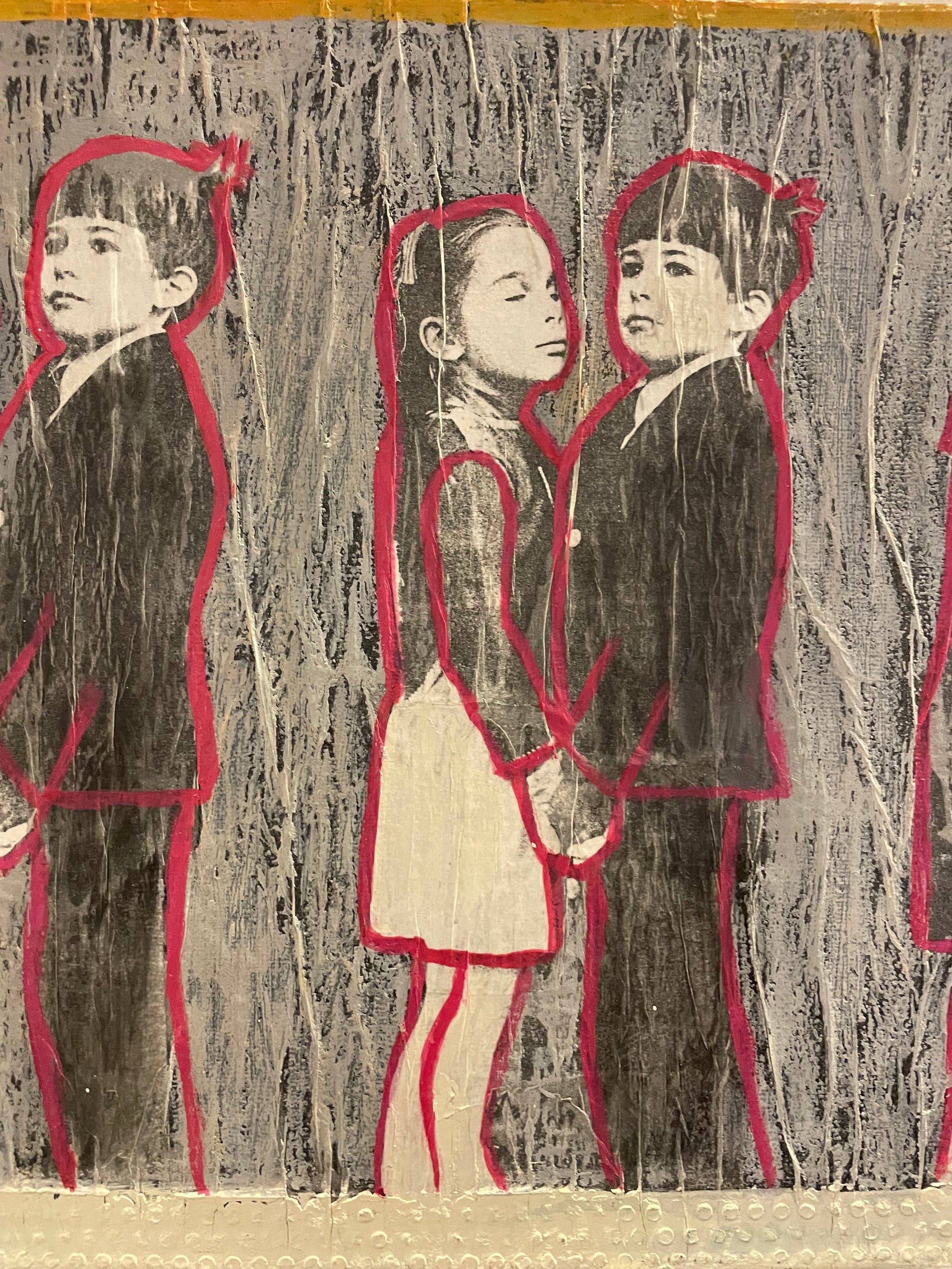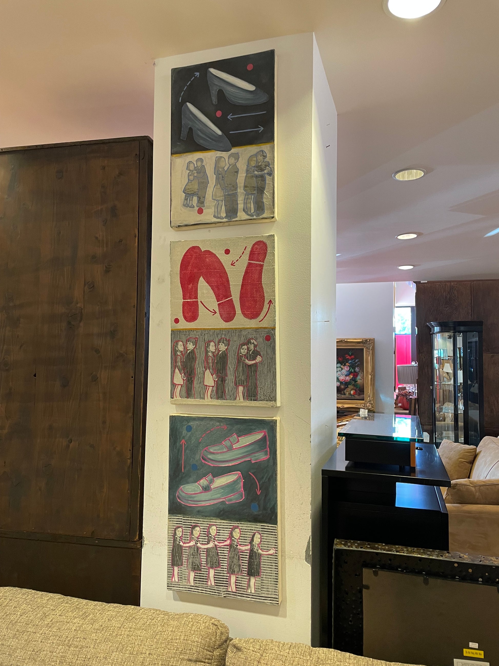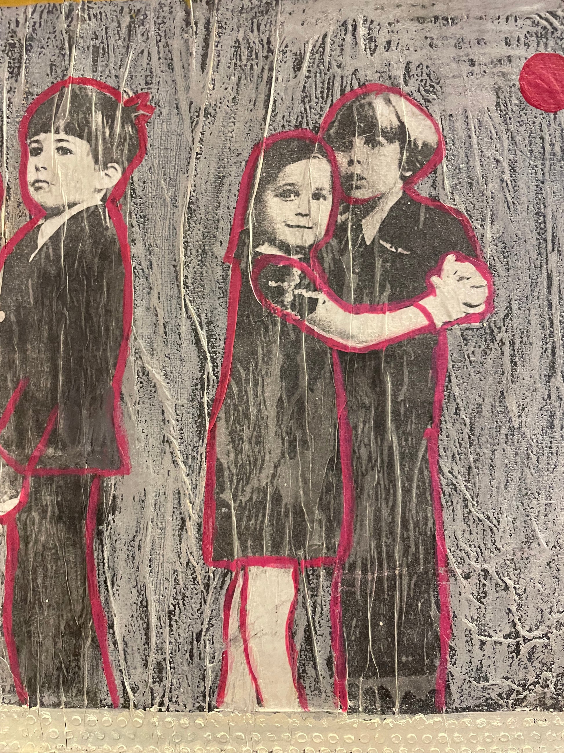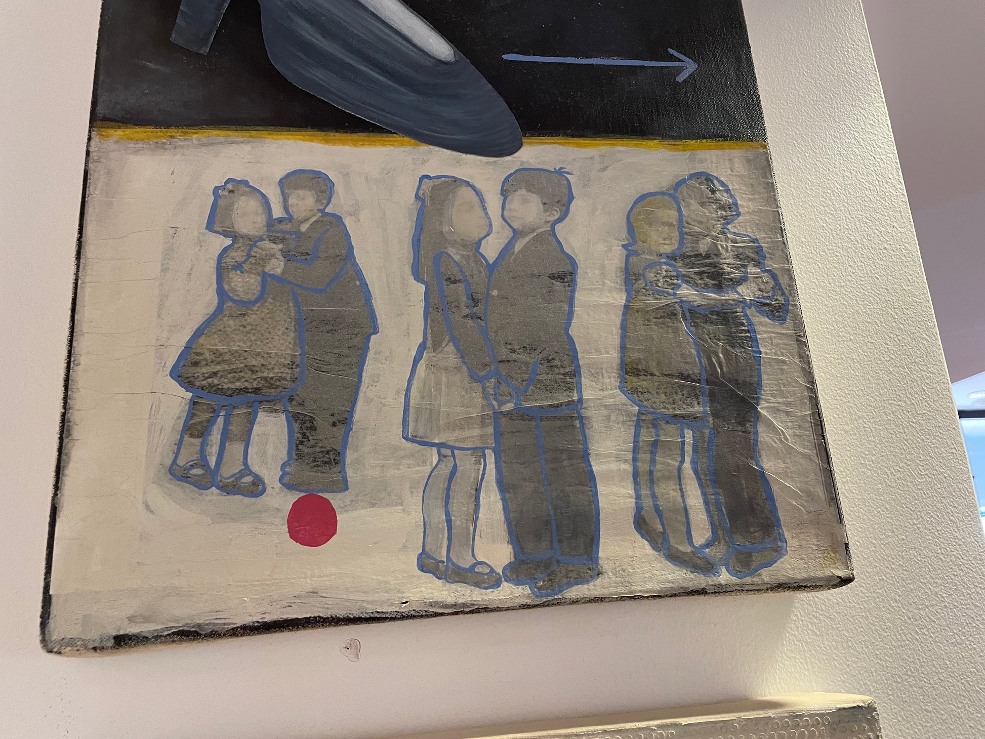 Set of three mixed media art pieces by award-winning artist Betsy Lester. Each piece depicts dancers and their corresponding foot movements, coming together to illustrate a series of dance instructions Features red, pink, blue, and grey/black tones. Pieces are from Lester's Cotillion Series circa 2003.
