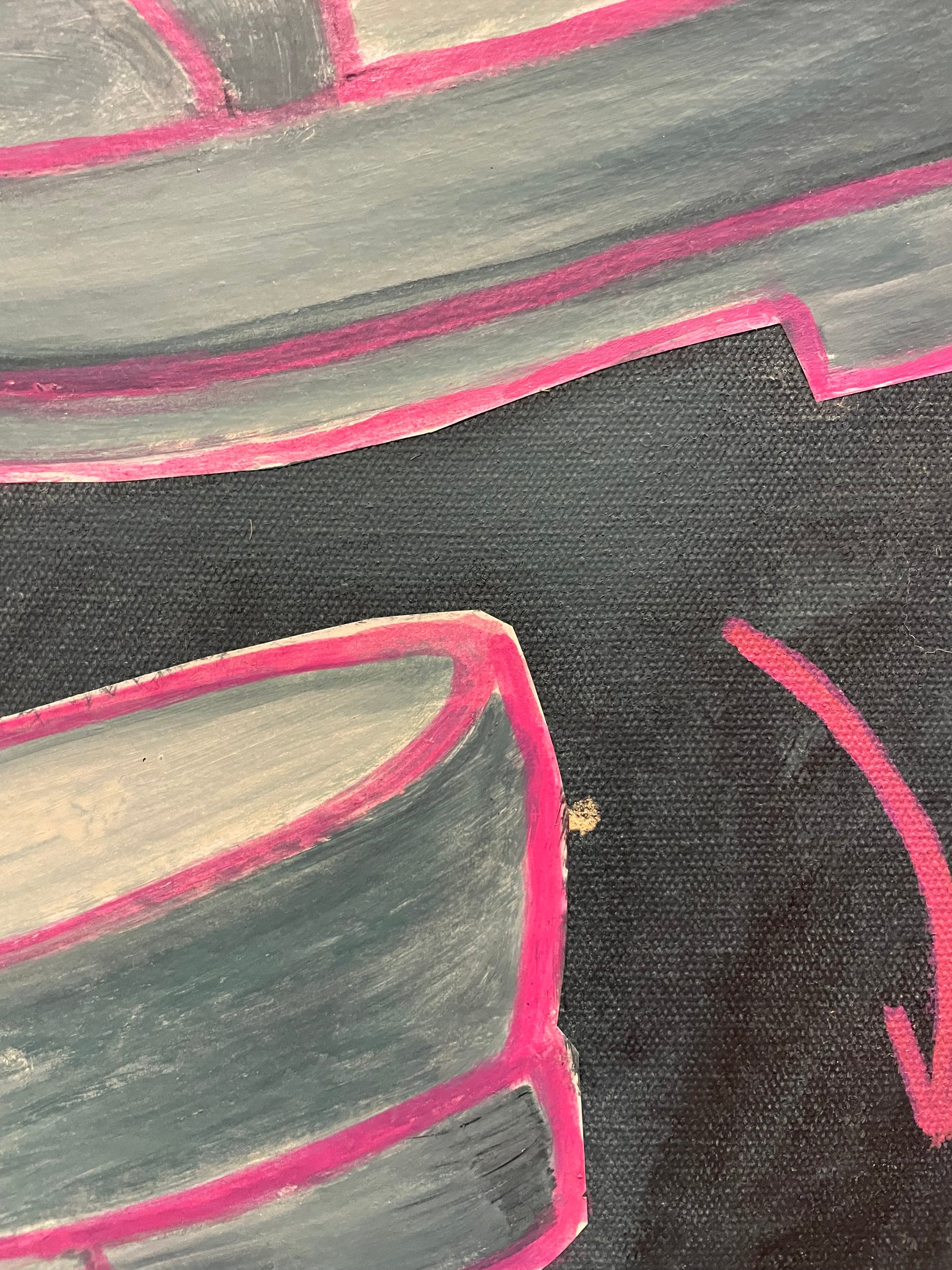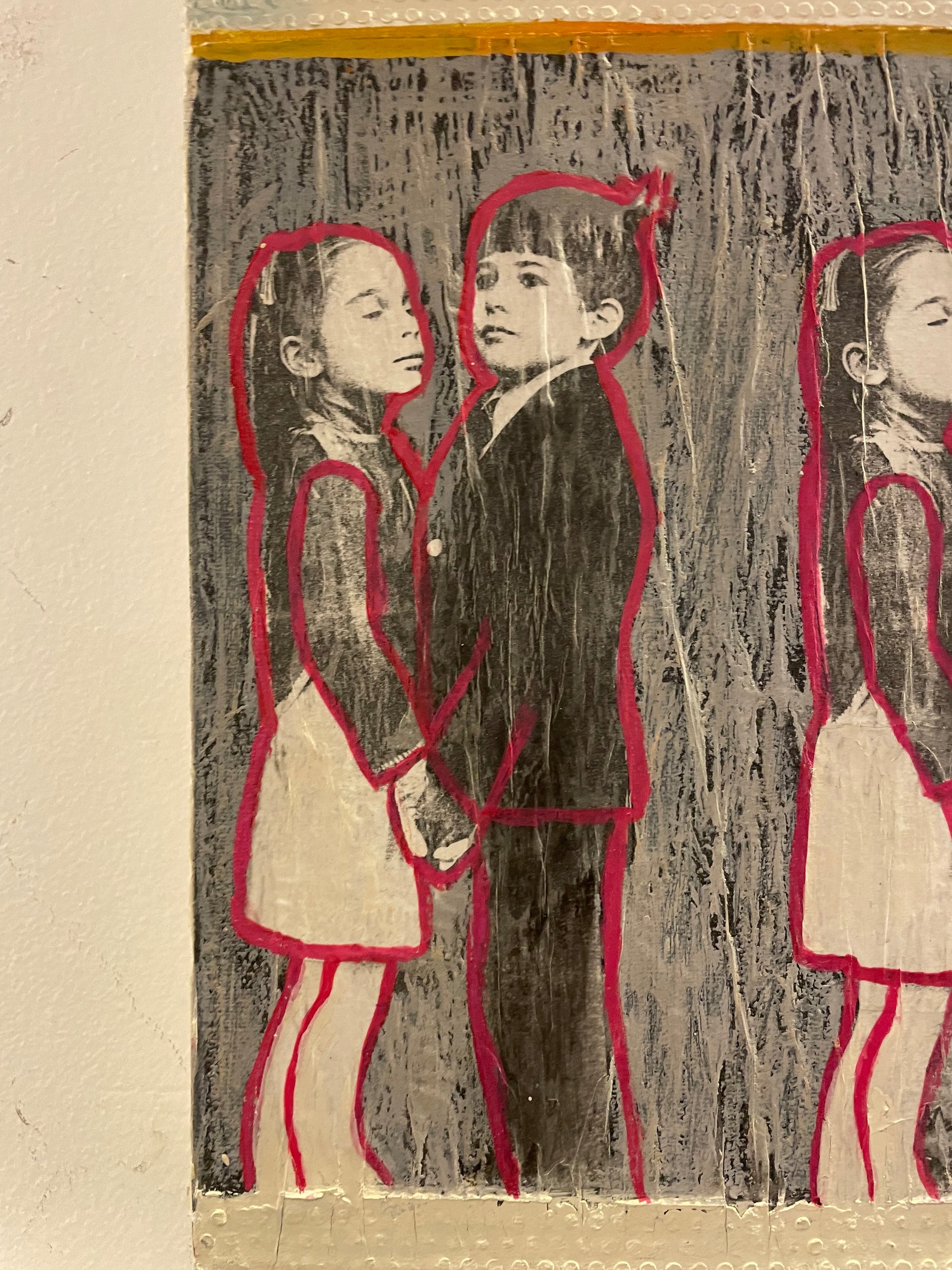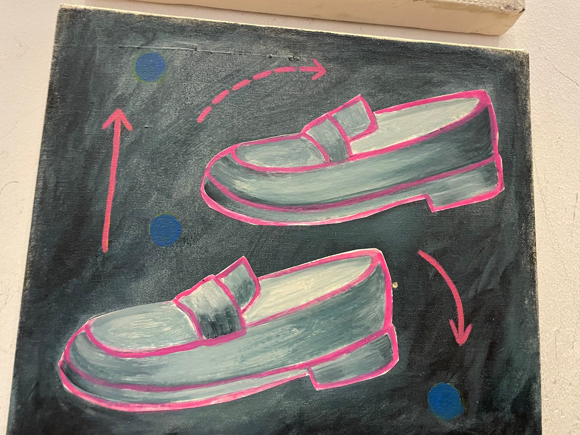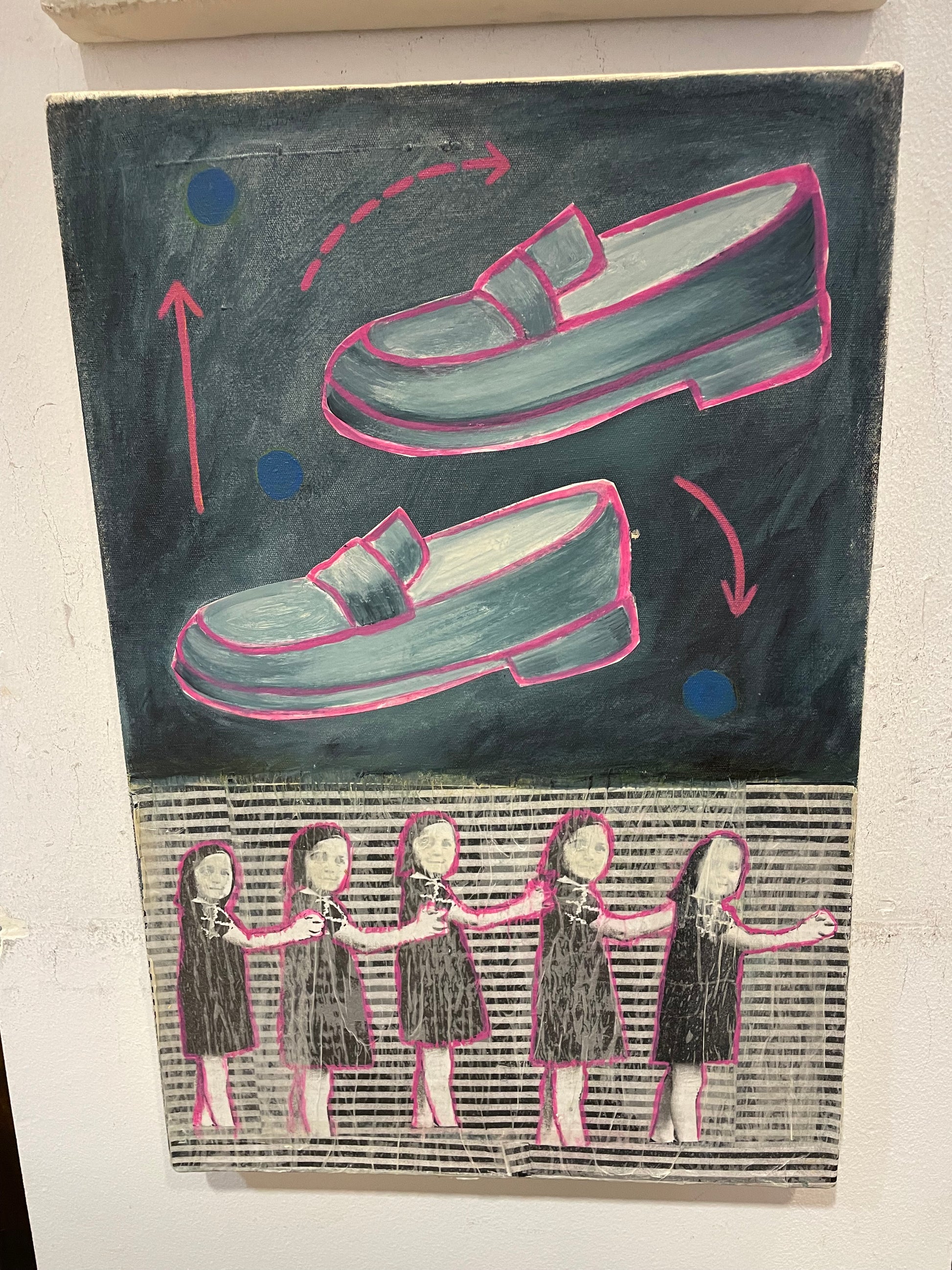 Set of three mixed media art pieces by award-winning artist Betsy Lester. Each piece depicts dancers and their corresponding foot movements, coming together to illustrate a series of dance instructions Features red, pink, blue, and grey/black tones. Pieces are from Lester's Cotillion Series circa 2003.