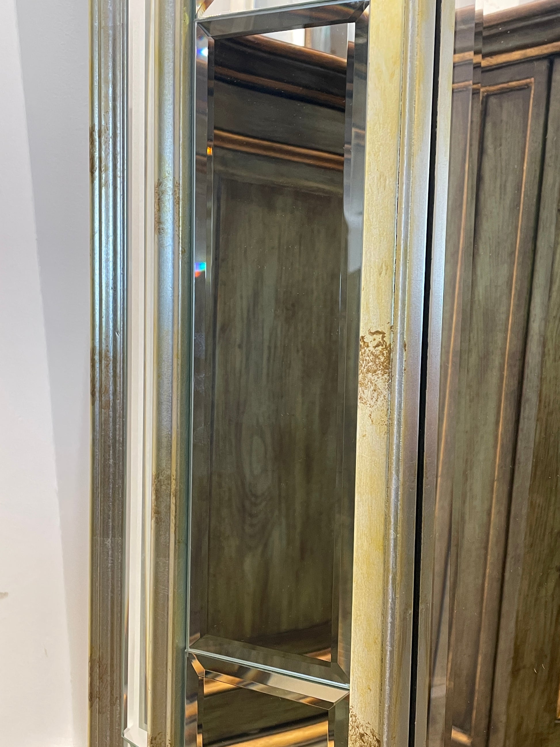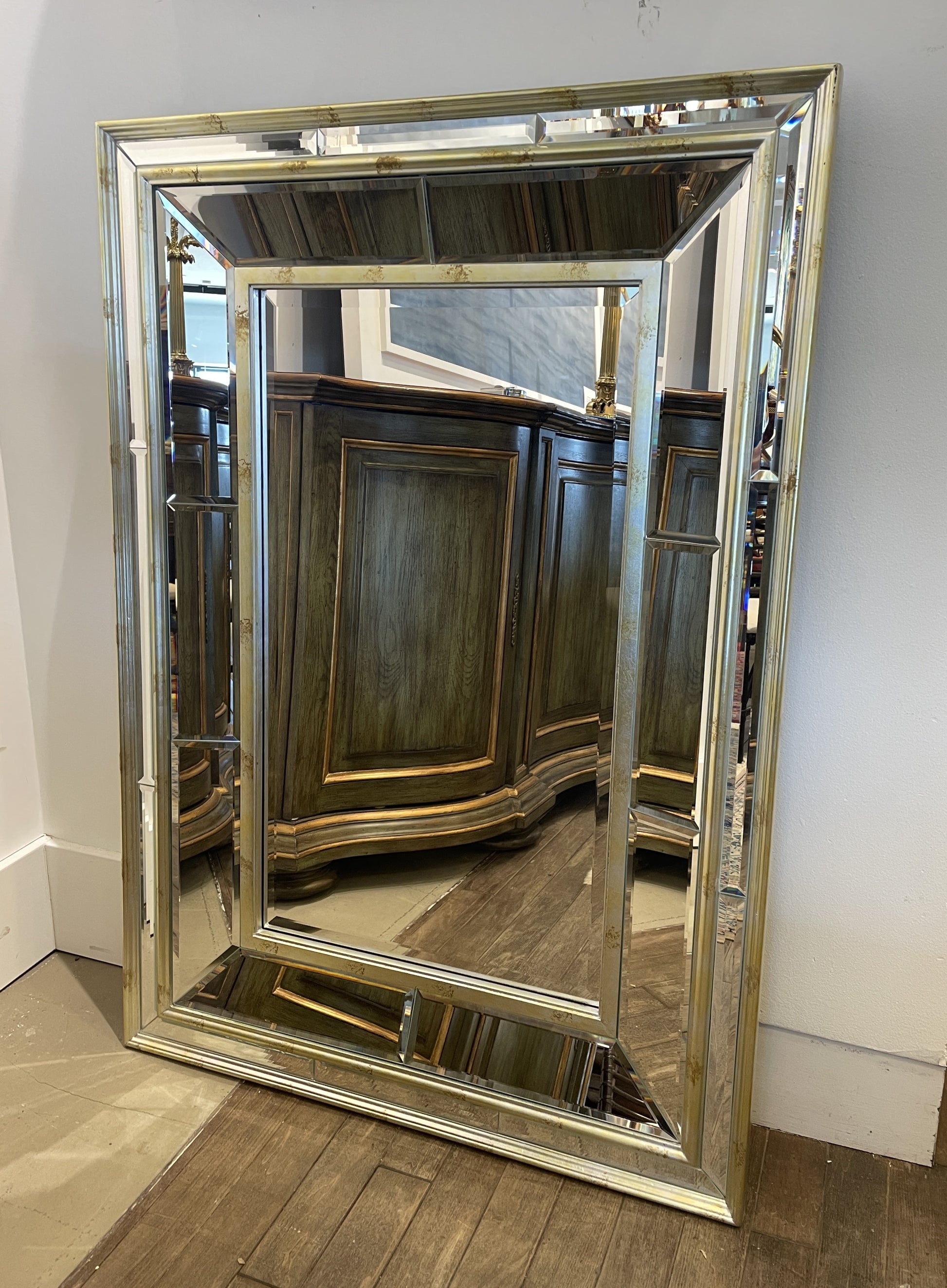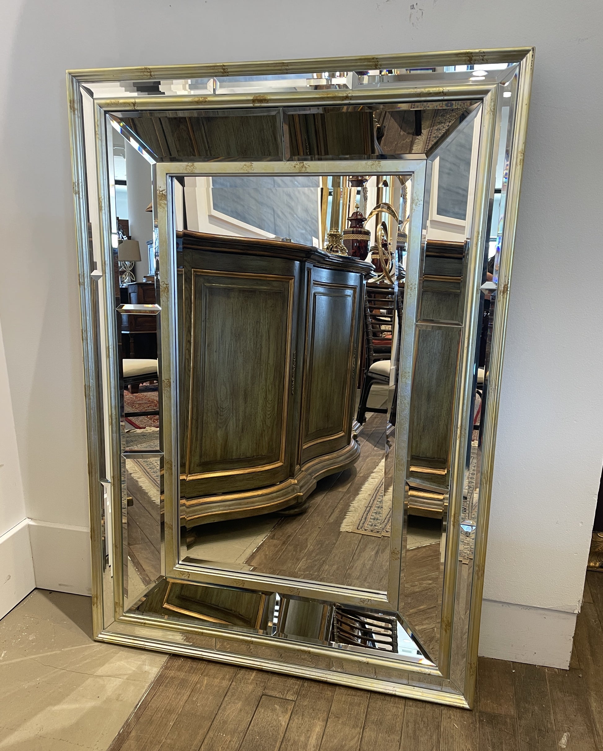Rectangular venetian style mirror. Features a distressed silver and mirrored frame. Each piece is is beveled for an extra touch of elegance.