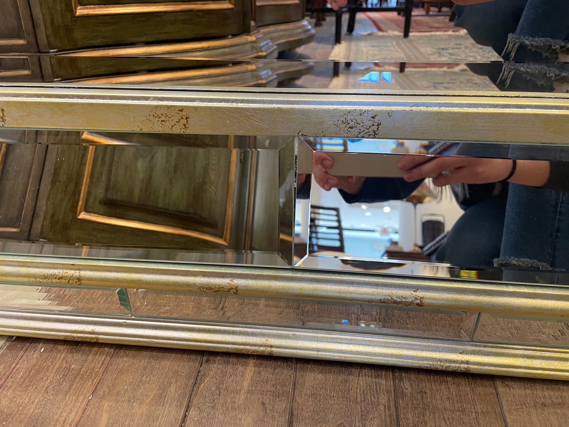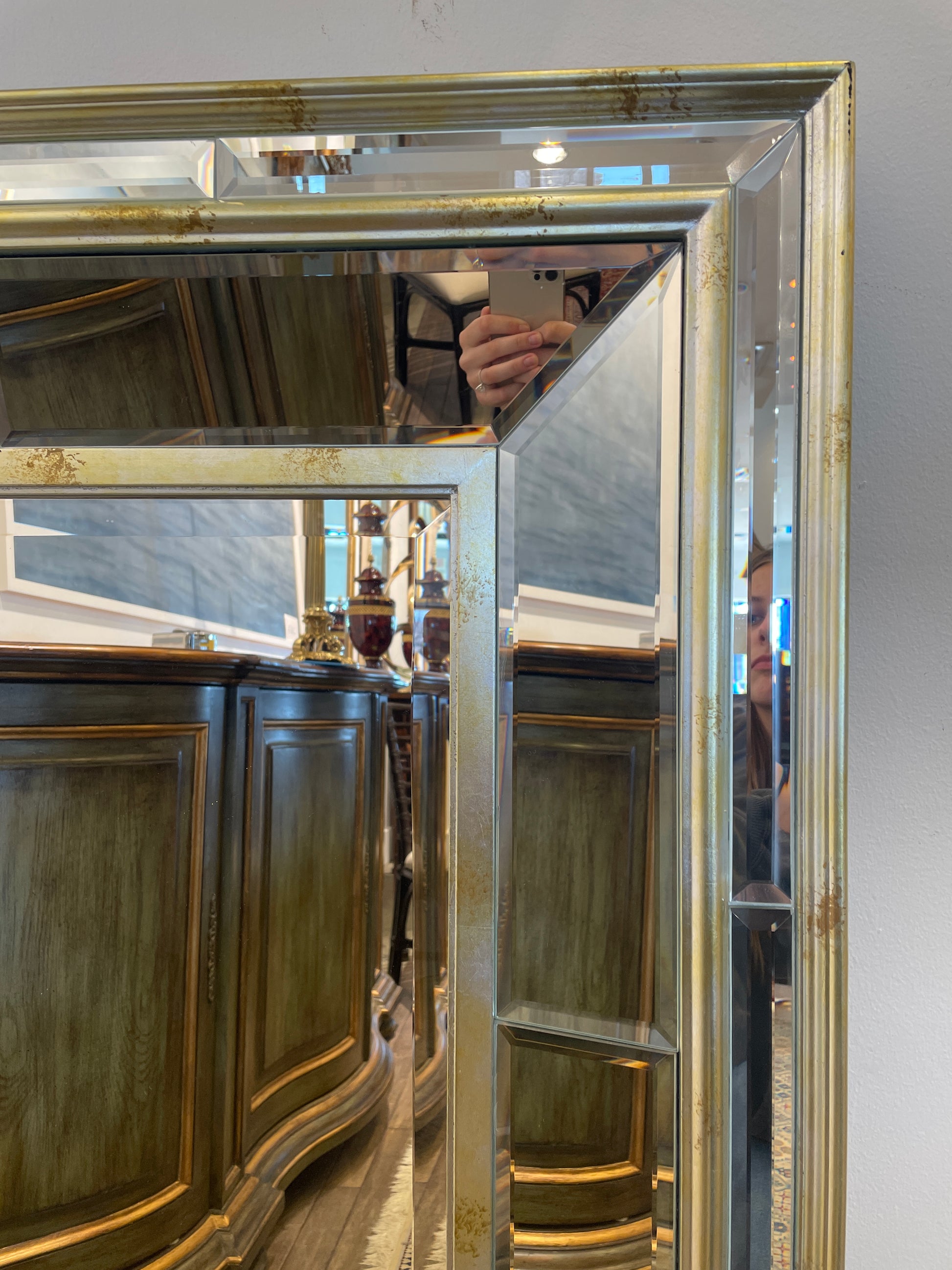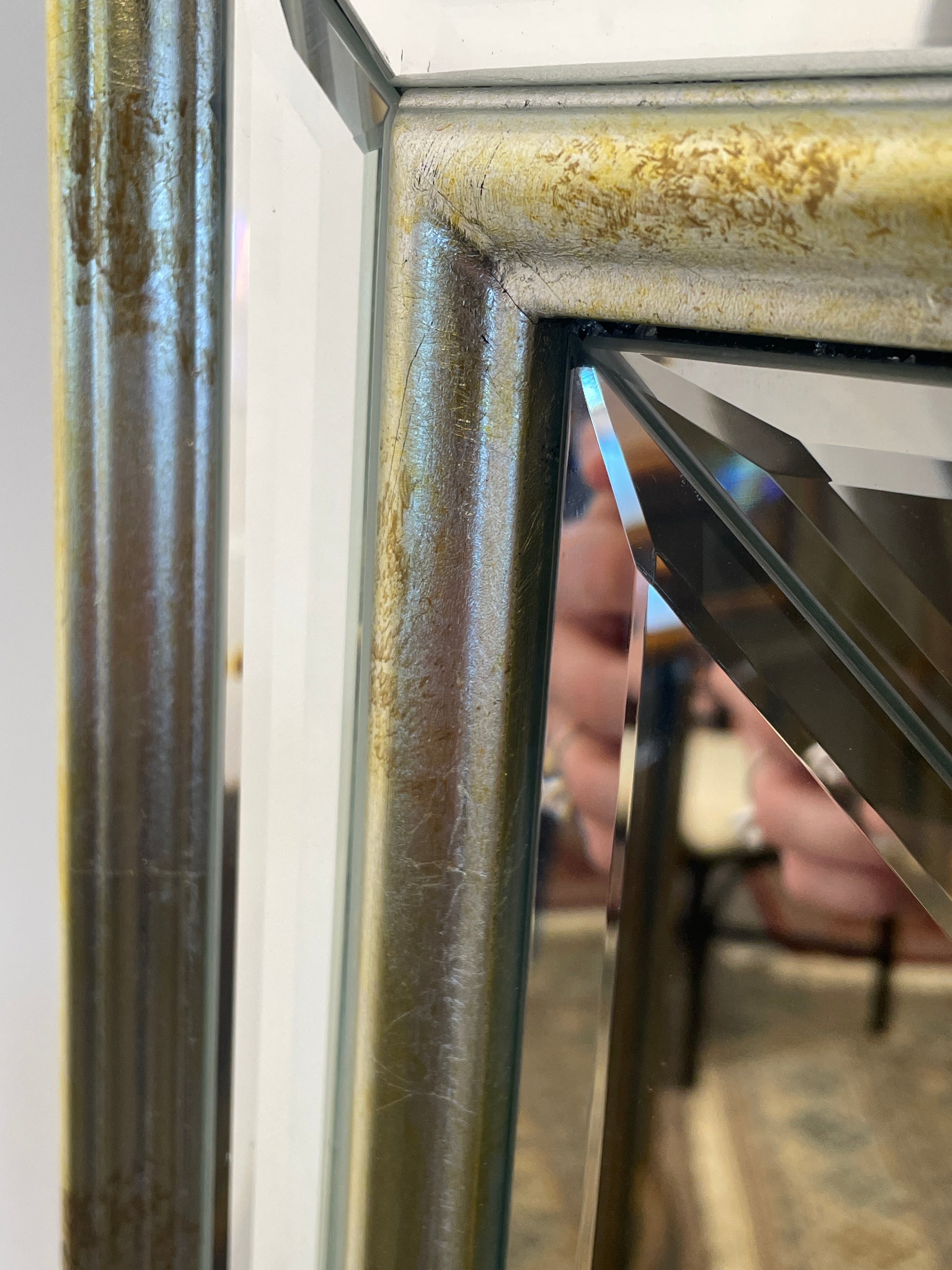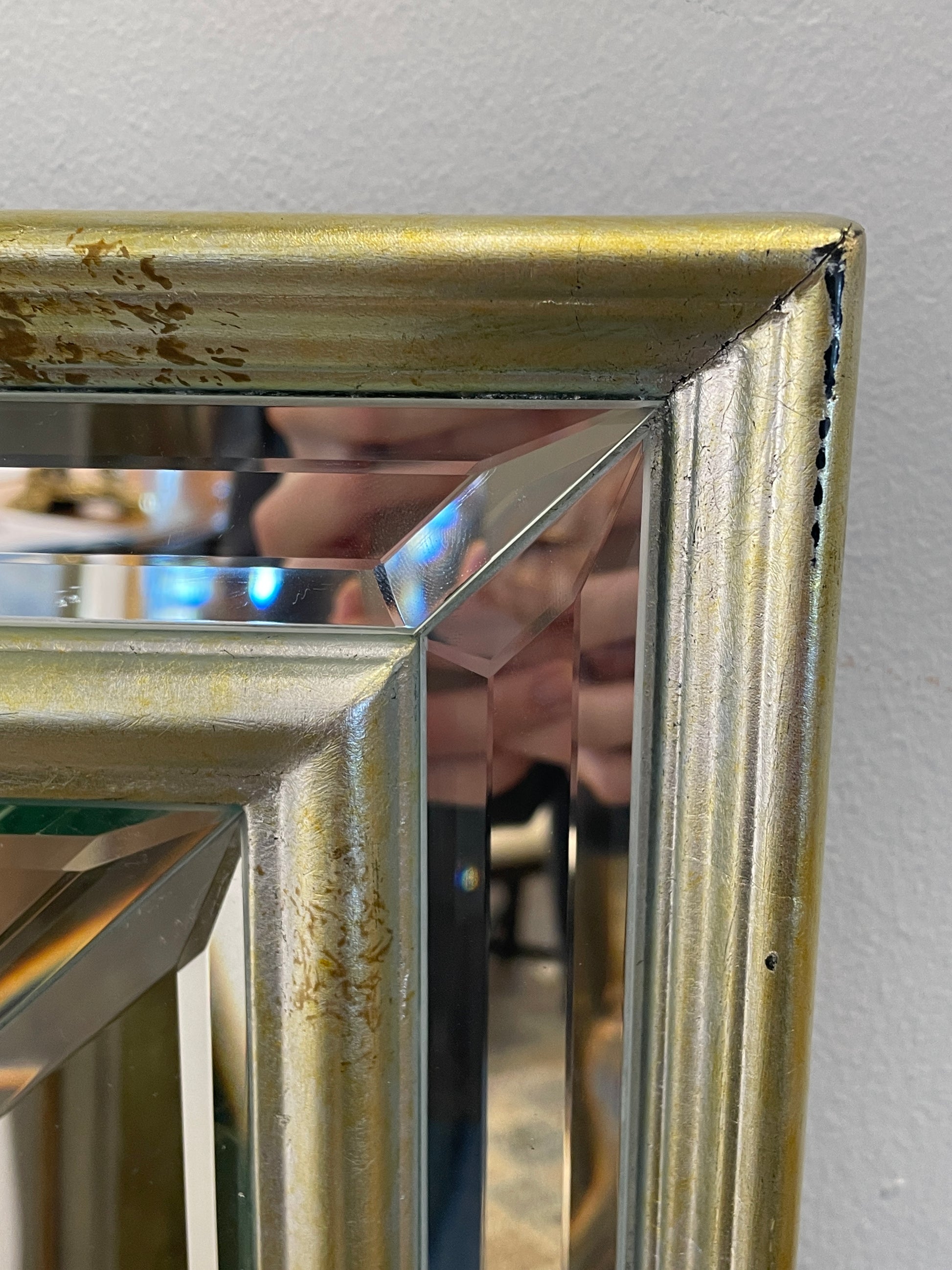 Rectangular venetian style mirror. Features a distressed silver and mirrored frame. Each piece is is beveled for an extra touch of elegance.