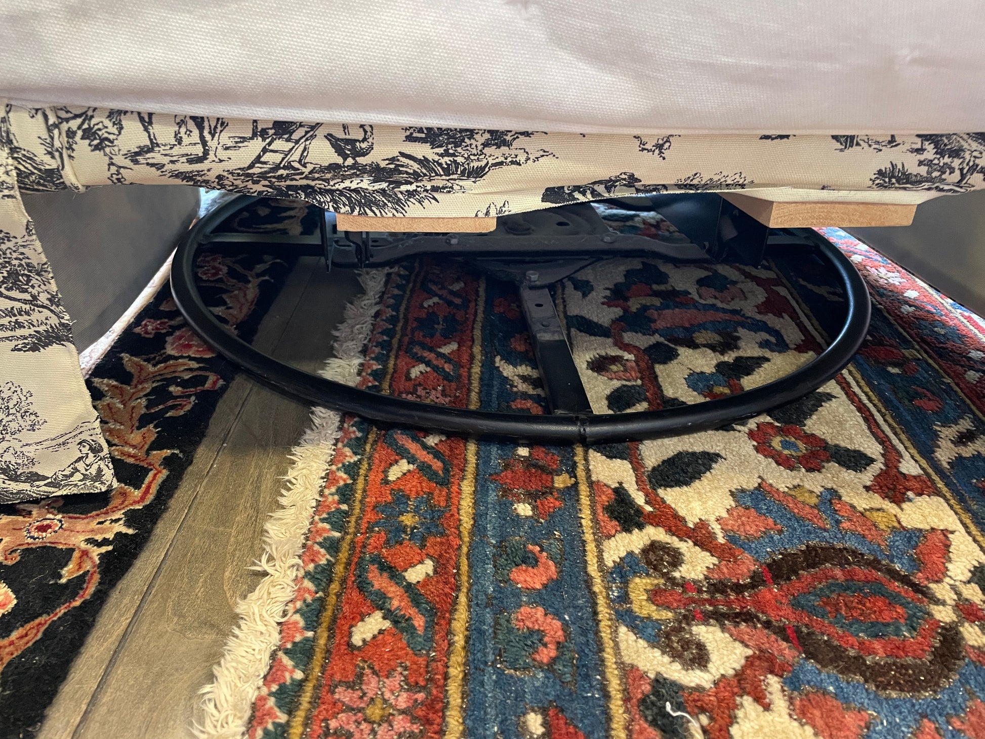 Black toile swivel chair. This gorgeous swivel chair has a traditional shape upholstered with beautiful black toile fabric. The toile depicts a variety of pleasant pastoral scenes including fishing, a chicken coop, and people playing on a see-saw made of logs. The chair has a rounded back and sock arms, which create an inviting silhouette. It has incredibly comfortable cushions made even more appealing with the rocking swivel base. The base is concealed by a charming apron. A lovely accent chair perfect for a traditional space thanks to its comfort and style.