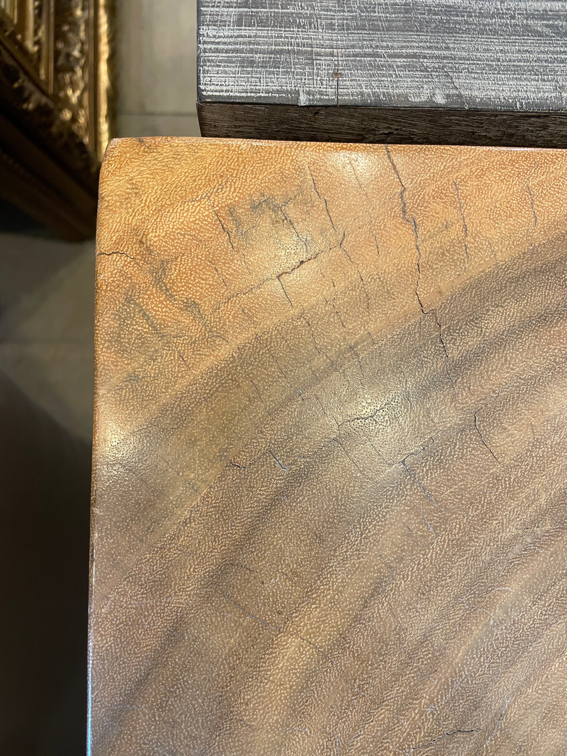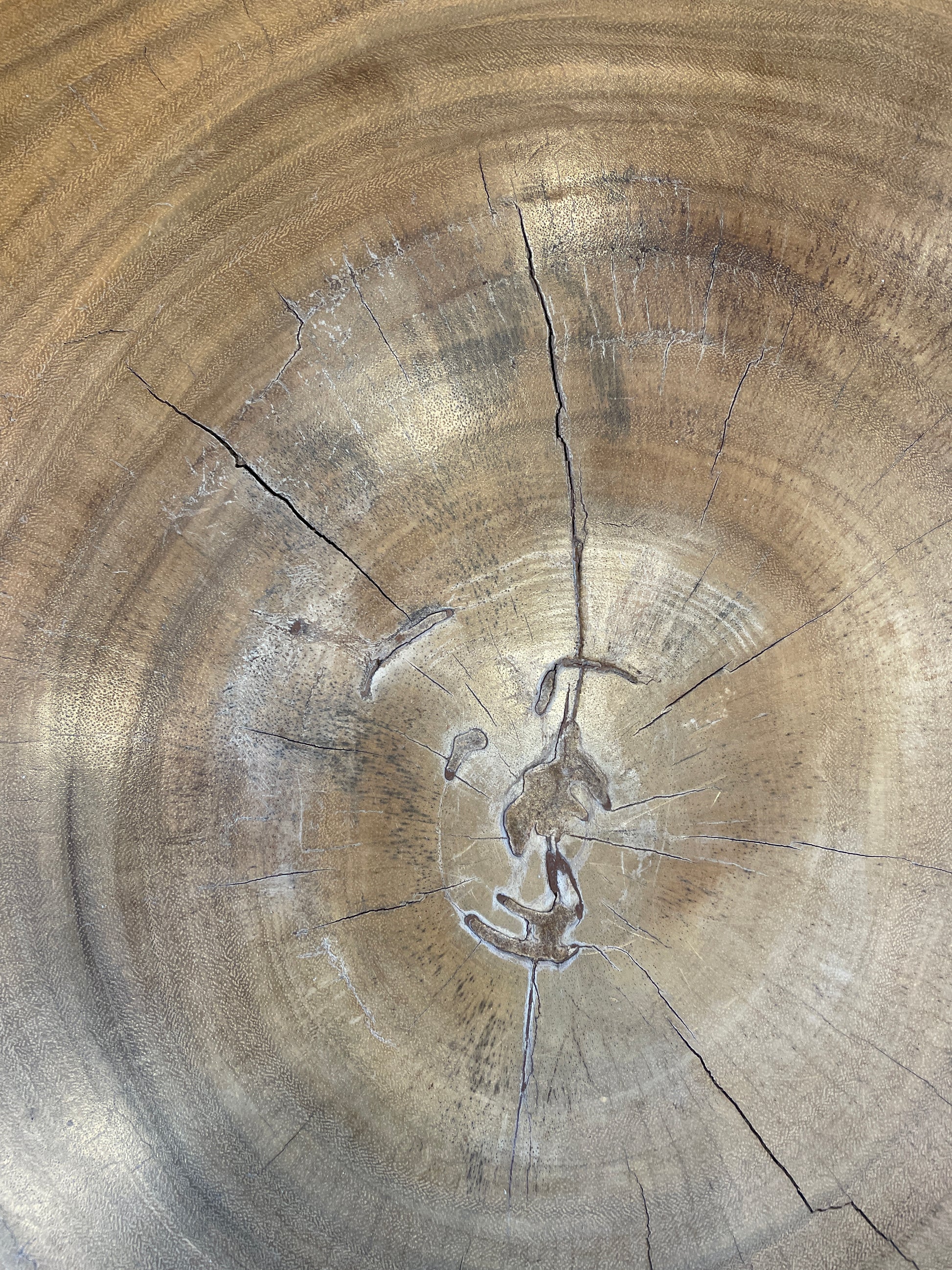 Bo Tree source tamarine block table. This beautiful rectangular table is cut from one stunning piece of light toned tamarine wood. Every side of this piece is organically unique, showcasing its own gorgeous woodgrain pattern. The table sits on four short feet for a subtle elevated look. A beautiful and unique piece with a one of a kind pattern that's sure to elevate a space.