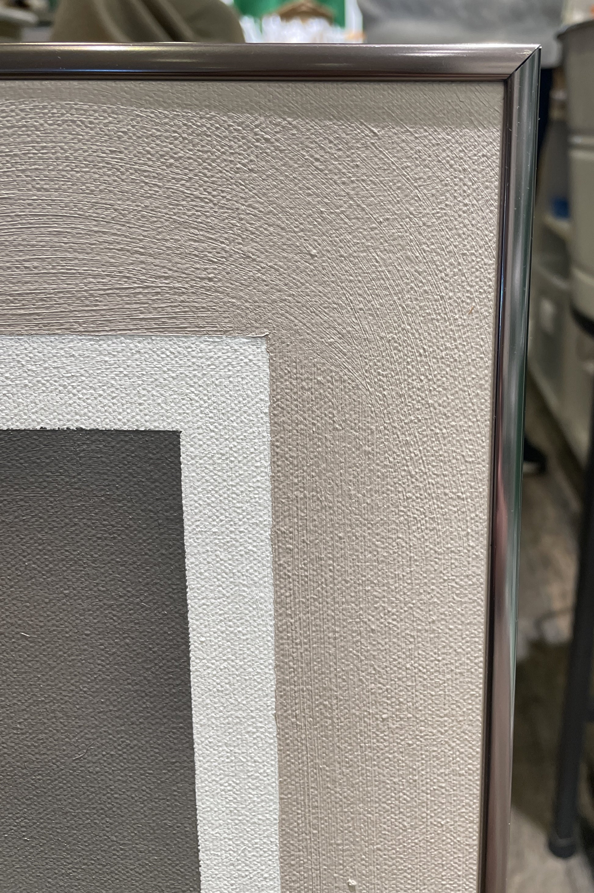 Boats on canvas. Signed lower right, indistinguishable. This serene painting in shades of gray depicts a small fleet of boats on a cloudy day. The piece is held in a thin silver toned frame that complements the gray color scheme beautifully. A charming piece that's sure to add a nautical touch to any space.