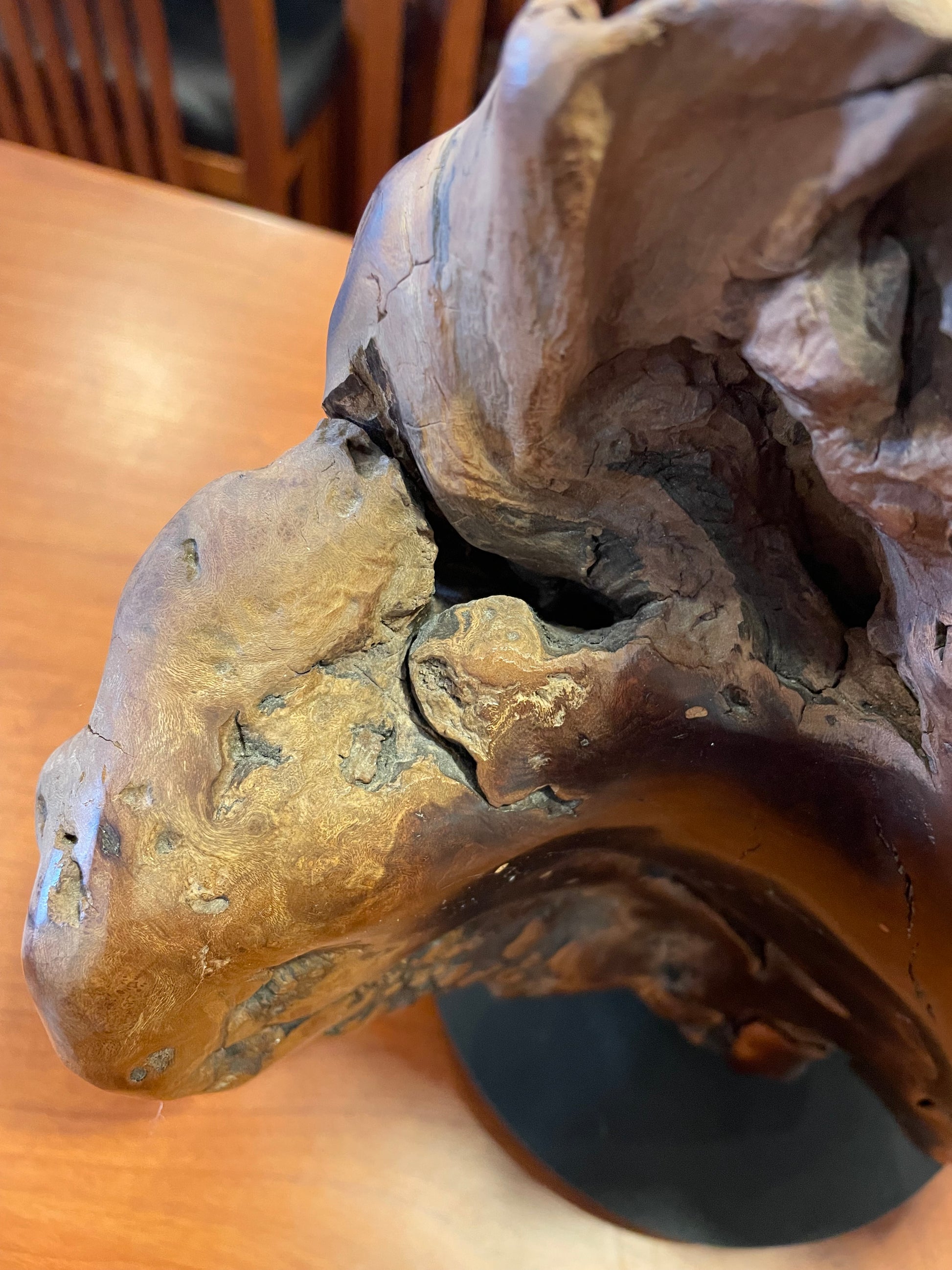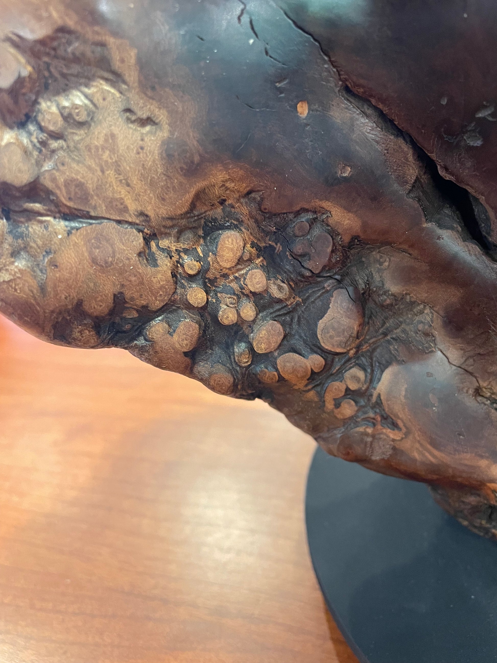 Manzanita wood sculpture by Bob Womack. Features burl wood surrounding a rock at the top. It sits on a turning base. Bob's work is recognized for its blend of natural and designed forms, smooth and textured surfaces, meticulous finish, and the use of unusual domestic hardwoods. His technique involves a chainsaw and bandsaw to establish a rough form and smaller abrasive tools for more refined carvings.