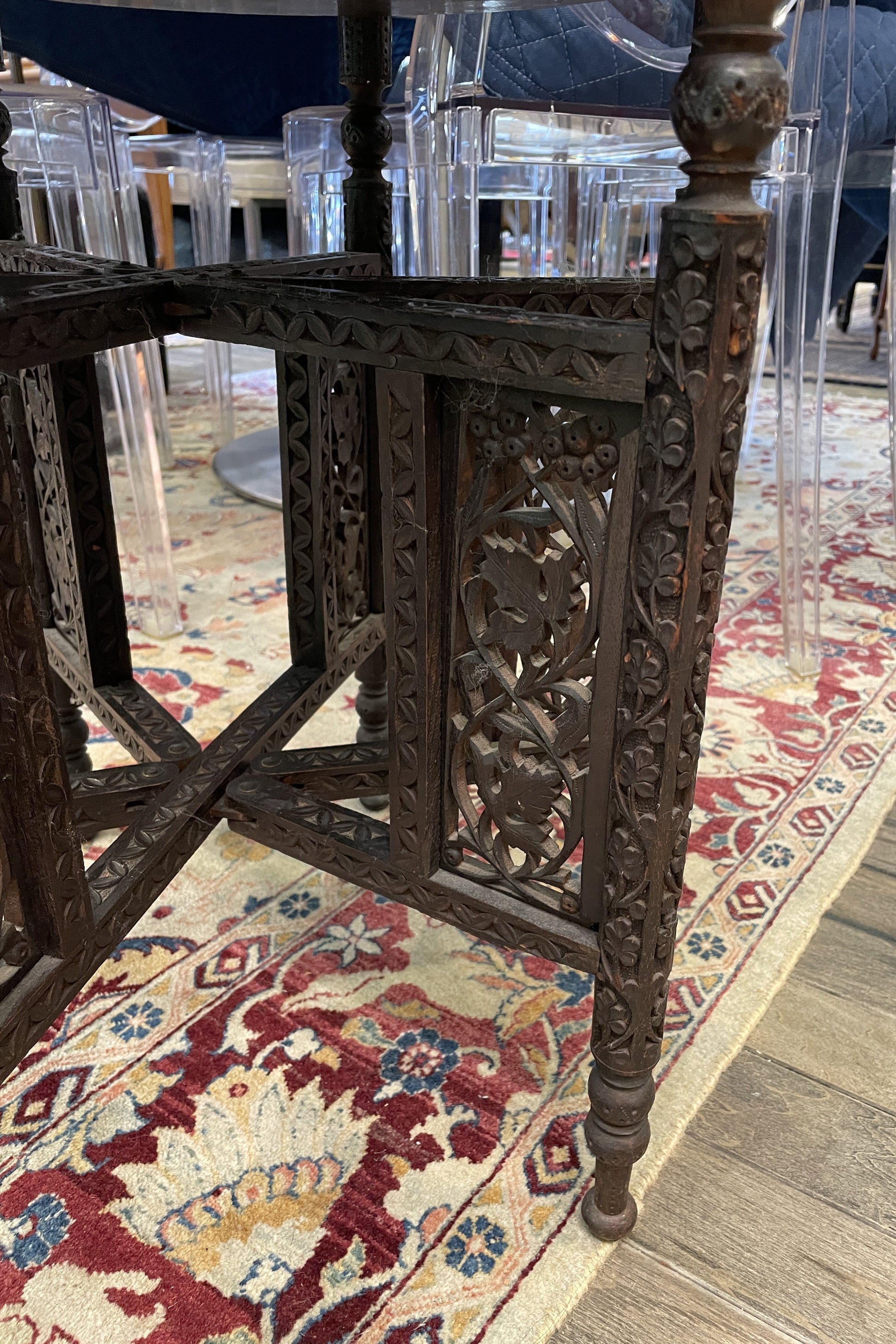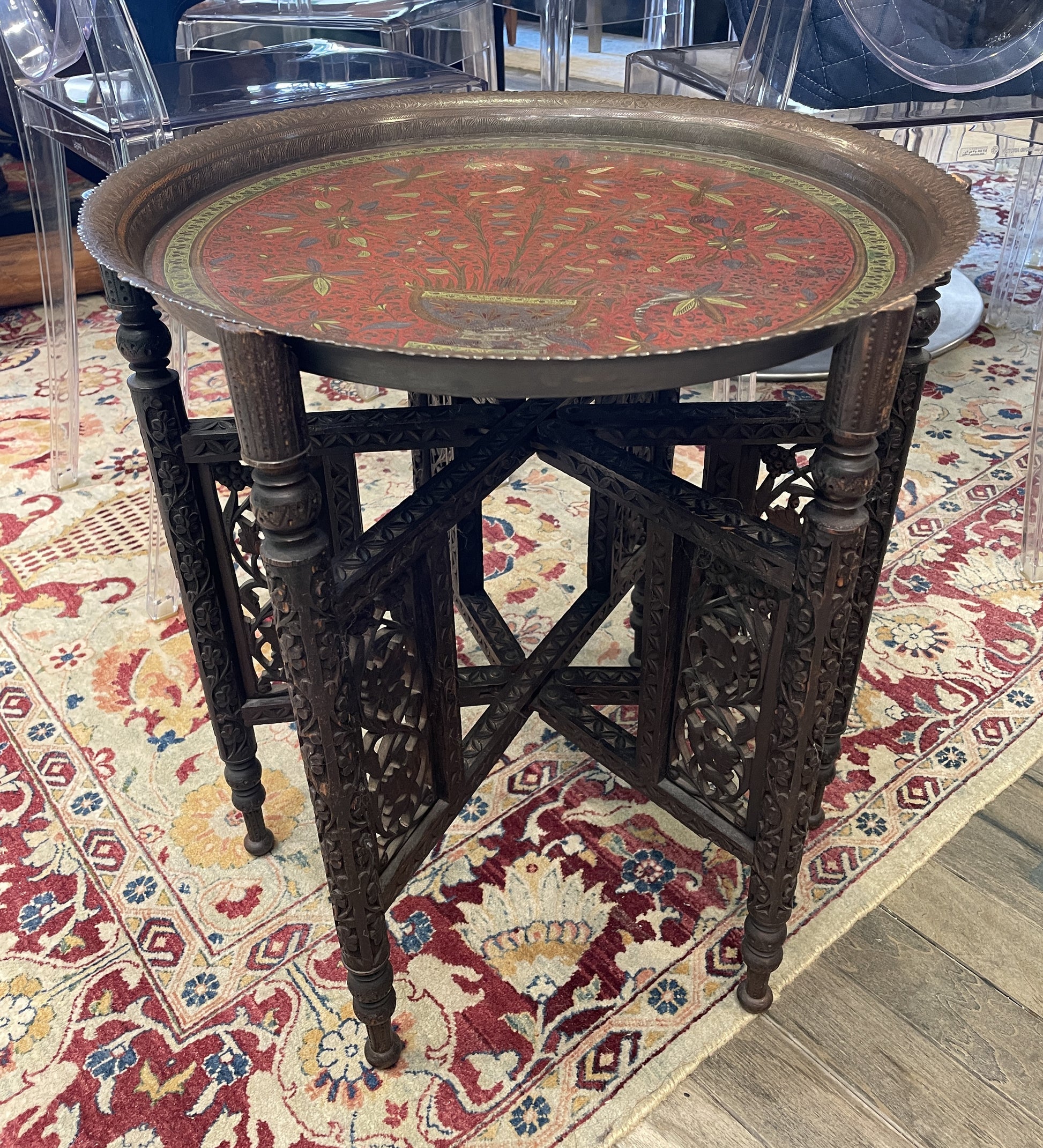 Beautiful brass tray with stand. This unique piece features a decorative brass tray that sits atop a carved wooden stand. The tray is embellished with an intricate floral design in shades of red, green, yellow, and blue. The tray rests on its dark wooden stand that is carved with a botanical motif. The stand features a fixed portion with two adjustable legs on either side. A beautiful display piece that's sure to elevate a space.