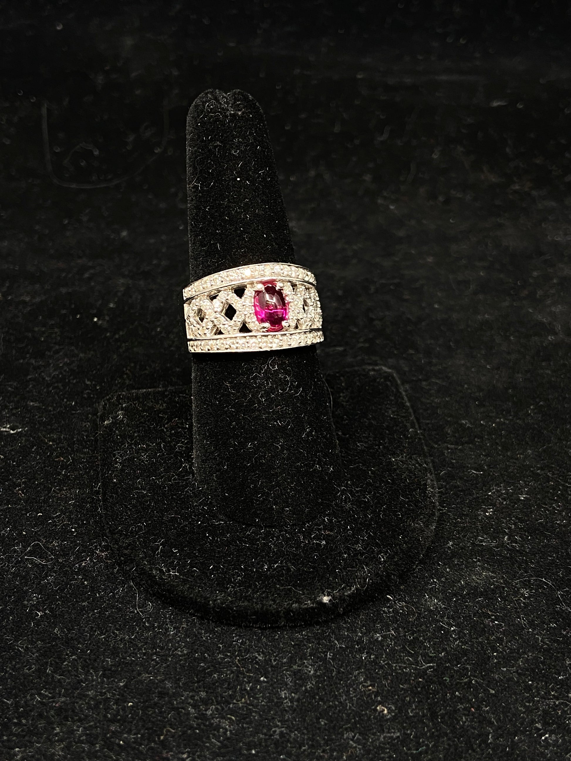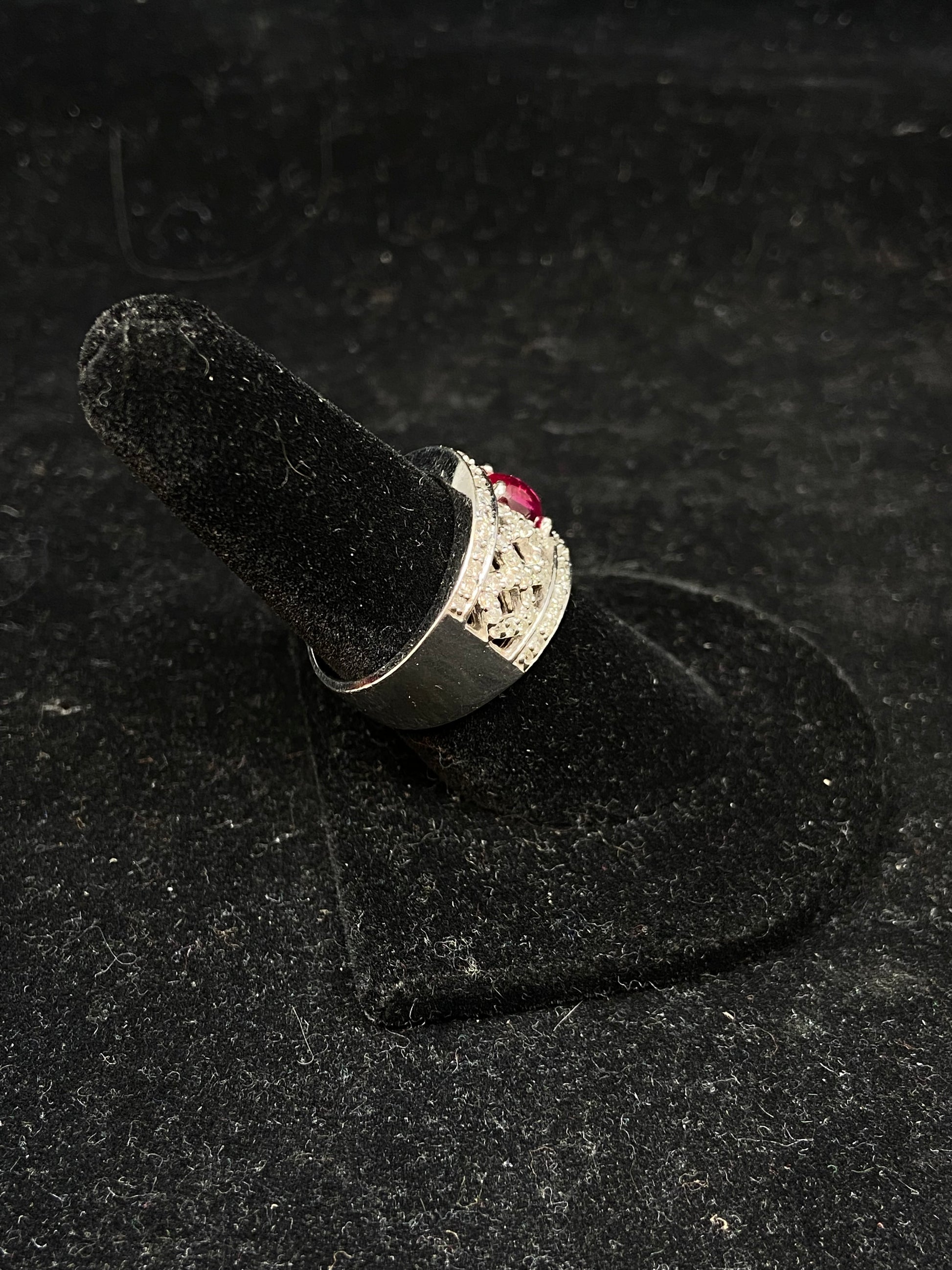 14K gold ring white gold tapered ruby and diamond ring. Features one prong set oval shaped ruby. The ruby is accented with multiple round cut diamonds.