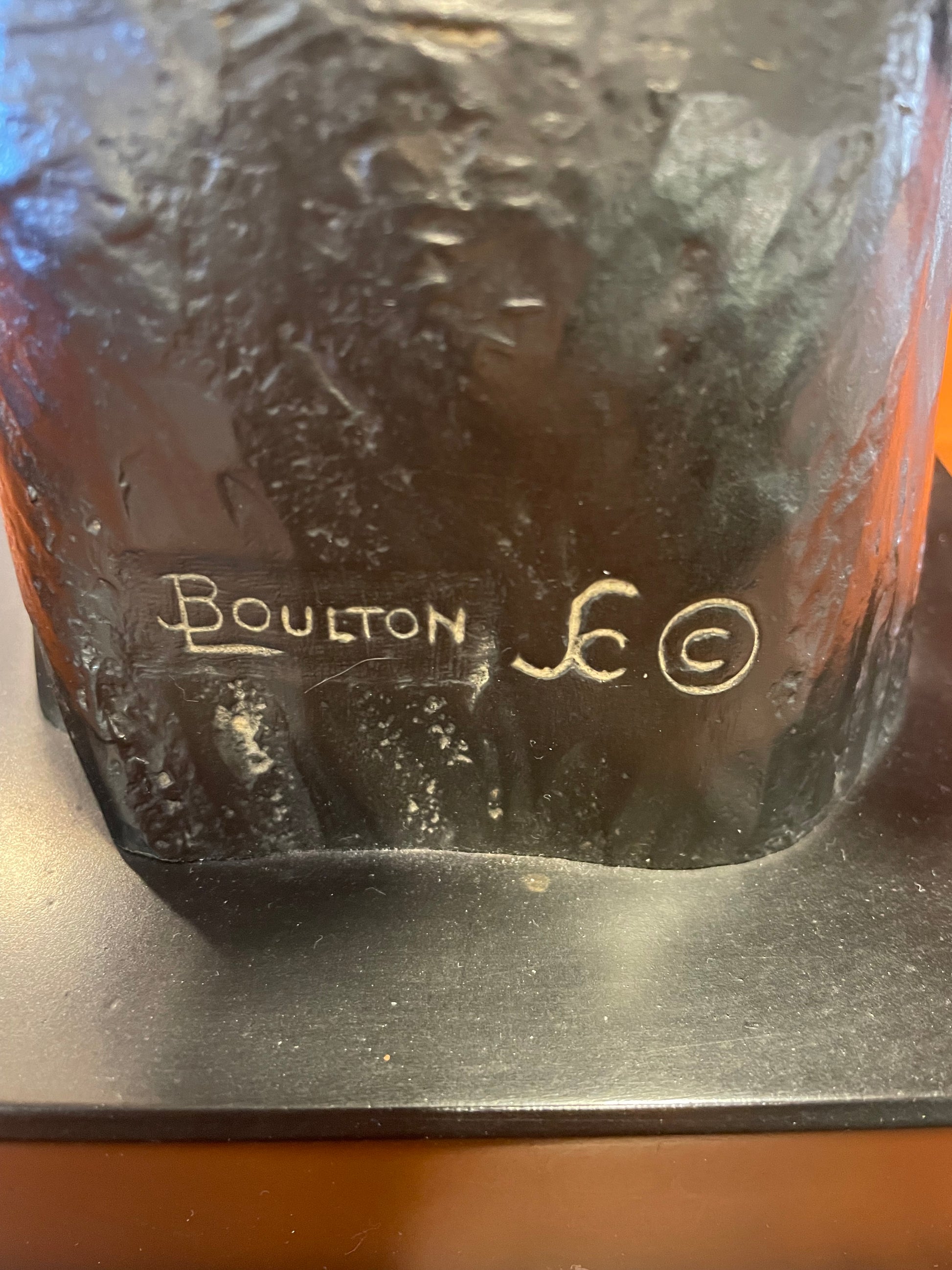 71,000,000 year old Ammonite from Magrath, Alberta, Canada. The ammonite features beautiful iridescent colors of green and red. There is a "Boulton" mark on the back side. The fossil rests on a stand made specifically to hold the rare masterpiece of nature. Comes with the certificate of authenticity.