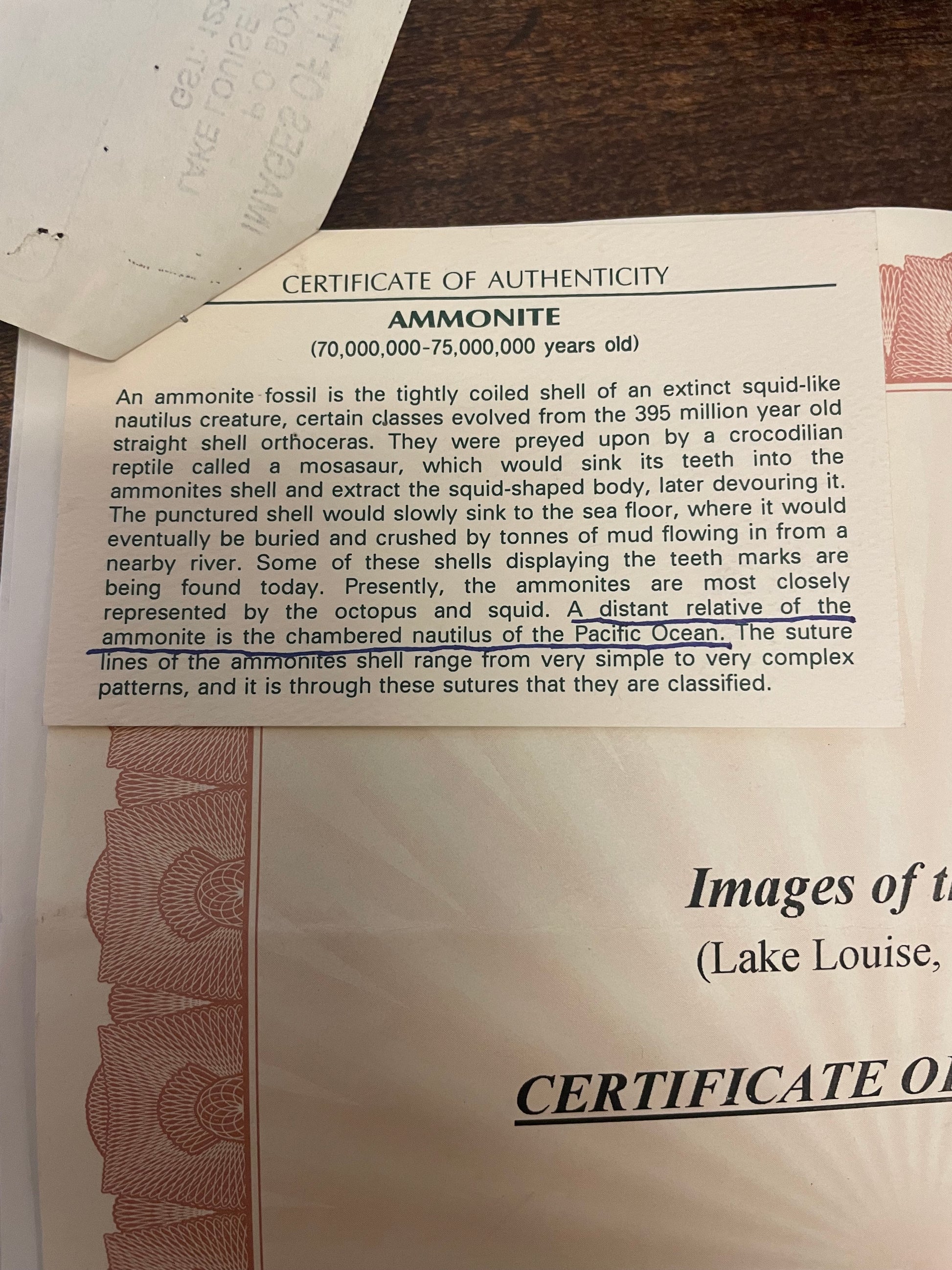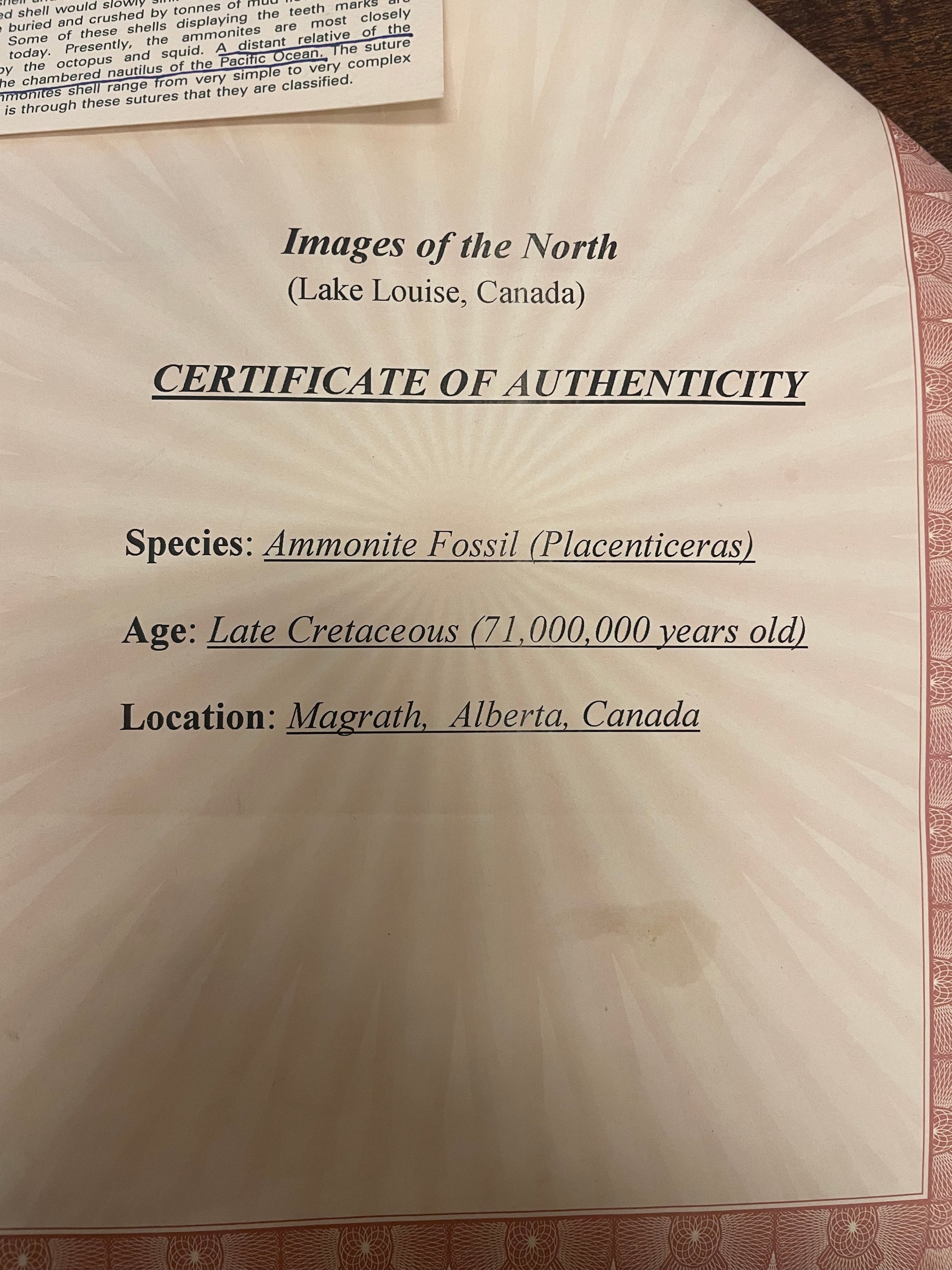 Note from the certificate of authenticity: "The fossil is a tightly coiled shell of an extinct squid-like nautilus creature. They were preyed upon by a crocodilian reptile called a mosasaur, which would sink its teeth into the ammonite's shell and extract the squid-shaped body, later devouring it. The punctured shell should slowly sink to the sea floor, where it would eventually be buried and crushed by tones of mud flowing in from a nearby river."