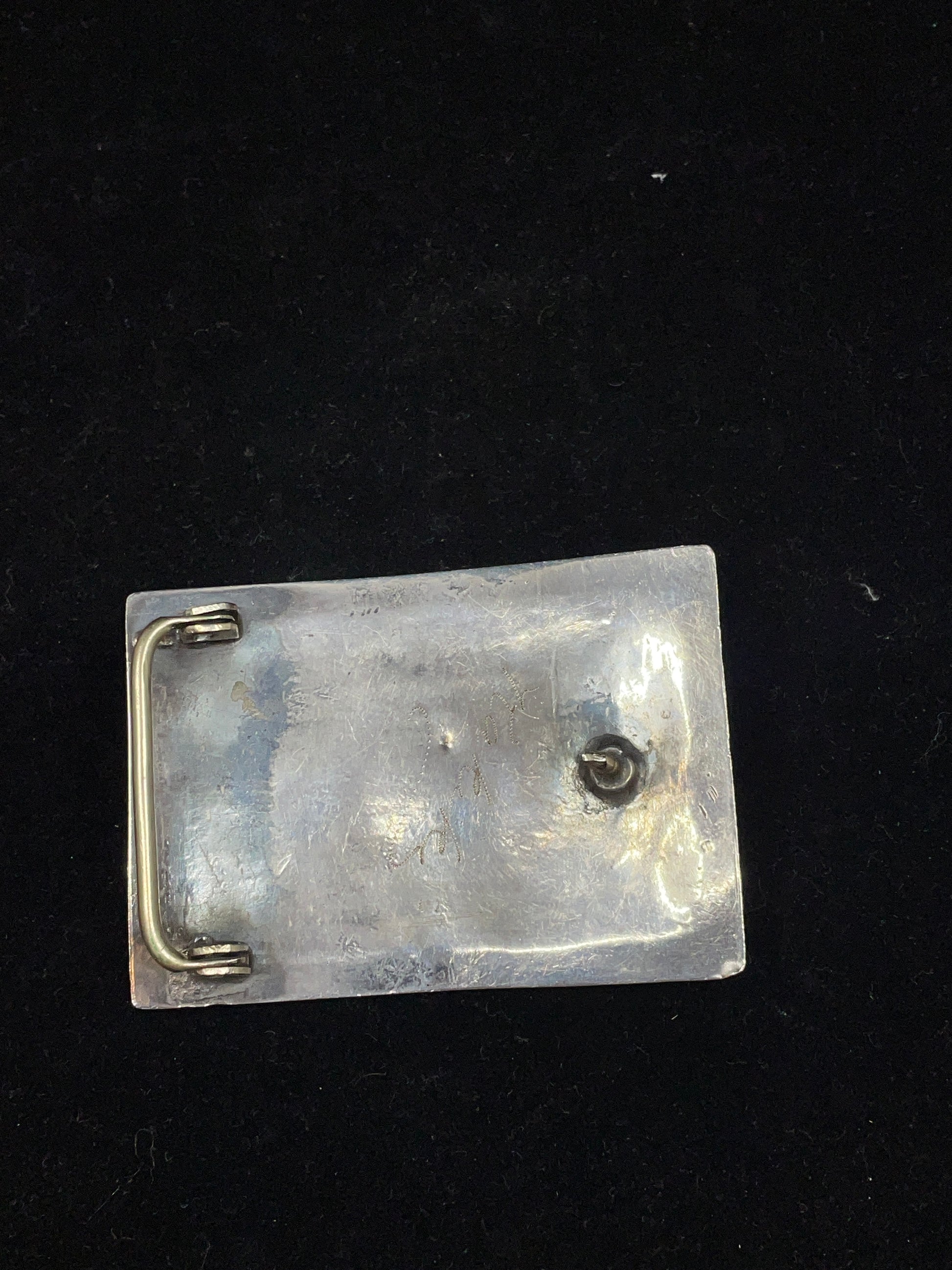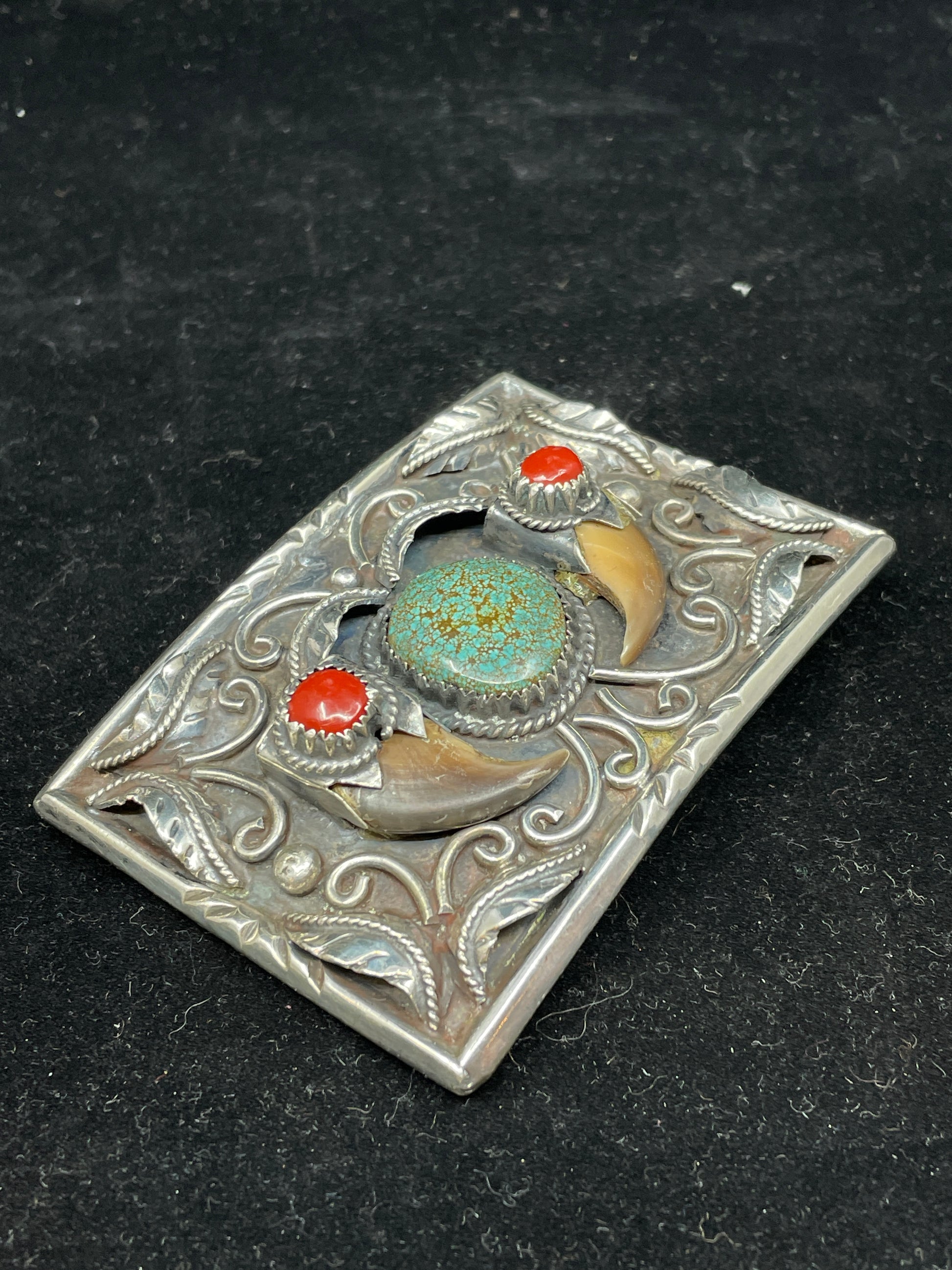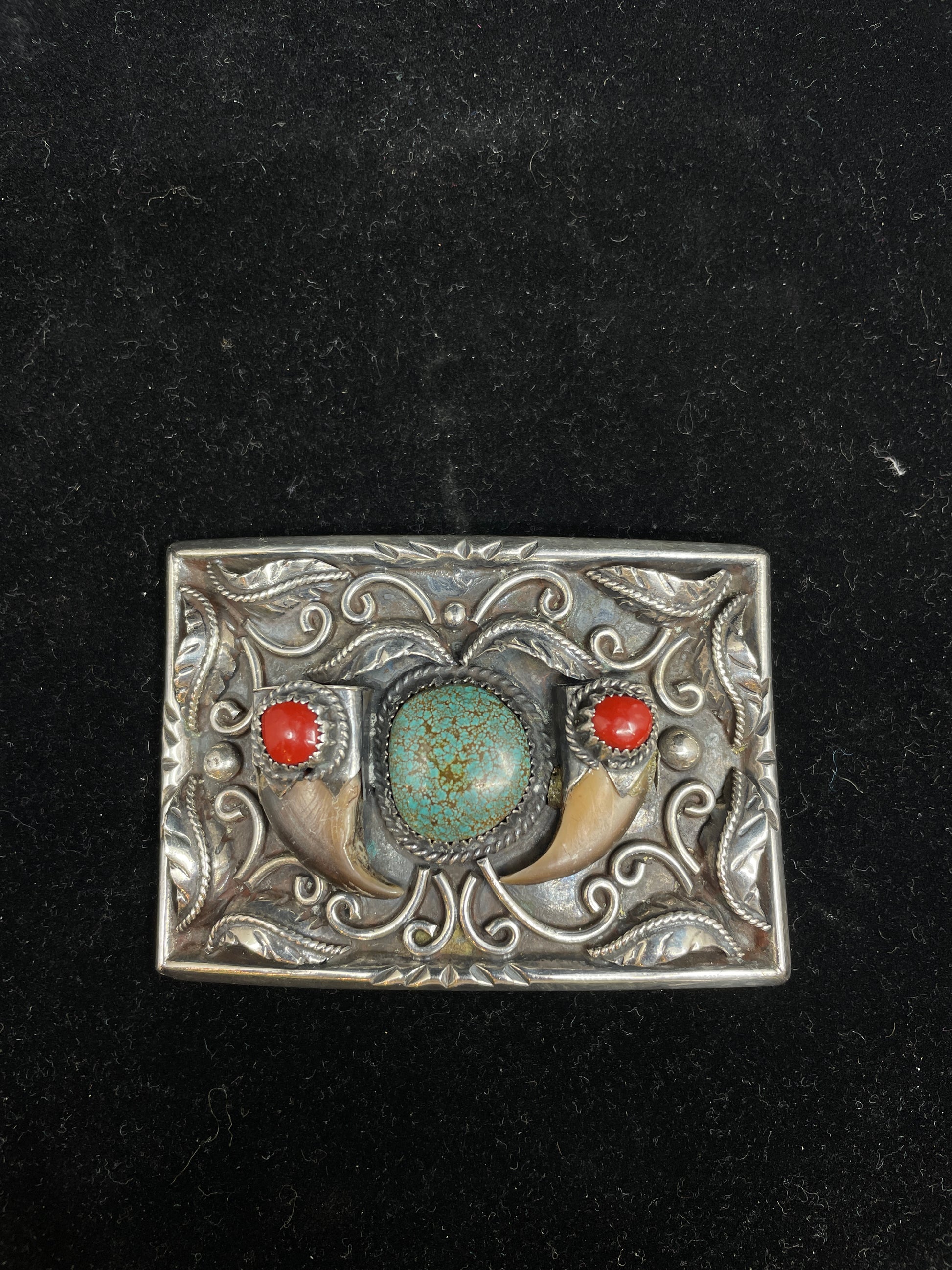 Sterling silver rectangular belt buckle by Casa Kakiki, constructed by the Tigua tribe. Features inlaid turquoise, coral, and bear claw. These natural elements are beautifully framed by ornate, swirling silver metalwork. Signed on the back of the buckle (see photos for details). This piece is truly a handmade, one-of-a-kind accessory!   Measurements: 3.25”W x 2.5”H This item is located at The Perfect Thing (161 Town Square, Wheaton, IL 60189). Shipping available for a fee. Contact Kate@theperfectthing.net for a quote. All items are previously owned and used, please see pictures for details. Pictures are provided to the best of ability. Factors like resolution, lighting, and coloration may affect detail perception.