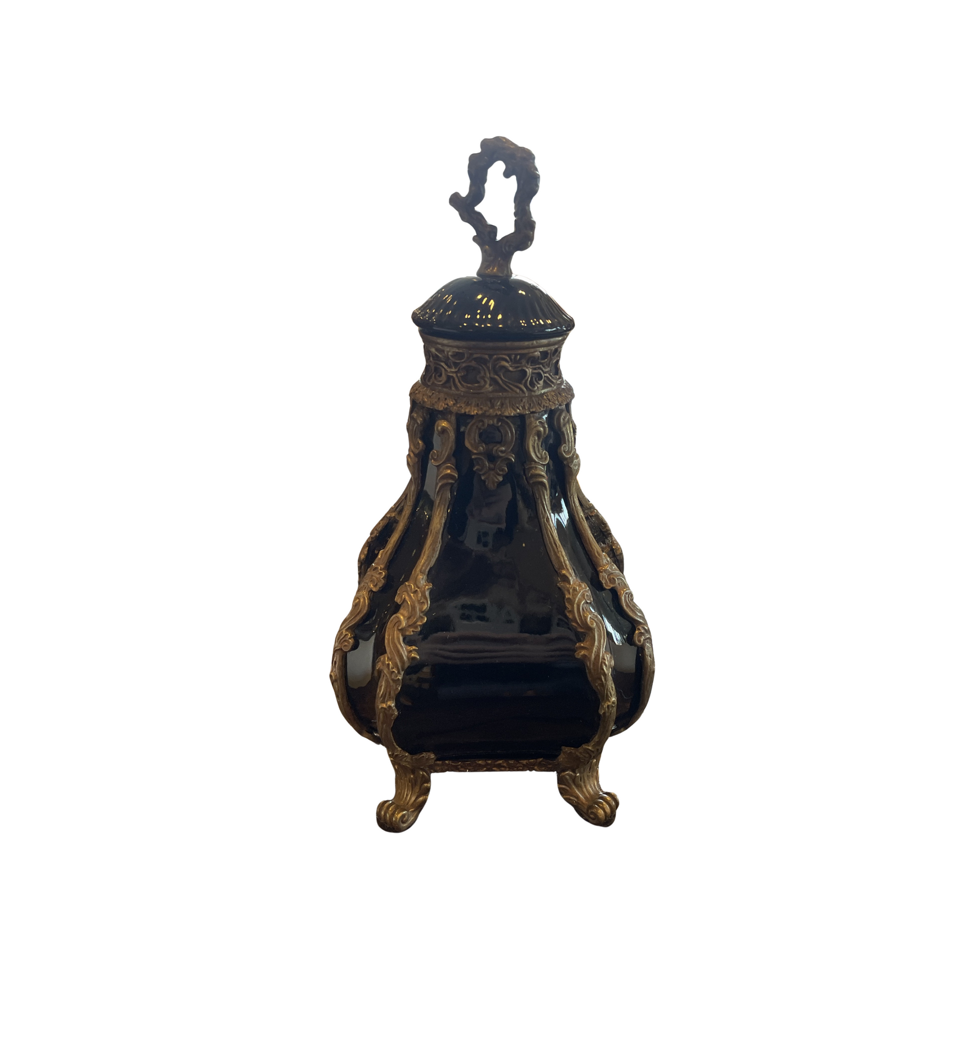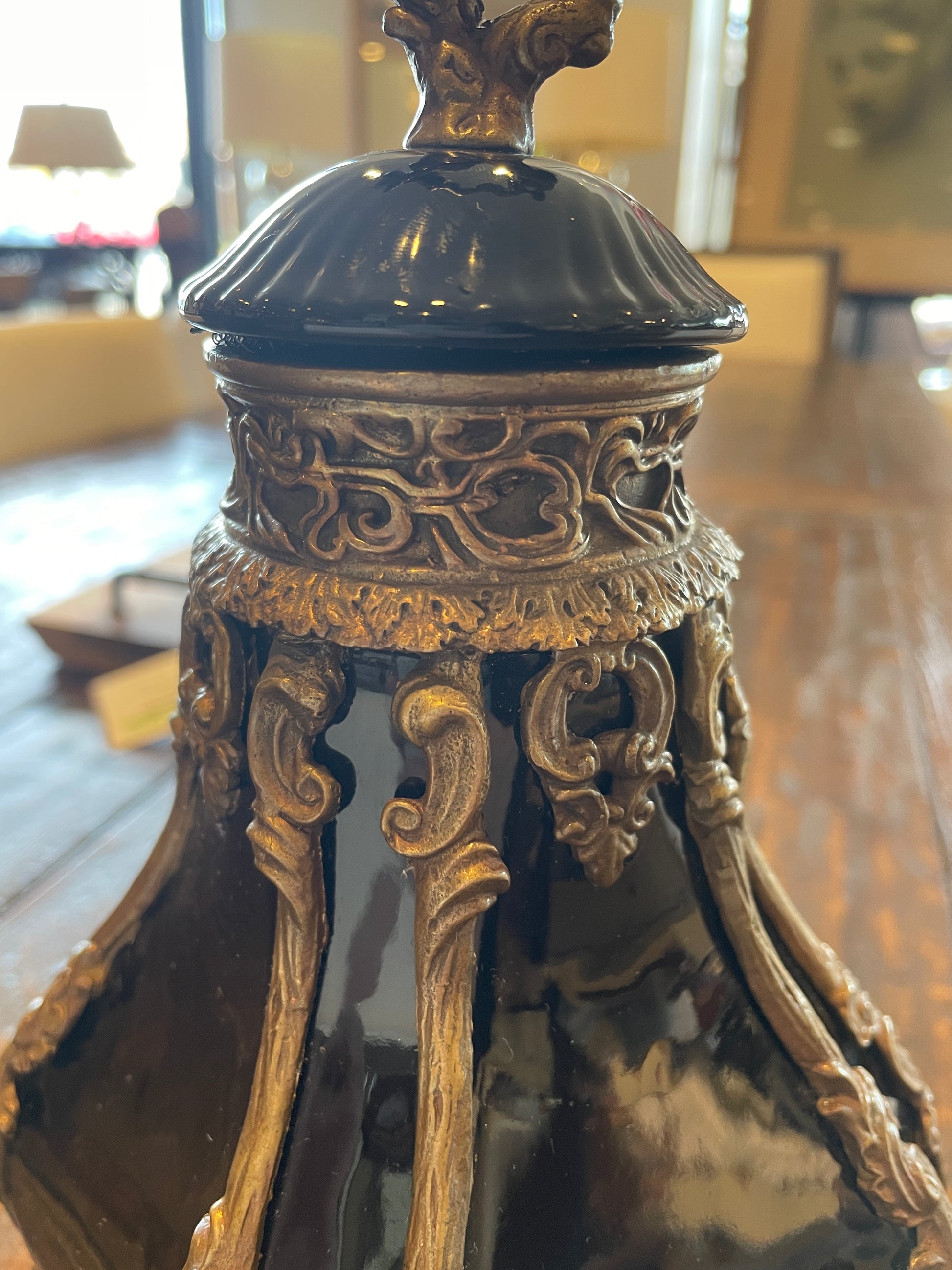 Vintage Castilian black bottle vase. This beautiful porcelain vase is black in color and has beautiful bronze details. The intricate bronze frames the piece, and four small paw feet made of bronze hold the vase up. The lid of the piece has an asymmetrical loop-shaped handle. This stunning piece is sure to add a sophisticated charm to any space.