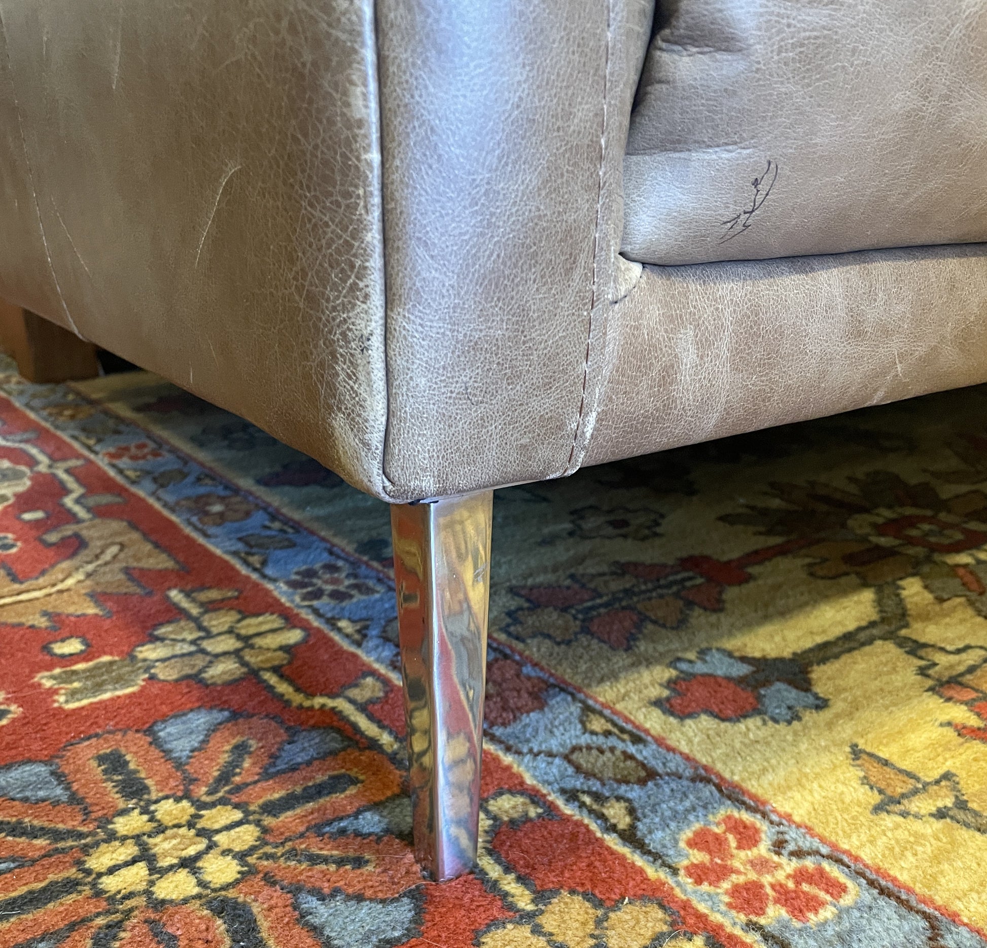 CB Savile sofa in brown analine leather. This beautiful piece sits atop short, tapered metal legs. The back and interior of the sides of this piece have a button tufted design. The piece has two large plain cushions. The sofa has pointed corners, and a deep seat which emphasizes the overall sleek appearance. A timeless leather sofa that's sure to add comfort and charm to a space.