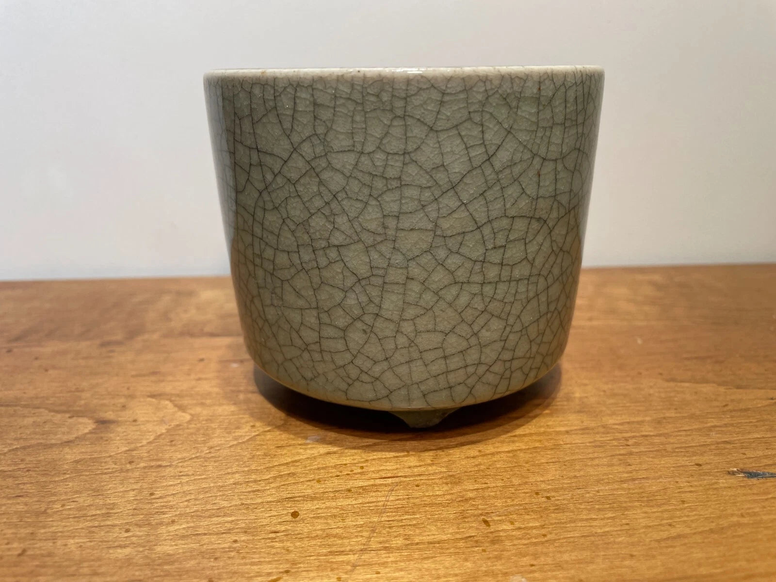 Antique celadon Ming brush pottery pot. Features a crackled celadon glaze with rimmed top. Sits on a tri-footed feet. Circa 1950's.
