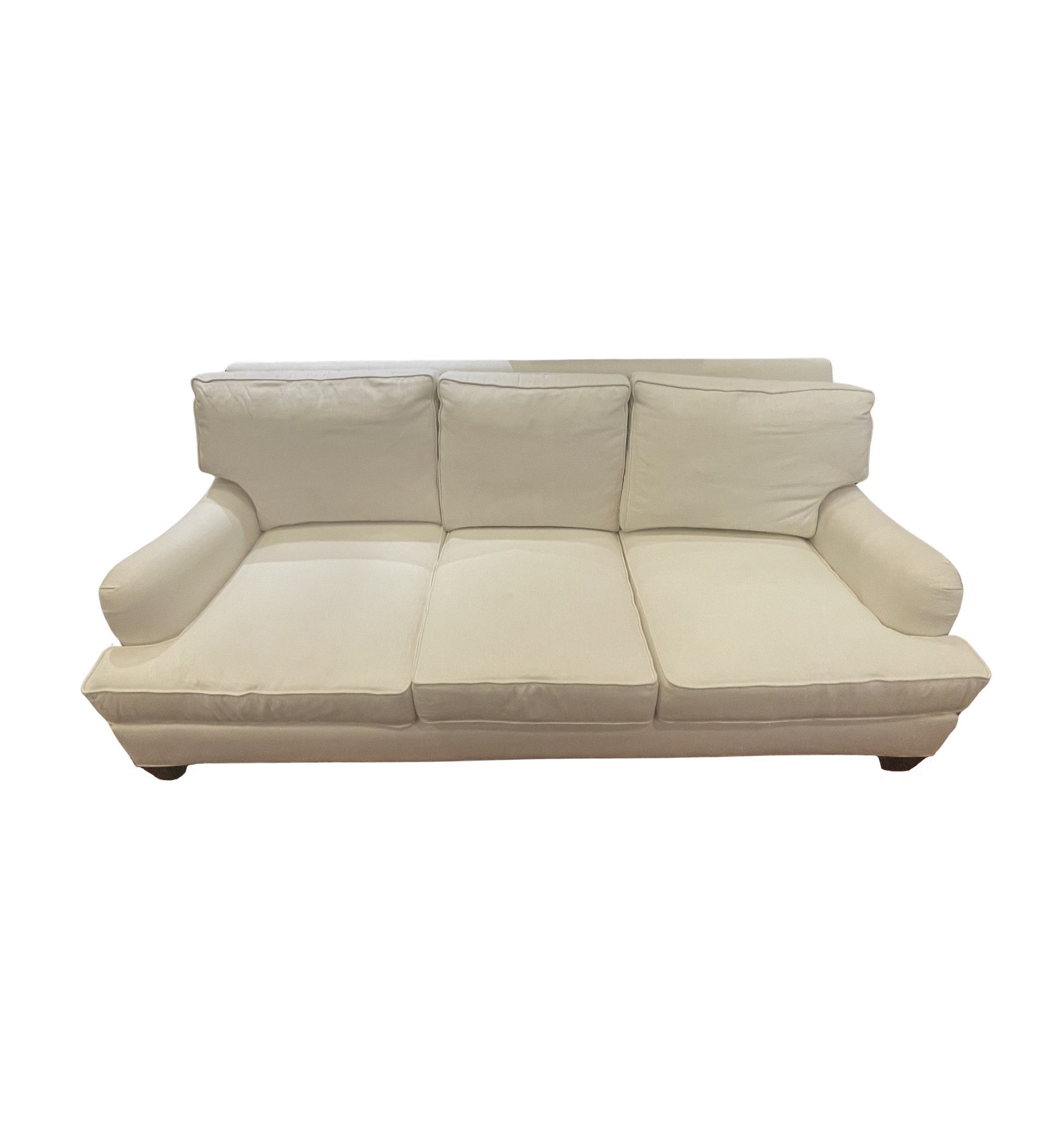Century Cornerstone custom sofa. This stunning sofa comes from Century's cornerstone collection which is highly customizable. This sofa is upholstered with a hardy white fabric. The piece sits on dark tapered wooden legs that sit low to the ground. English arms cap either end of the piece, and each of the three seats has both a seat and back cushion. The outer cushions are T-cushions, which further elevates the sofa's classic shape. This charming sofa is sure to elevate any space with timeless charm and inviting comfort.