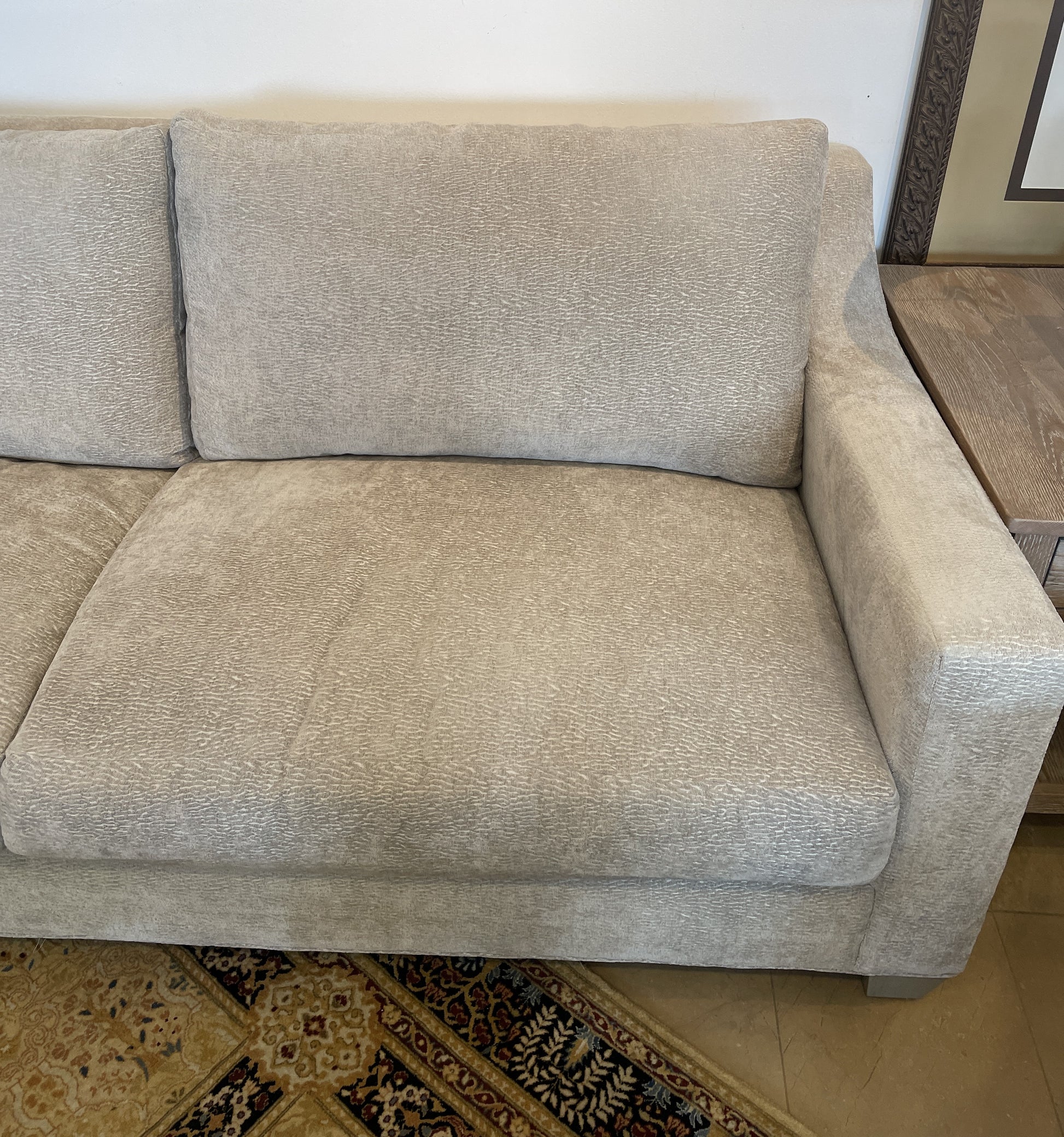 Sofa from Century, featuring light grey chenille upholstery with a subtle tiger-print texture. The arms have a modern, rectangular shape that slope upward toward the back. Tapered block feet are finished in a gray tone. The sofa is branded underneath the seat cushions and comes with 4 throw pillows.