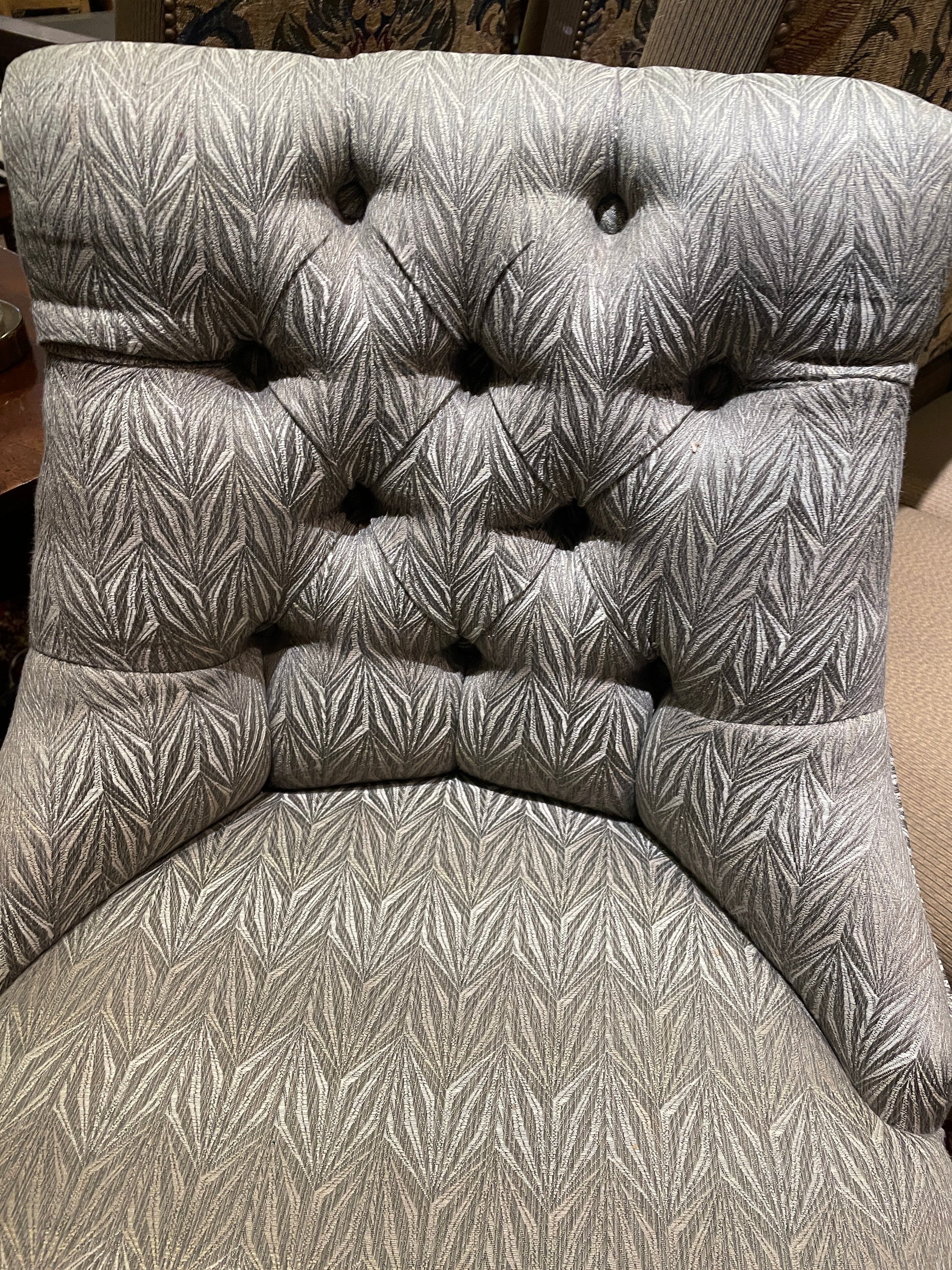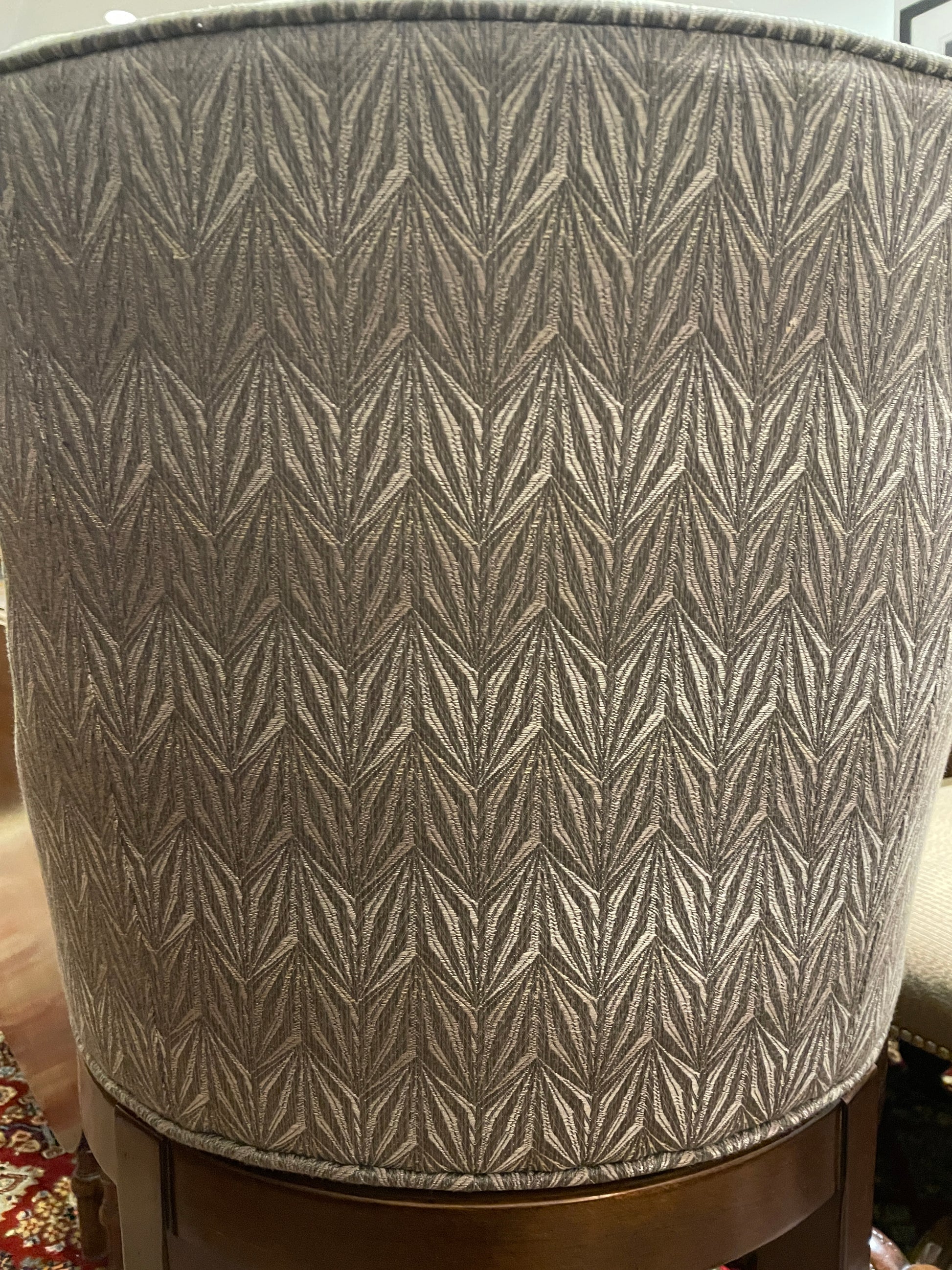 Century upholstered swivel barstool. This charming barstool features an upholstered seat and backrest atop a wooden swivel frame. The barstool is circular in shape, and the backrest follows the curve of the seat. Similarly, the base of the barstool has a circular stretcher. The upholstery of the barstool is gray in color and has a geometric pattern. The backrest includes tufted details on its front. A comfortable and chic piece that's sure to elevate any space.