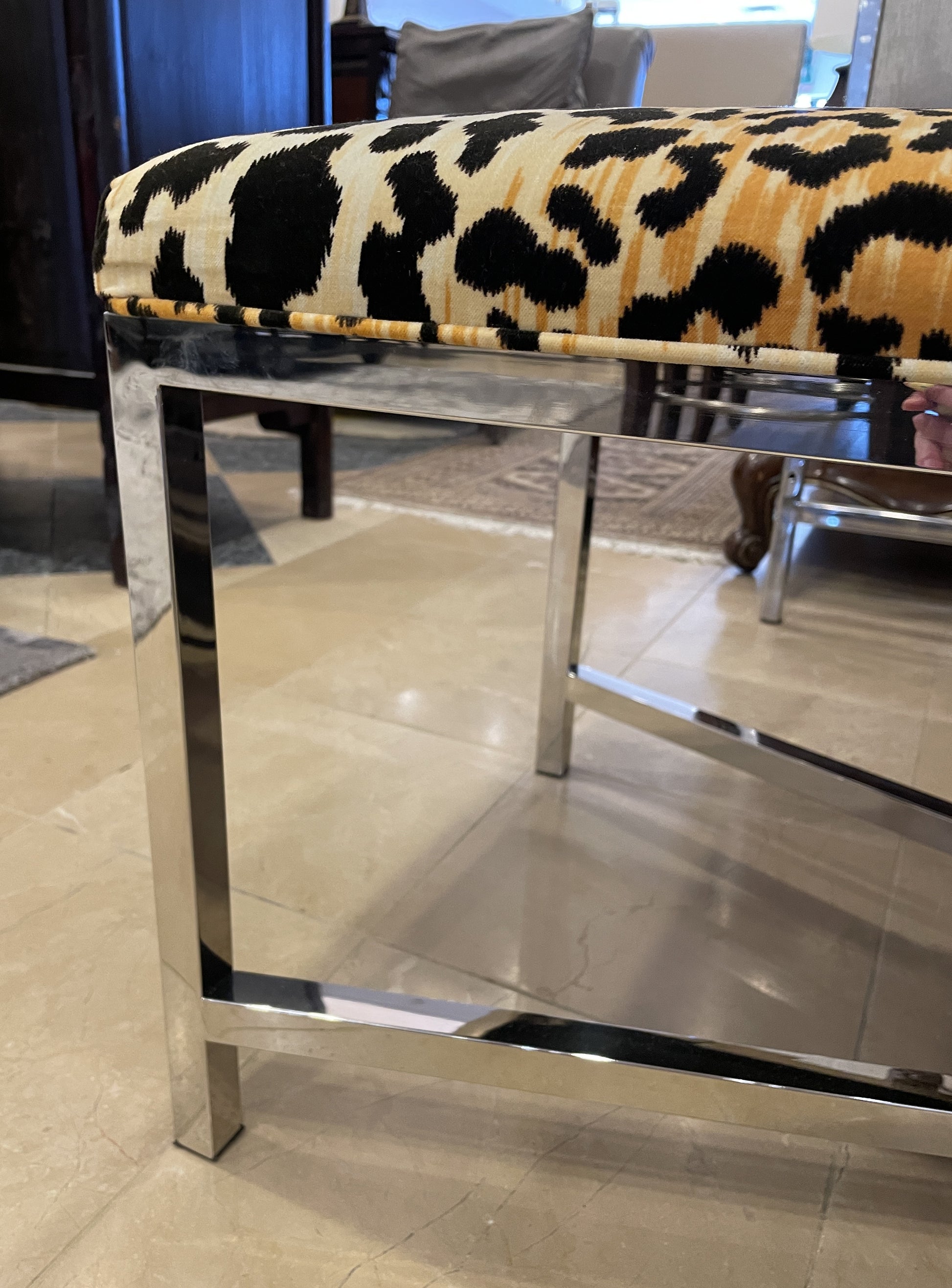 Century "Valence" bench with leopard print upholstery. This unique bench sits on a four legged chrome base with an X-stretcher. The seat is upholstered with an eye-catching leopard print velvet that has a luxuriously soft feel. A charming bench sure to add comfort and contemporary style to any space.
