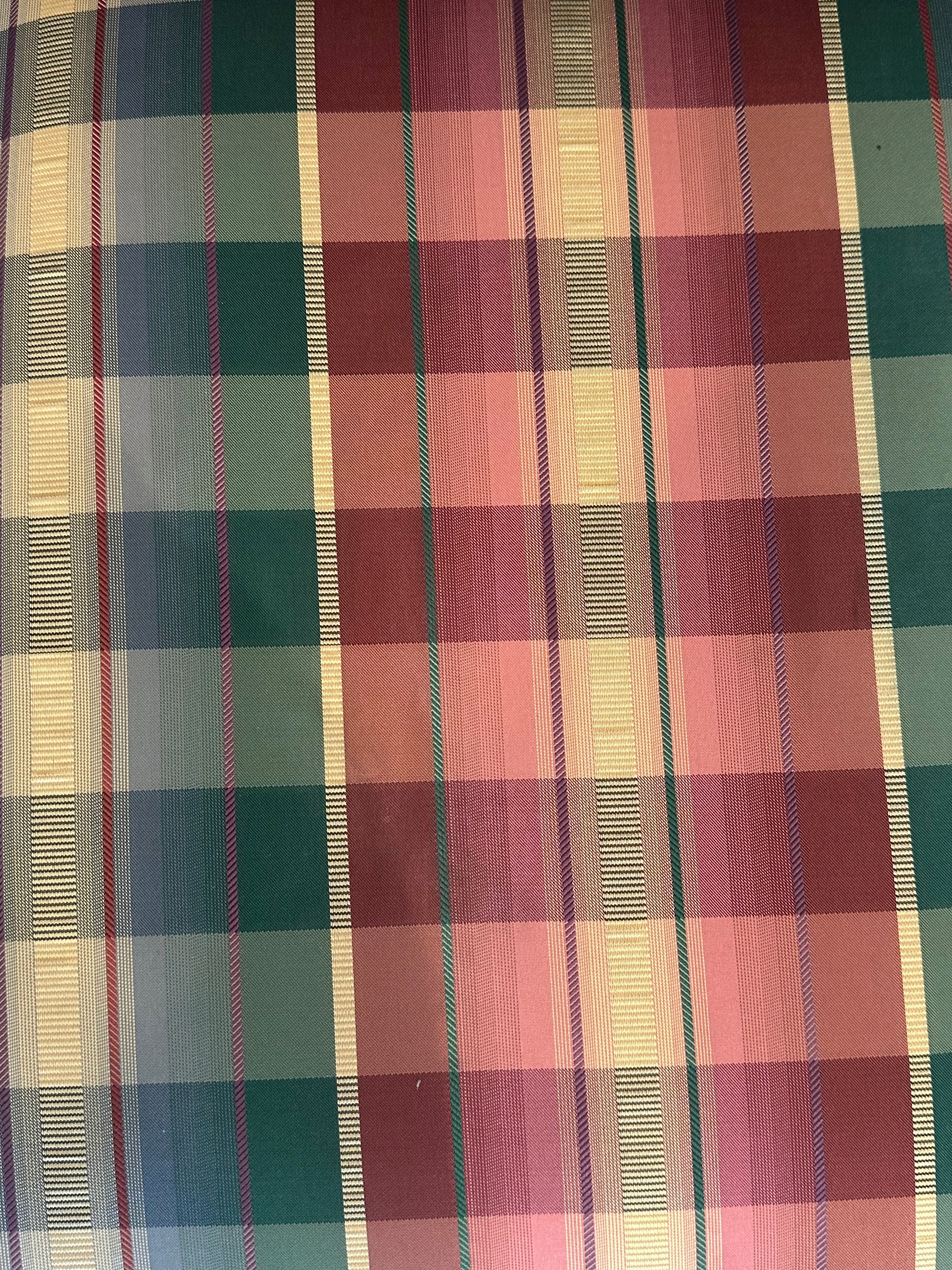 Regency style wooden music chair. Chair features a wooden frame with inlaid details on each slat of its back that are golden in tone. Chair seat is a green, red, gold, and white plaid upholstery. Finish is a medium-dark color with red undertones. Carved line also adorn the chair frame. The chair sits on four saber legs.