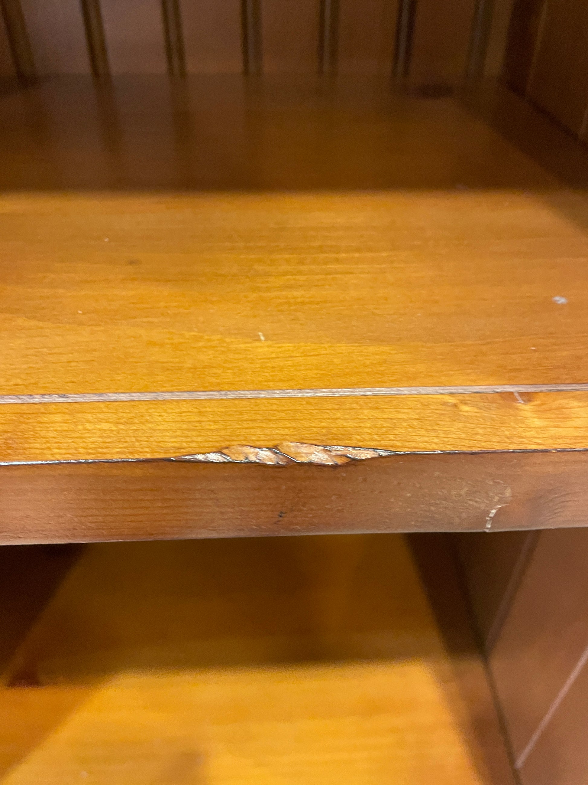 Beautiful cherry bookcase. This stunning cherry wood piece features five shelves. The bookcase is quite narrow, which gives it a sleek appearance. The back of the shelves has a charming slatted design. Crown molding accents the top and bottom of the piece. A stunning traditional piece that's sure to elevate a space. A perfect piece for a narrow space that needs just a little more storage.