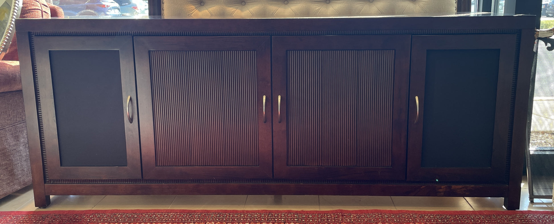 Elegant cherry entertainment console. This beautiful deep cherry wood entertainment console features four compartments, each with a hole in the back for easy cord access. The outermost compartments have doors with black mesh covers, and the center two compartments have doors with a reeded pattern. The second compartment has one shelf. The brass handles on each door are a slender curved shape. Between the compartment doors and the frame of this piece is a small border that matches the reeded pattern of the center doors. The piece sits atop small square feet and has a plain top. An richly colored and elegant piece that's sure to elevate a space.