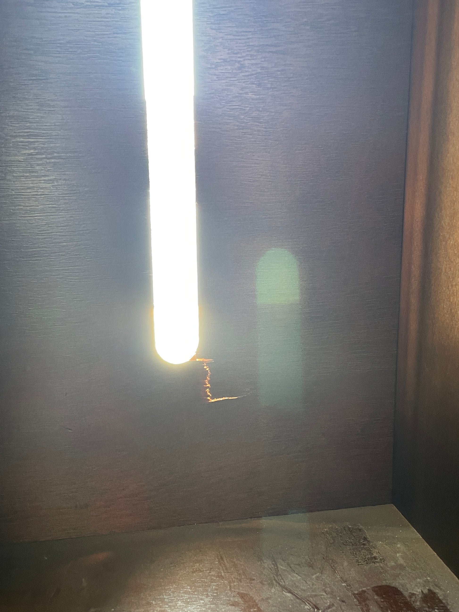 This item is sold in AS IS condition. The leftmost compartment's cord hole has a crack, and there is some wear to the surface of this piece. Please see photos for details.