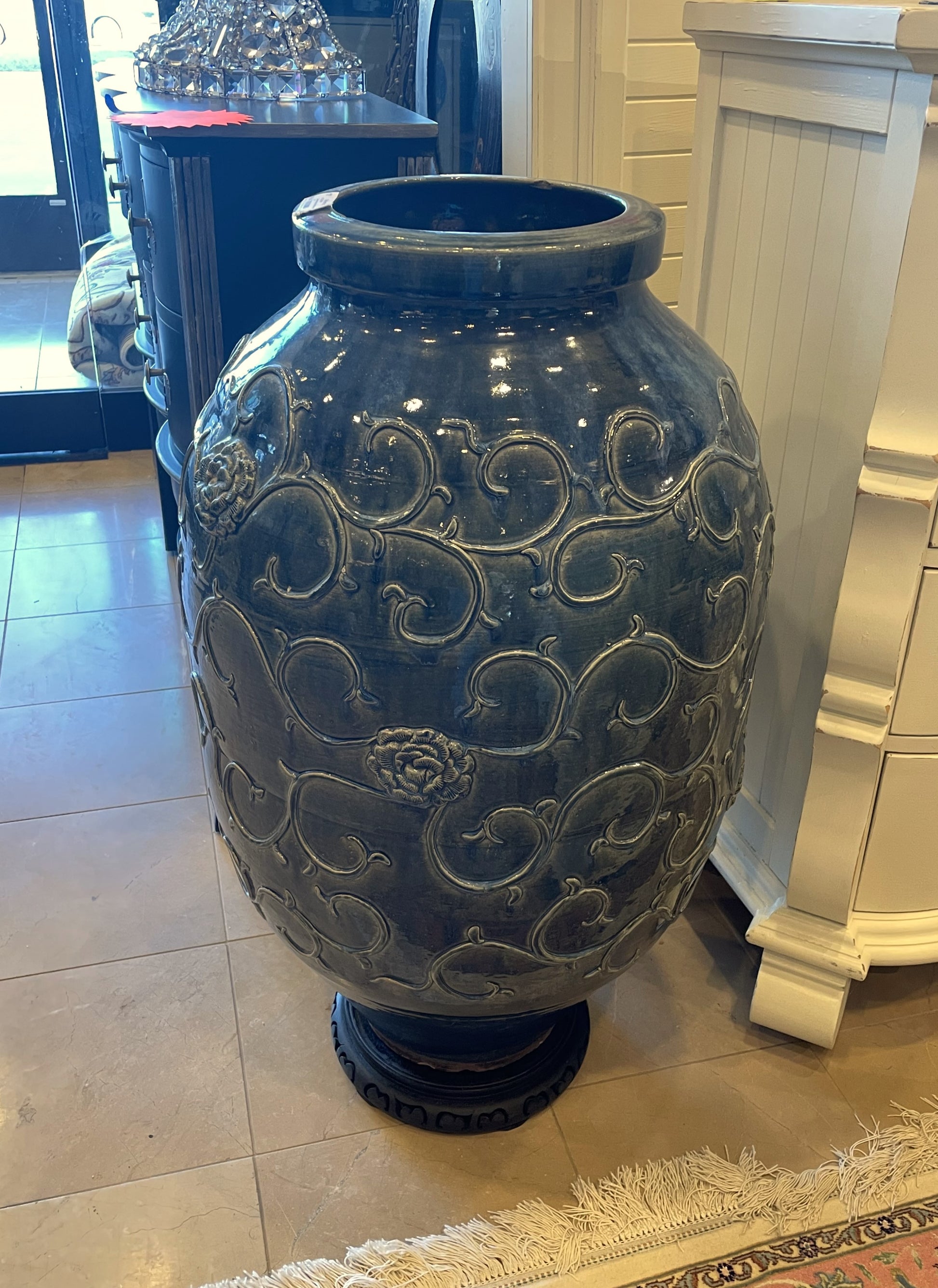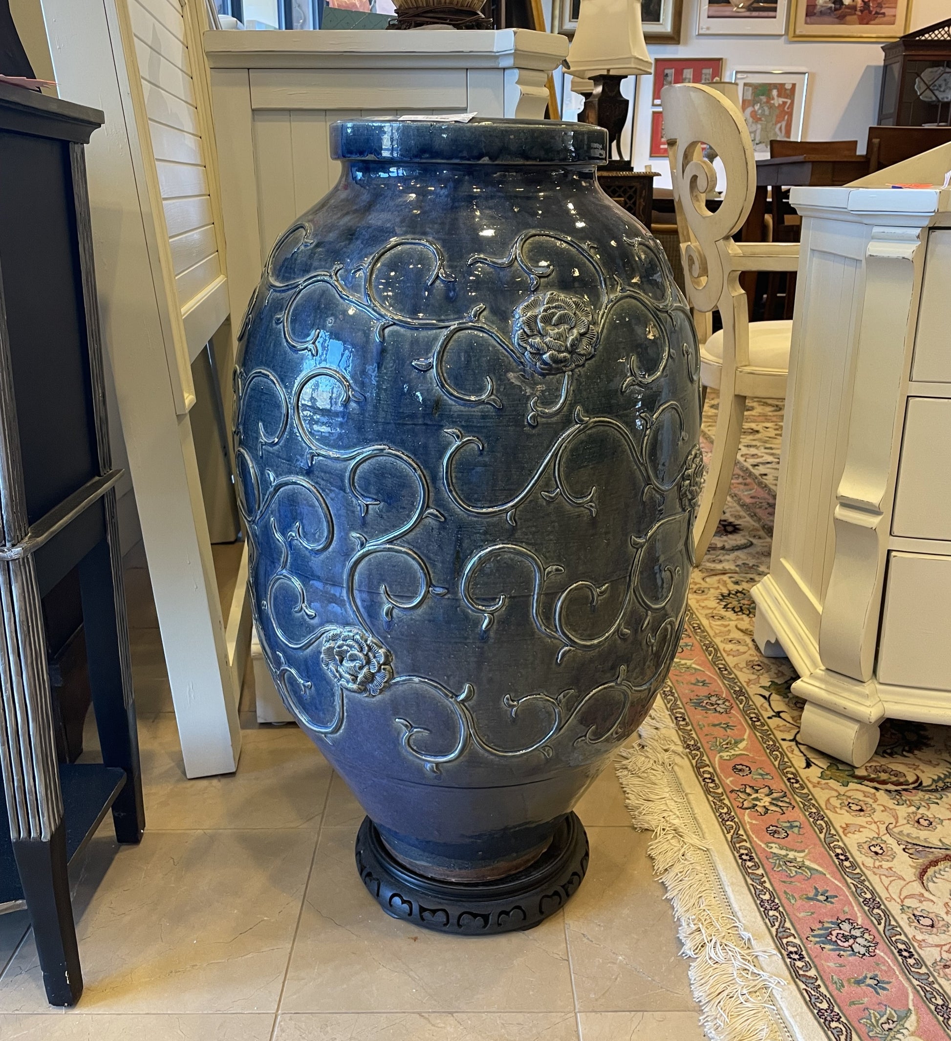 This impressive oversized urn boasts an intricate, swirling floral pattern and a stunning deep blue glaze. The subtle distressing on its highpoints adds character and depth to the piece. The urn is elegantly displayed on a compact wooden stand.