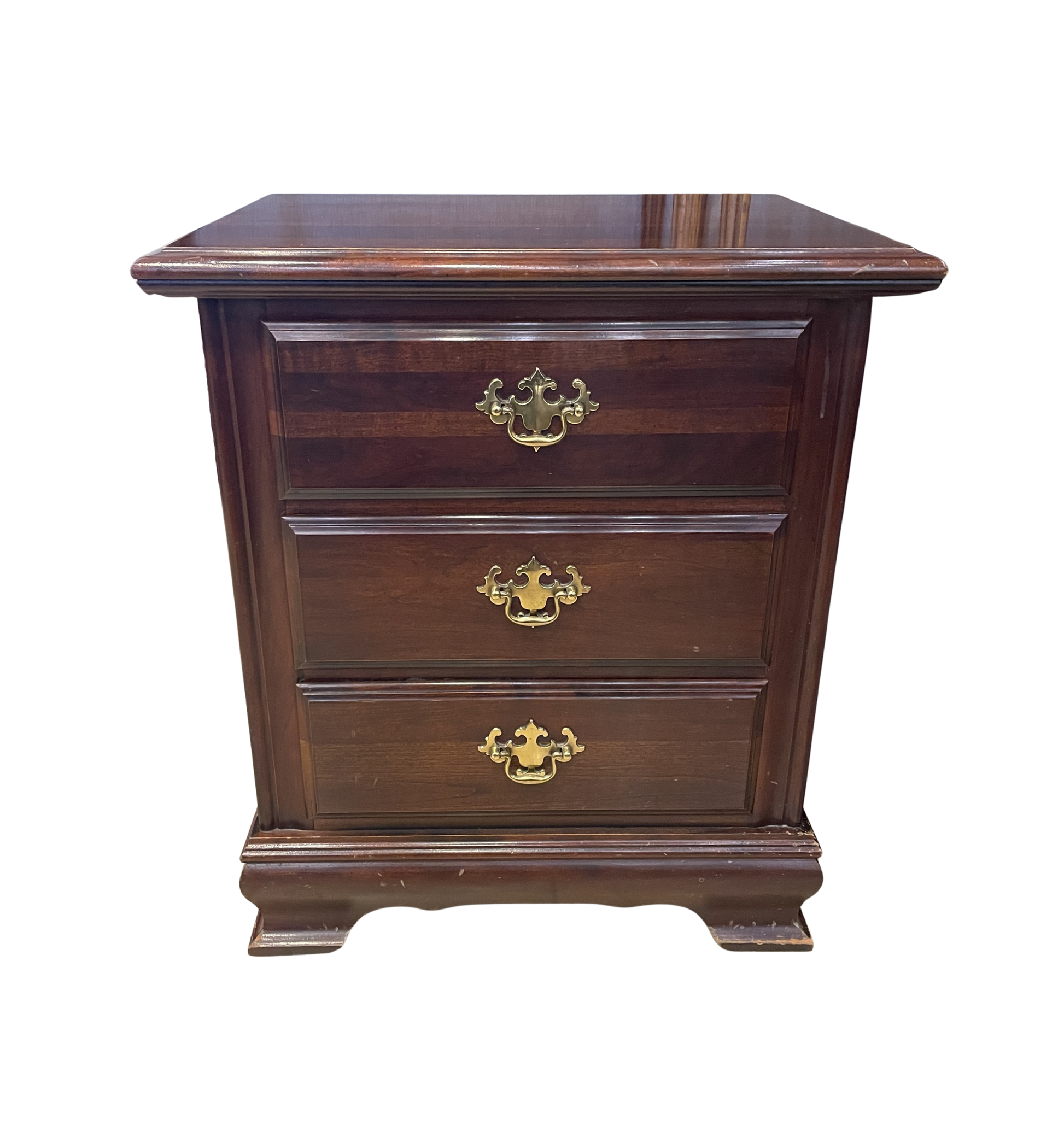 Chippendale mahogany three drawer nightstand. This gorgeous little nightstand is crafted from beautifully dark-toned mahogany wood. The piece sits on short bracket feet, and is rectangular in shape. Three drawers are present in the nightstand, each of which the same size and with the same brass pull handle. The pull handle rests on a detailed backplate. This charming nightstand features a simple, timeless look that's sure to elevate any space with functionality and design.