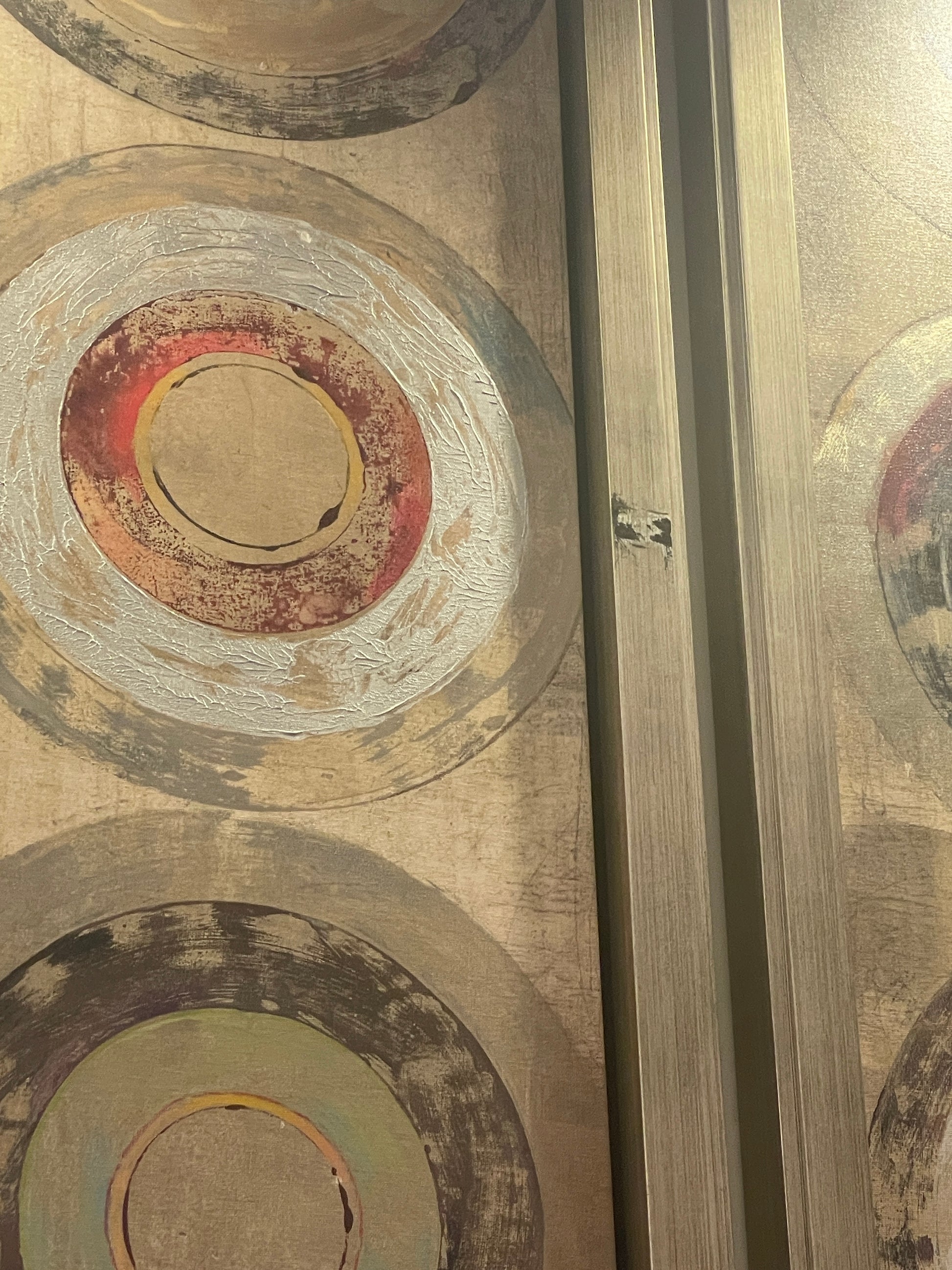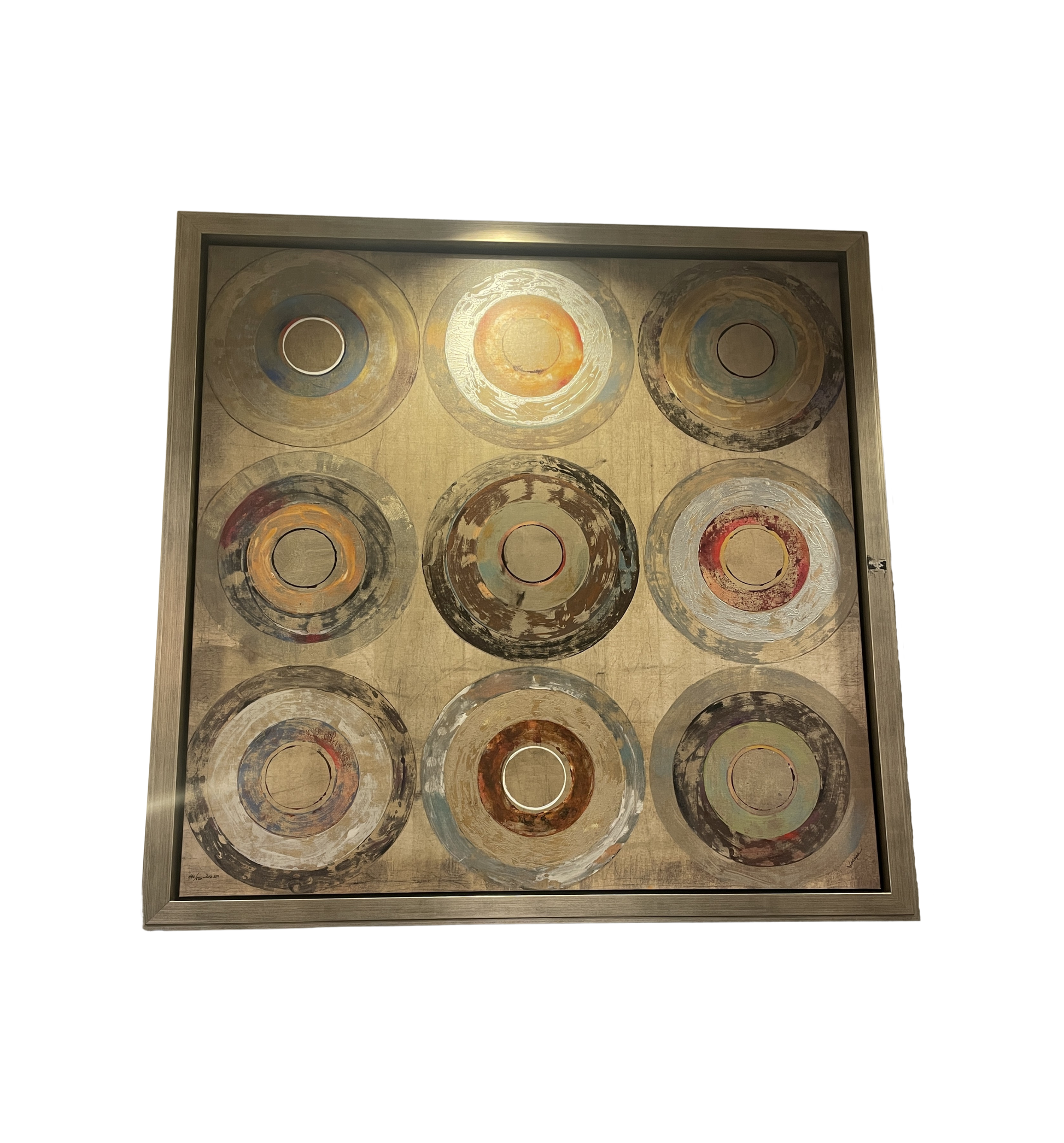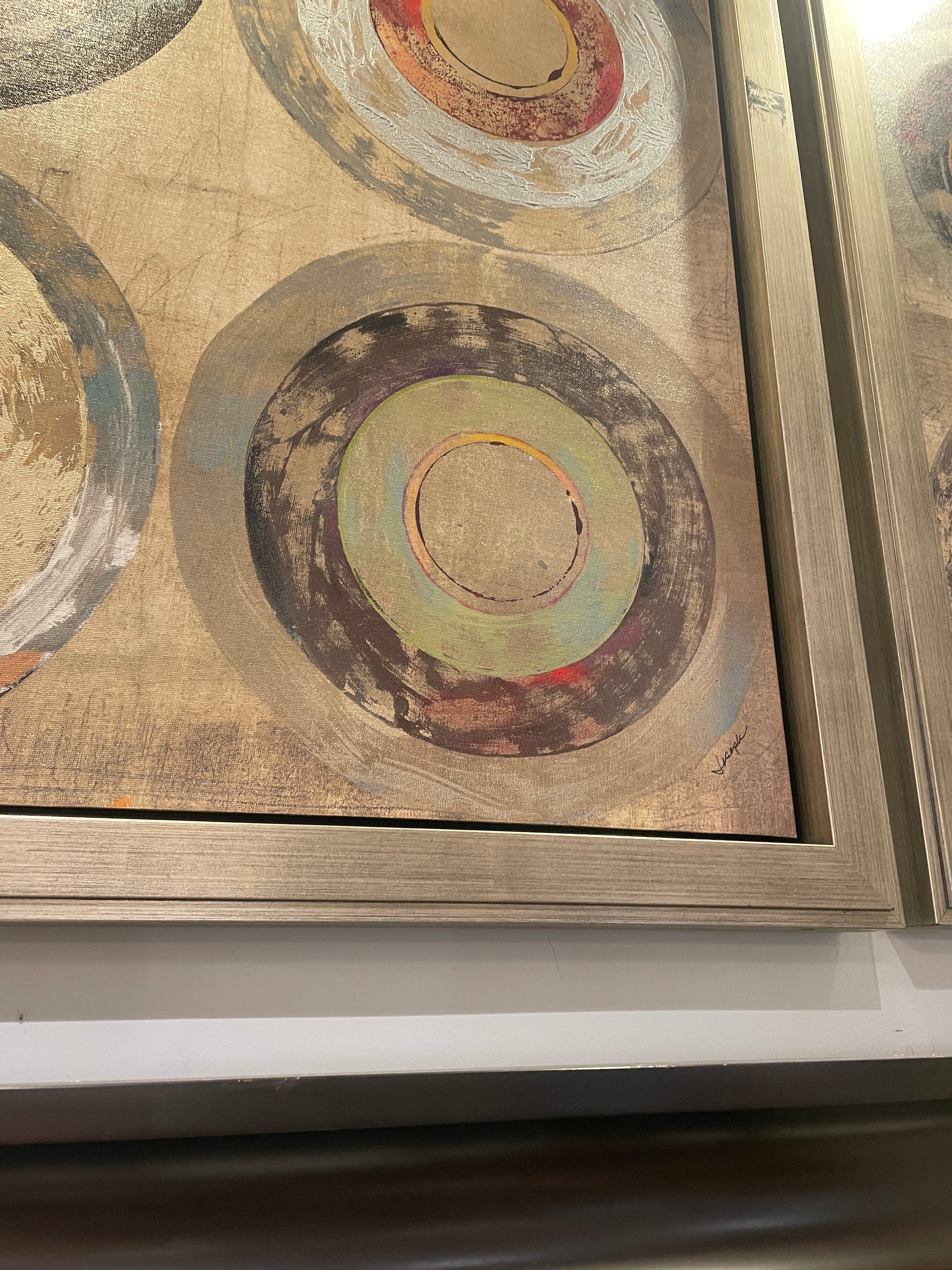 Ethan Allen circle giclee signed Joseph. Signed lower right, numbered lower left. Two available (442/500 2nd edition, and 450/500 2nd edition). This beautiful large giclee features an array of circles. Each spot has a series of concentric circles in a variety of neutral toned colors. The entire piece has eye catching texture with both the background and the circles having an almost distressed feel. The piece is held in a faux finished wooden frame. A charming abstract piece that's sure to draw attention in any space.