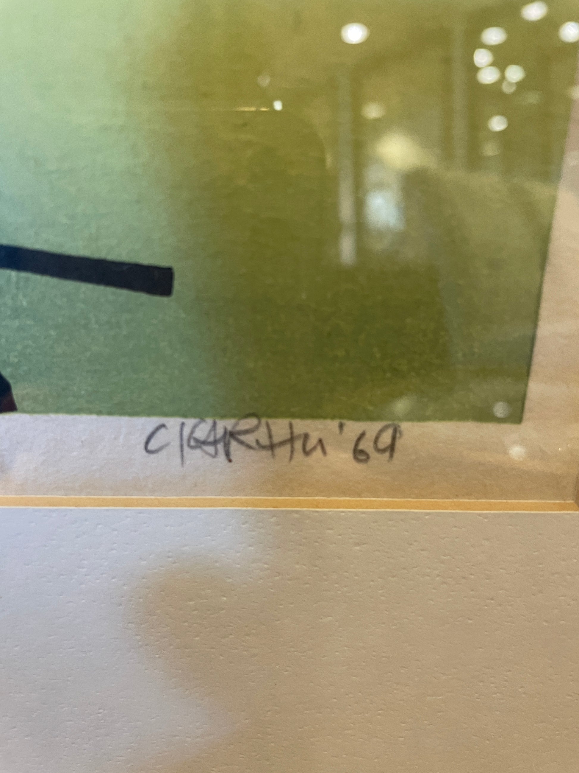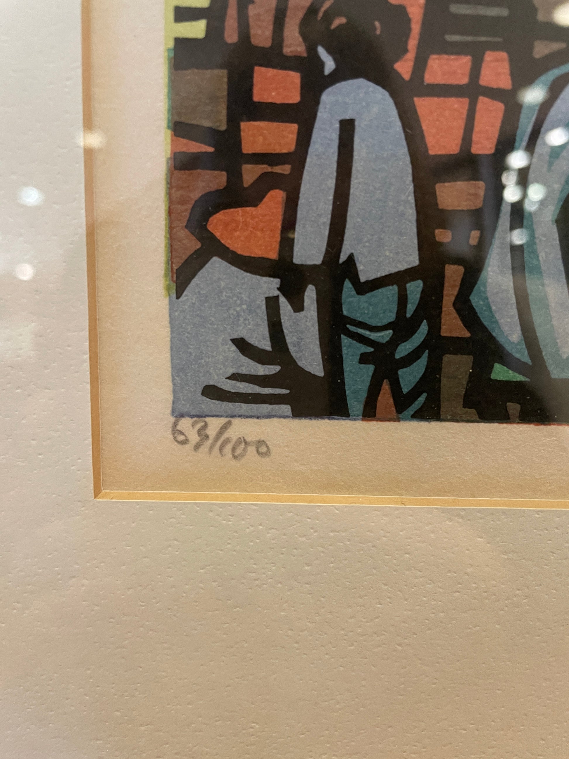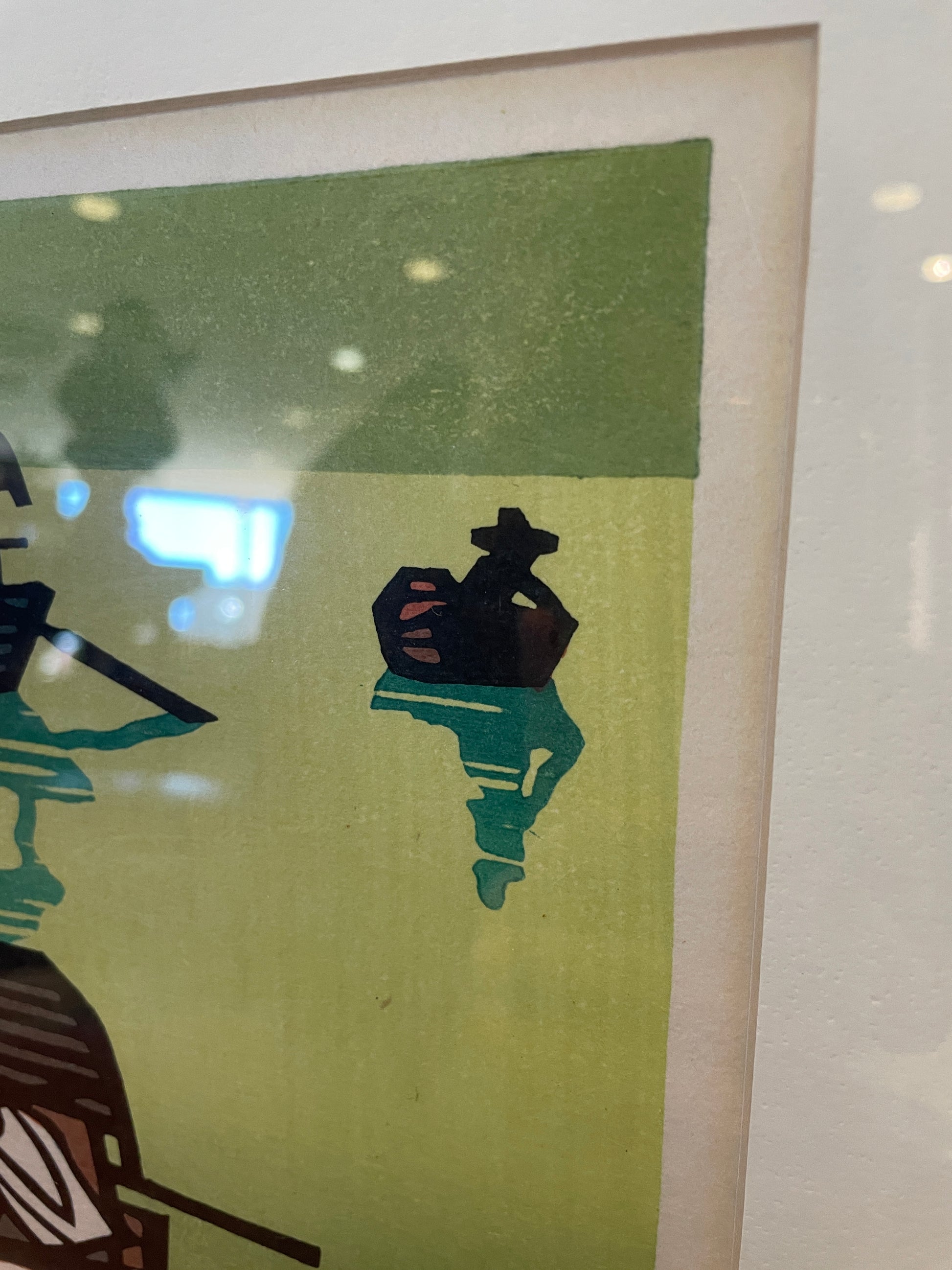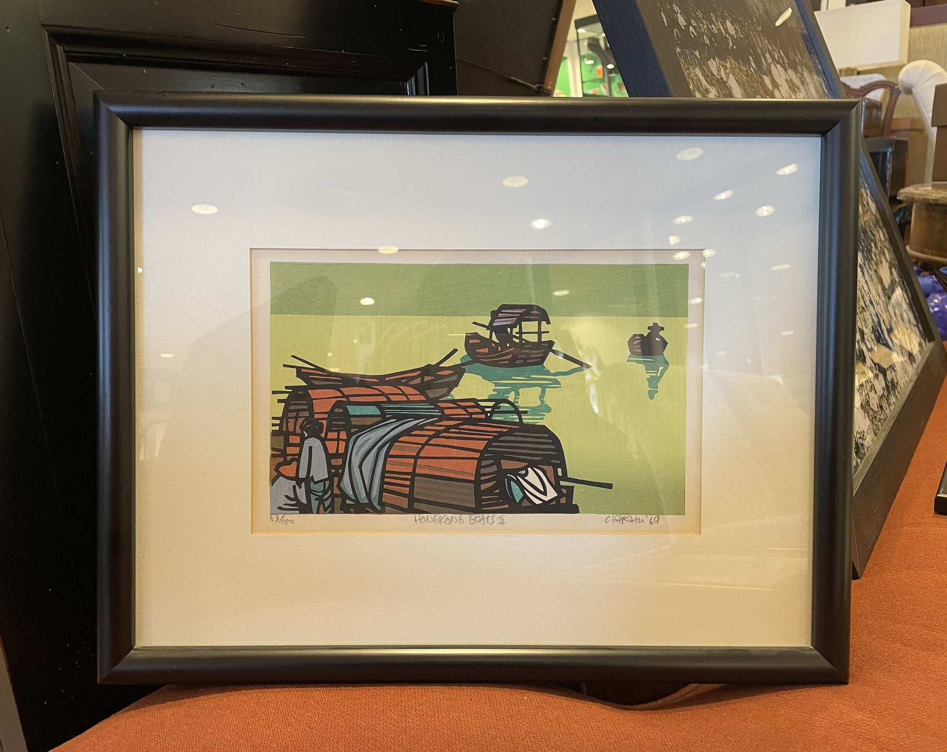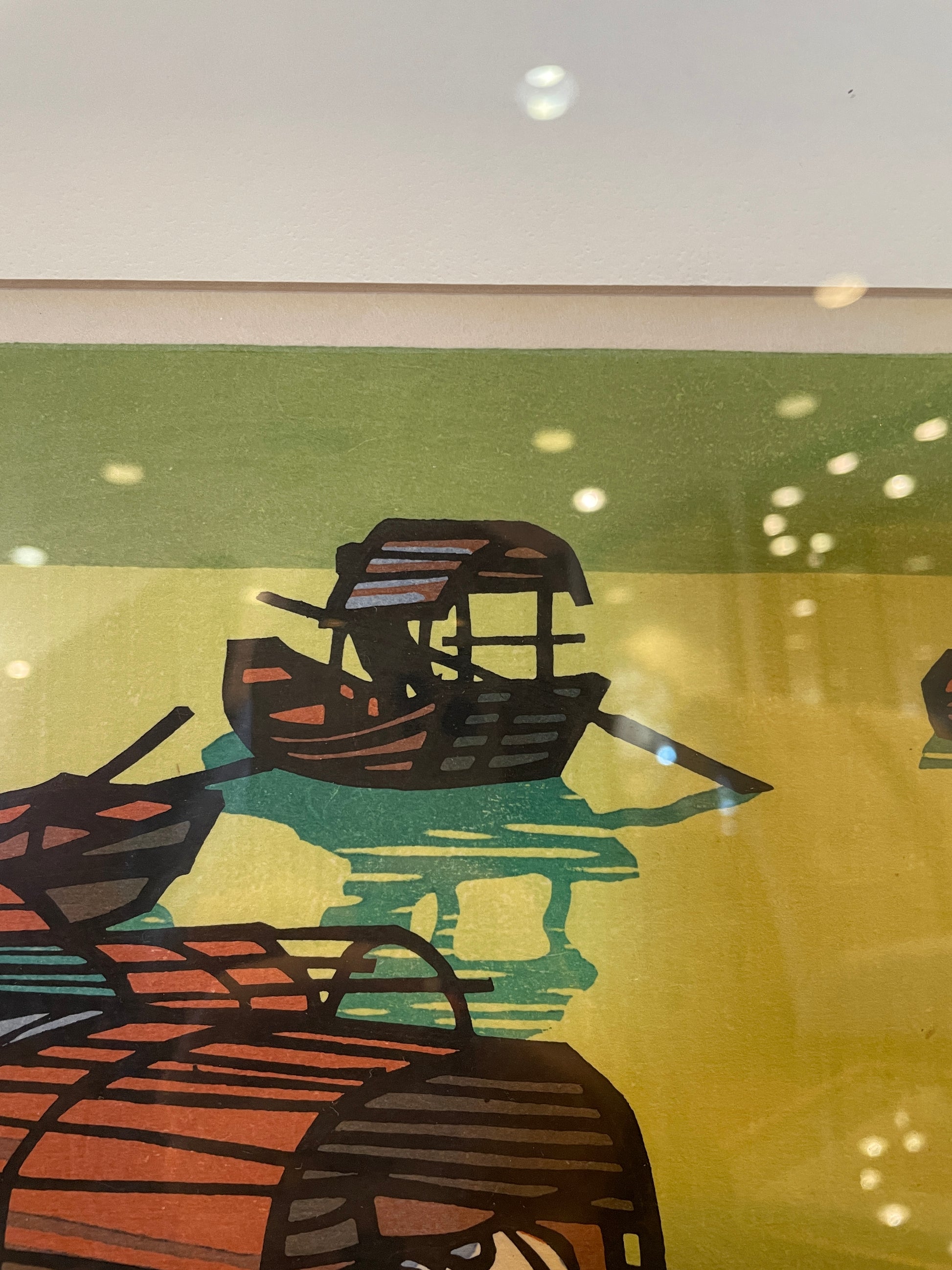 Clifton Karhu "Hong Kong Boats" woodblock print. Numbered (63/100) lower left, signed and dated lower right. This print depicts a flotilla of boats on a green background. The piece includes two figures standing in the lower left. The bold geometric lines and vibrant colors make this an eye catching work of art sure to elevate any space. The piece is set on a white mat and held in a black frame. A beautiful work of art that's sure to add a Japanese style flair to any space.