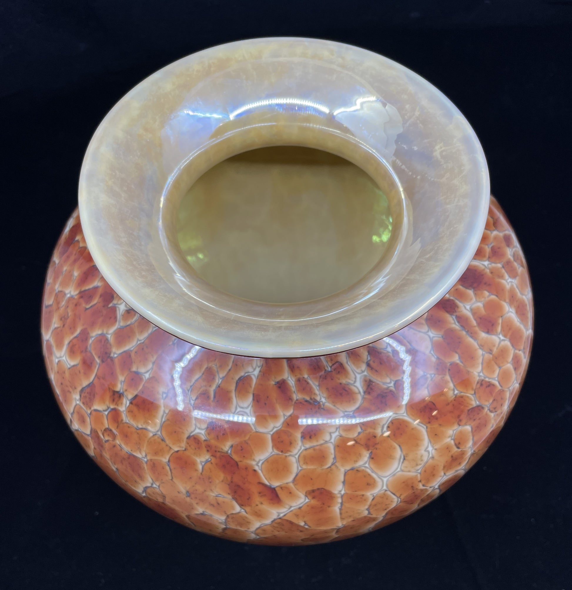 Cohn-Stone tortoise shell glass vase. Signed on the bottom. This beautiful hand-blown glass vase features a bulbous shape with a neck that tapers inwards and then tapers back outwards into a broad mouth. The vase is primarily orange in color with a tortoiseshell pattern that includes shades of white and brown. The interior of the vase is a cream color with an iridescent finish. A beautiful vase sure to add a pop of color and artistic charm to a space.