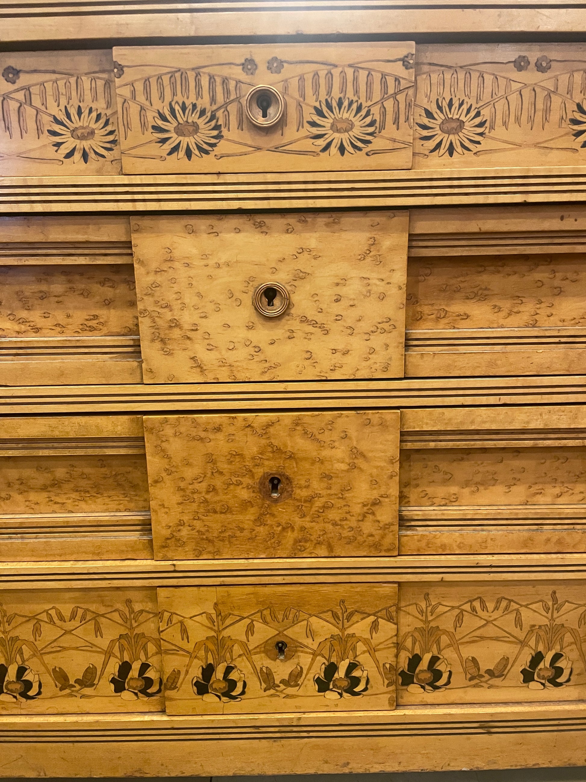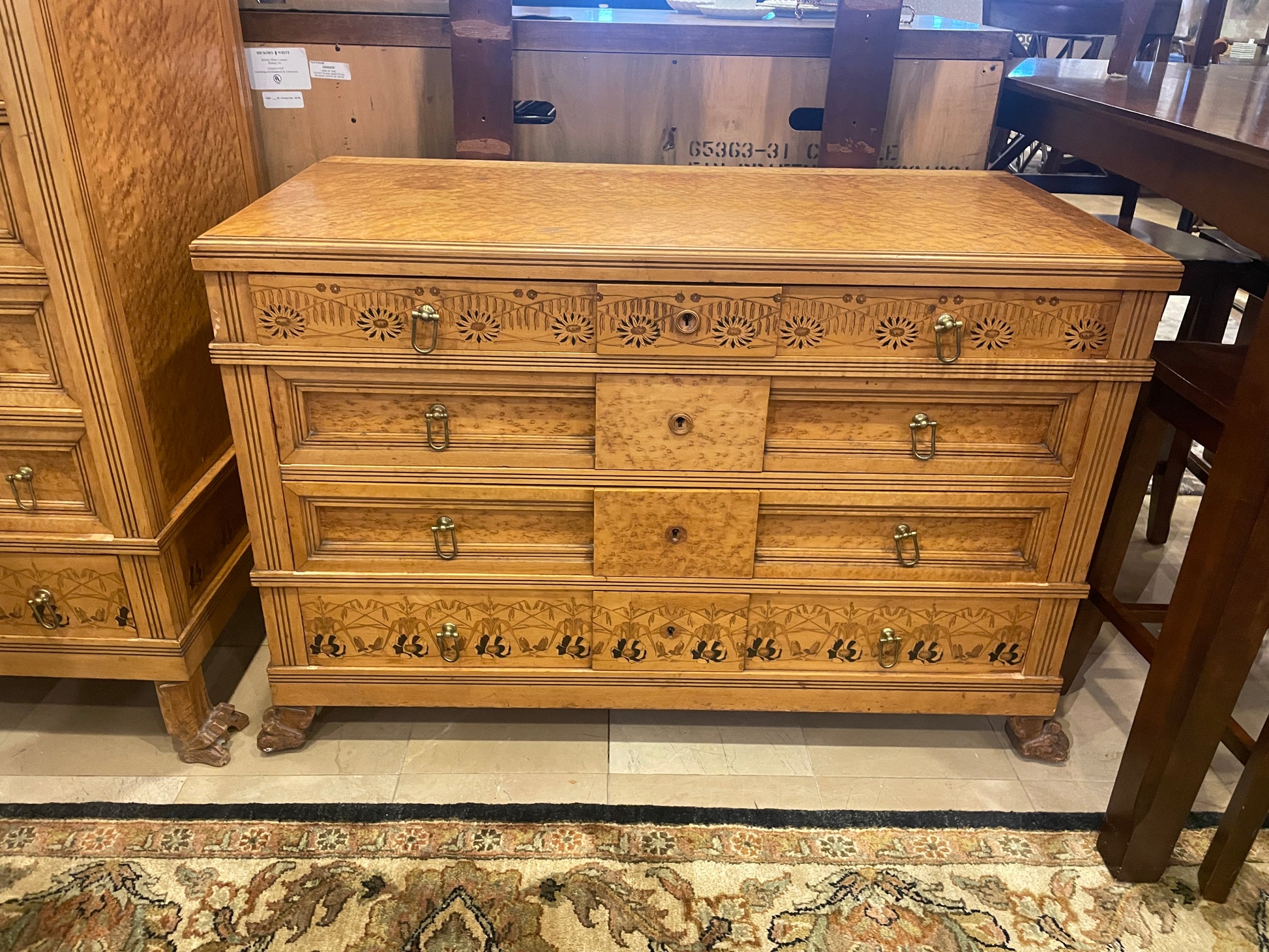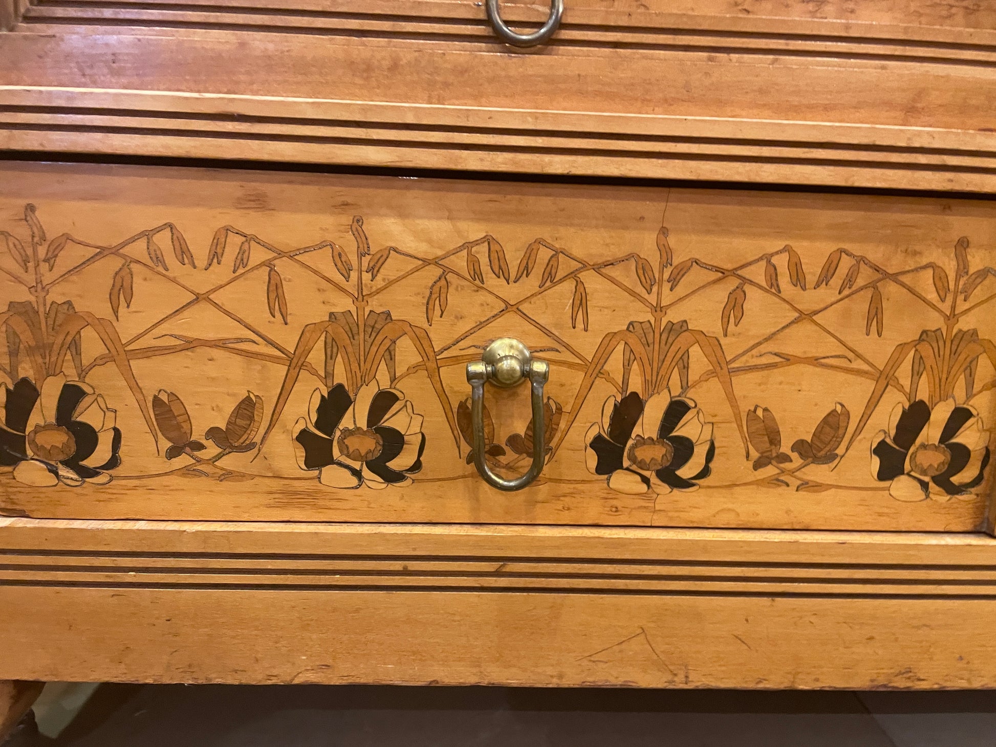 Continental 19th century Birdseye maple with marquetry dresser with mirror. (Mirror not pictured, contact us for details.) This maple dresser has four drawers, each of which has two small brass pull handles. Keyholes adorn the centers of the drawers. The beautiful maple wood of this piece has marquetry designs and Birdseye details. The piece sits on claw feet. The interiors of the drawers of this piece are a vibrant green color. The mirror to this piece is rectangular and has a matching maple wood border. This unique piece is full of detail and charm.