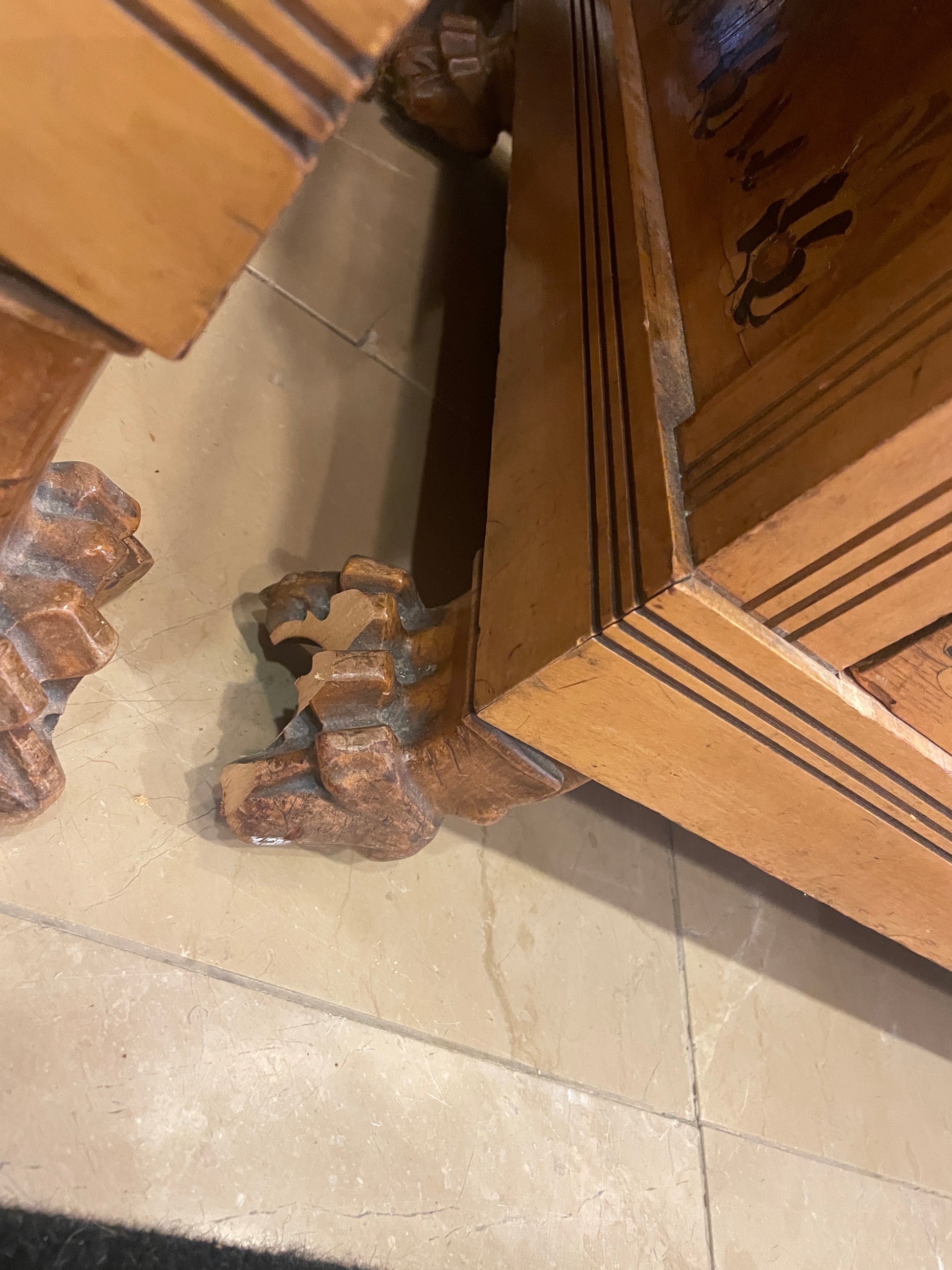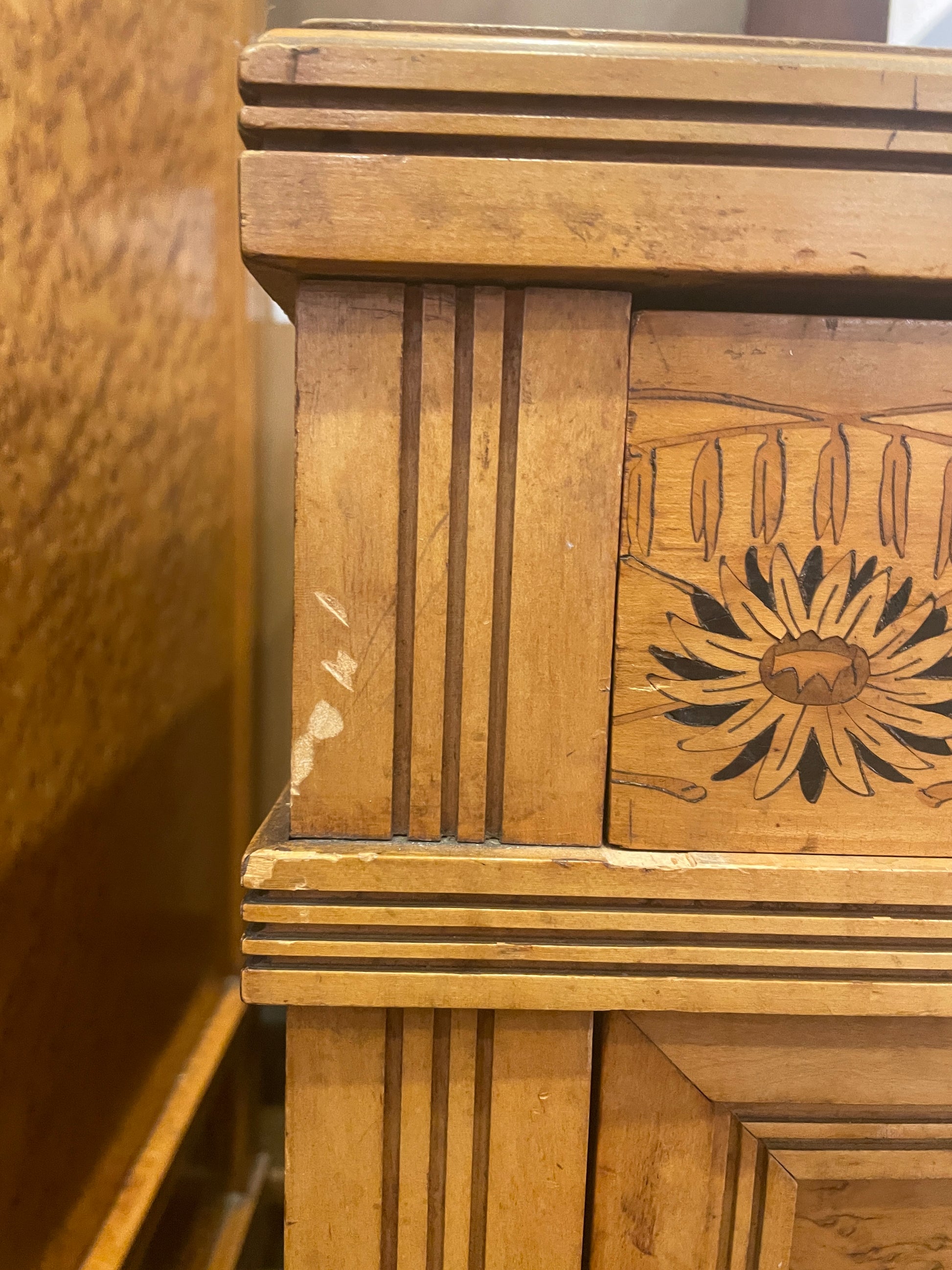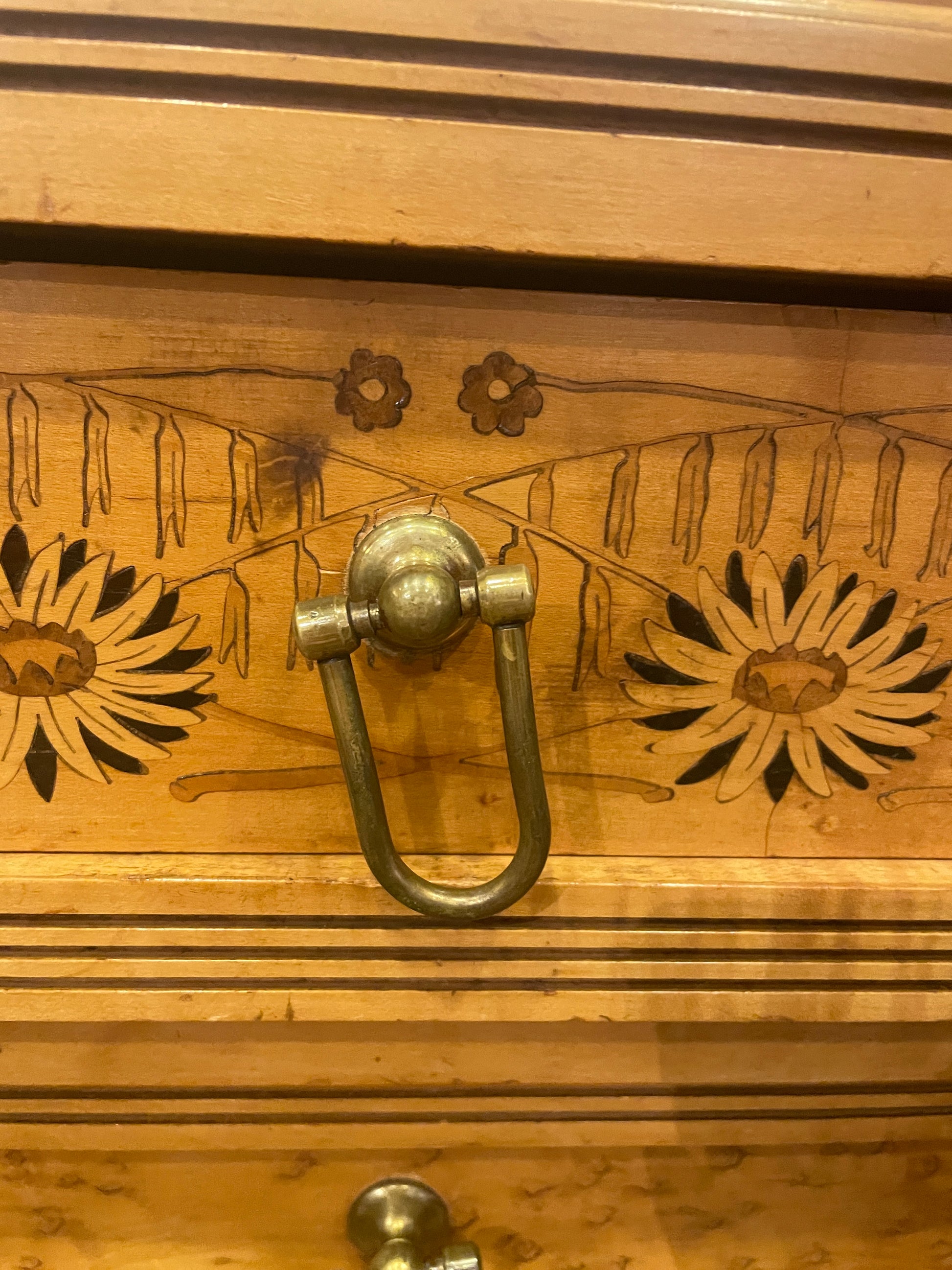 Continental 19th century Birdseye maple with marquetry dresser with mirror. (Mirror not pictured, contact us for details.) This maple dresser has four drawers, each of which has two small brass pull handles. Keyholes adorn the centers of the drawers. The beautiful maple wood of this piece has marquetry designs and Birdseye details. The piece sits on claw feet. The interiors of the drawers of this piece are a vibrant green color. The mirror to this piece is rectangular and has a matching maple wood border. This unique piece is full of detail and charm.