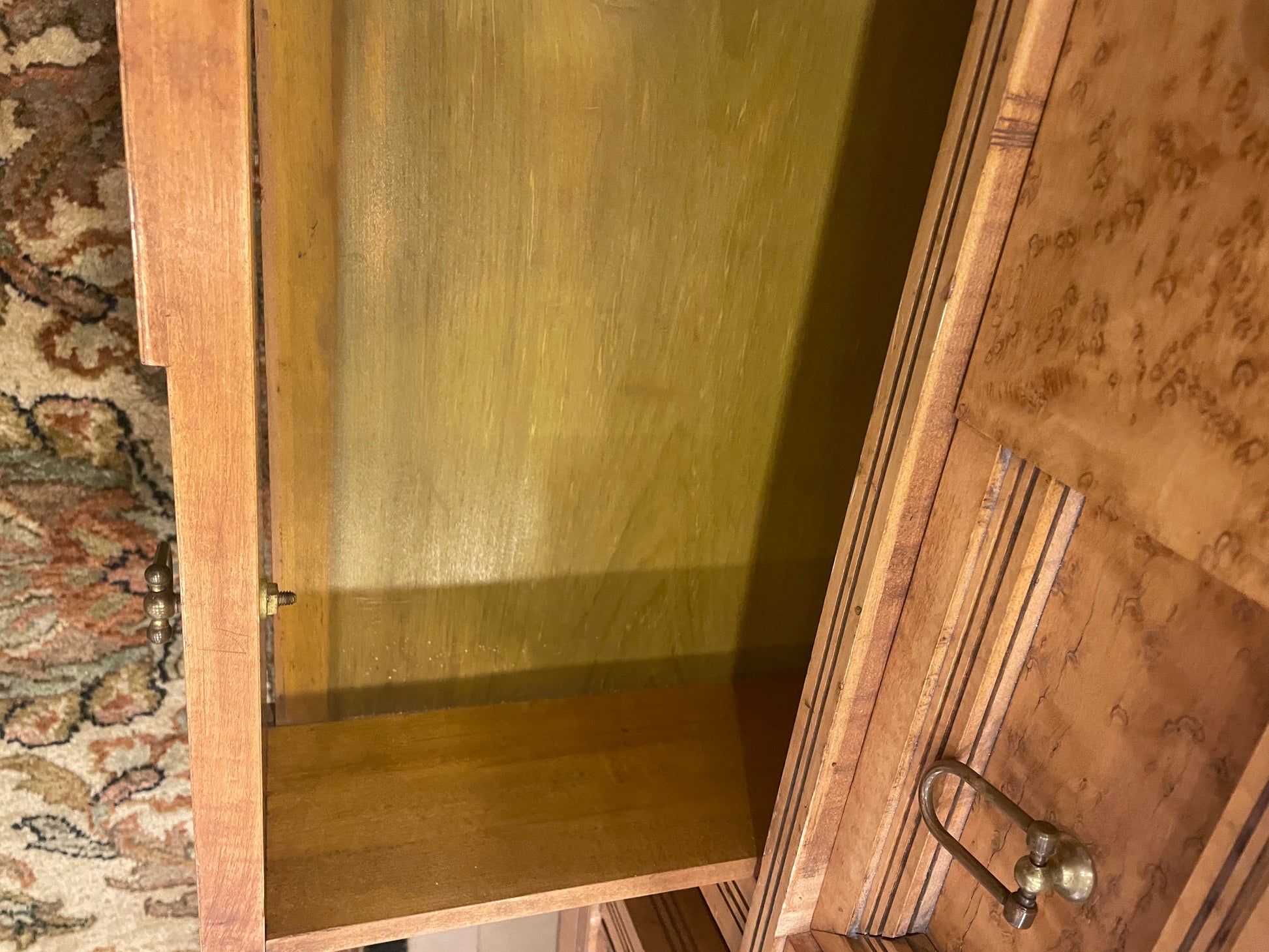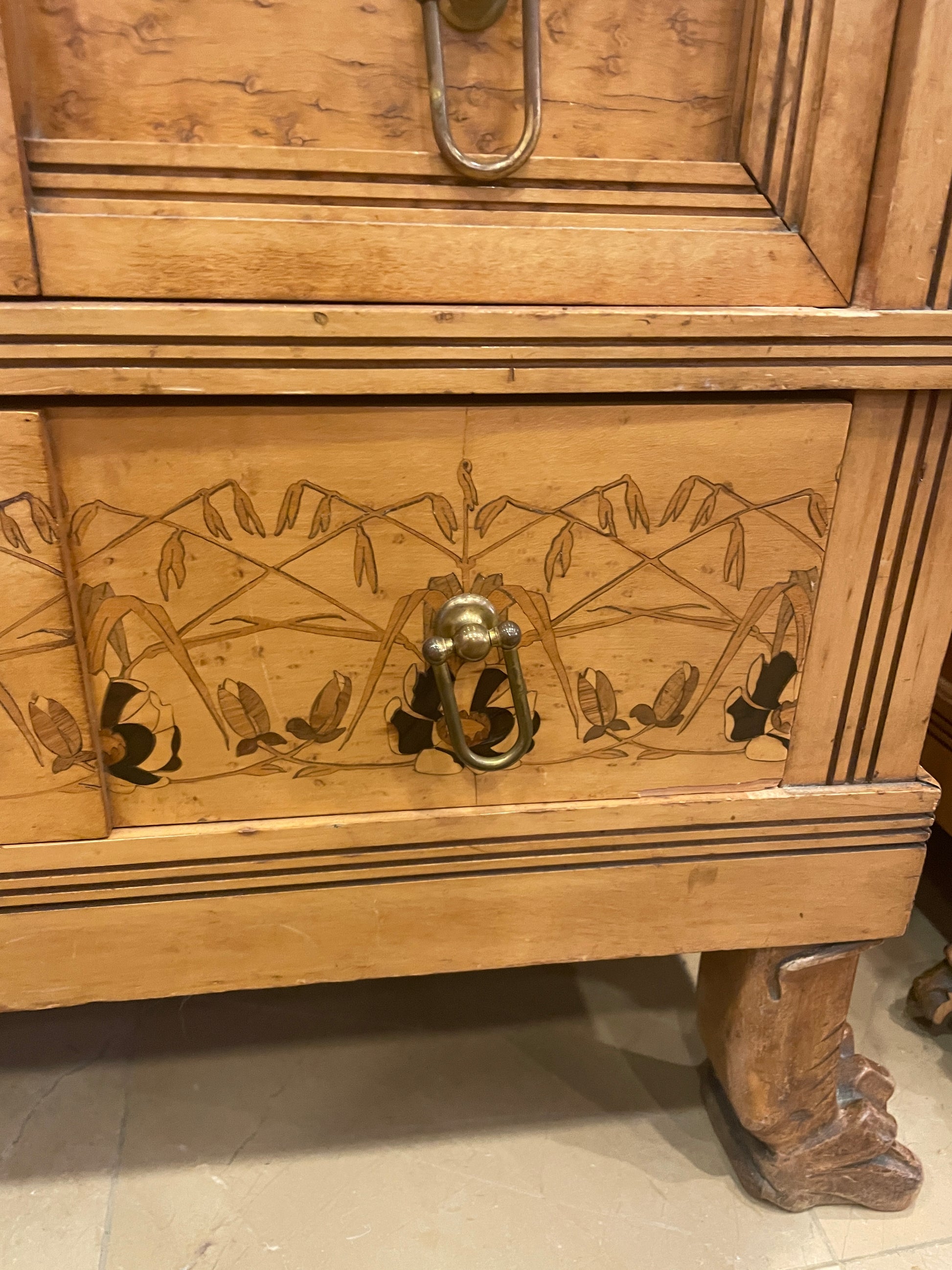 Continental 19th century Birdseye maple with marquetry dresser. This maple dresser has seven drawers, each of which has two small brass pull handles. Keyholes adorn the centers of the drawers. The beautiful maple wood of this piece has marquetry designs and Birdseye details. The piece sits on claw feet. The interiors of the drawers of this piece are a vibrant green color. This unique piece is full of detail and charm.