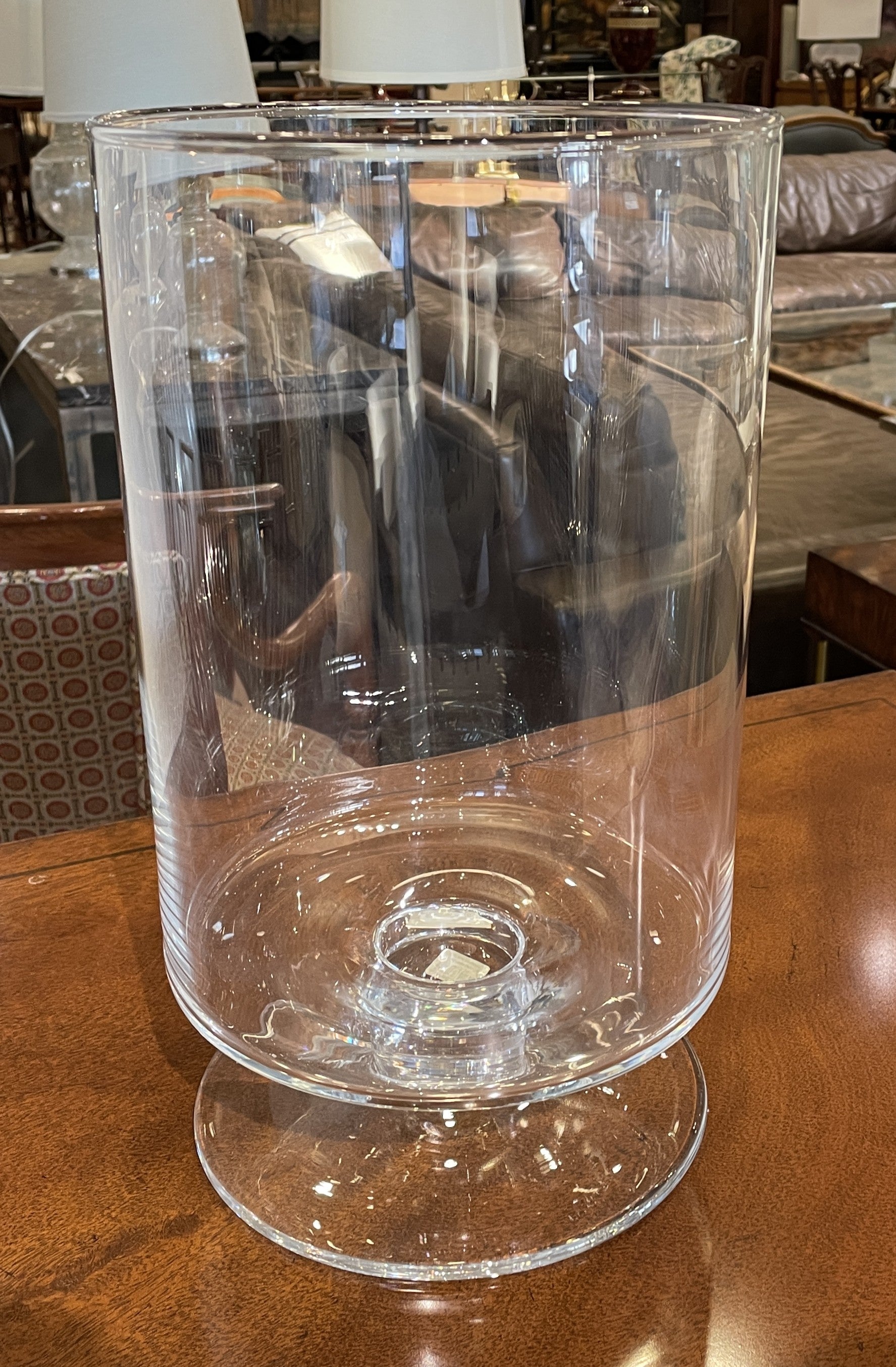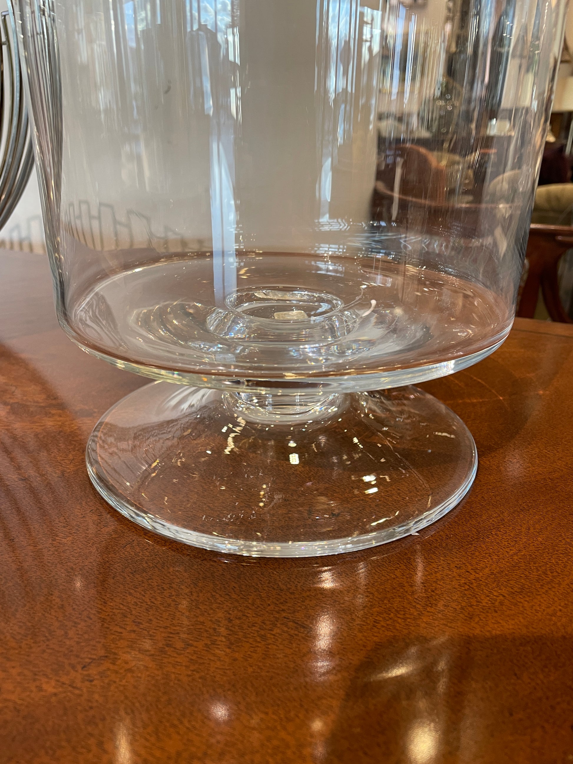 Crate and Barrel London hurricane candle holder. This elegant piece has a footed design with a short, smooth stem. The bowl of the holder is slightly wider than the foot and stands tall in comparison to the stem. A beautiful piece with a simple design that is sure to elevate a space.