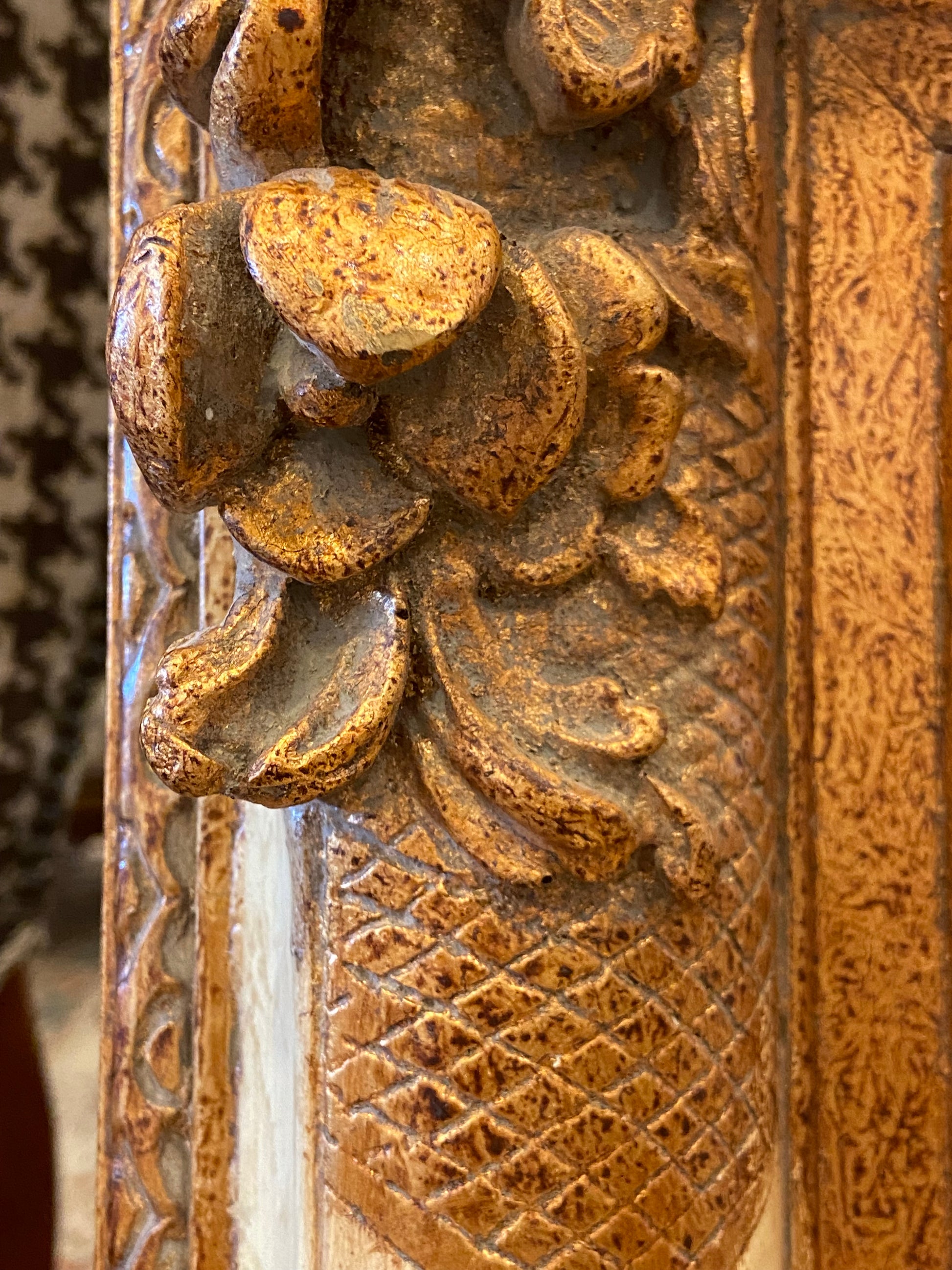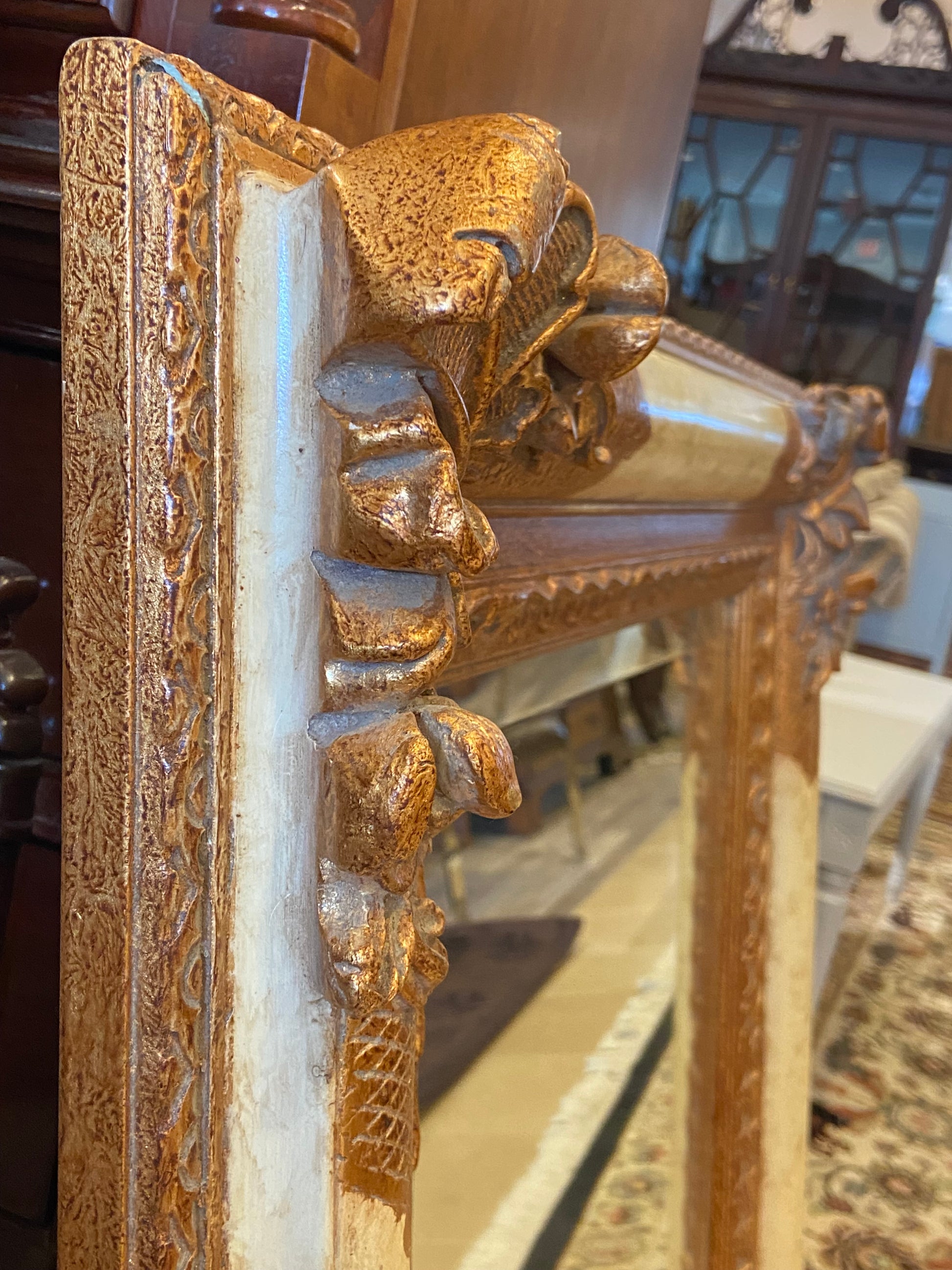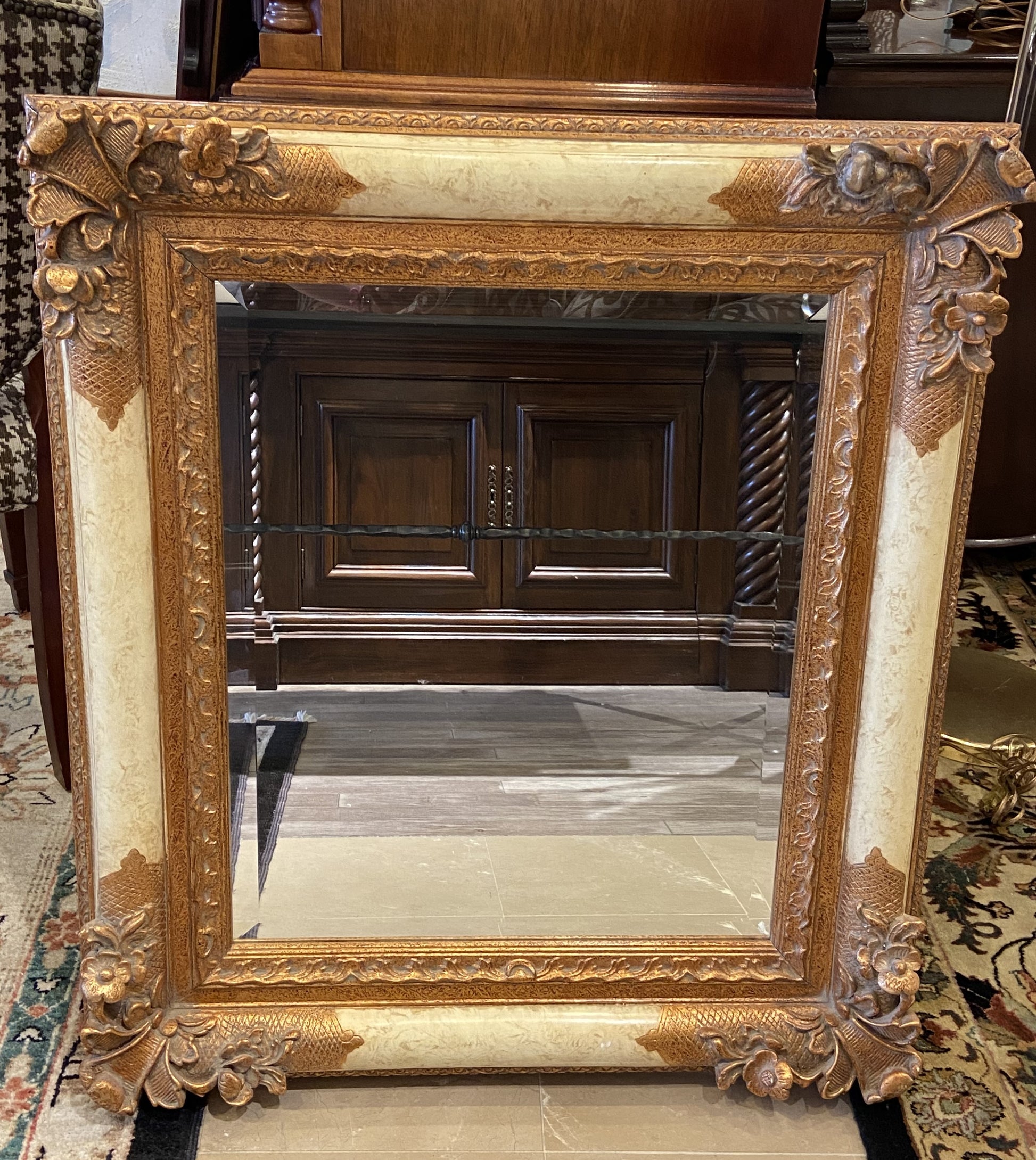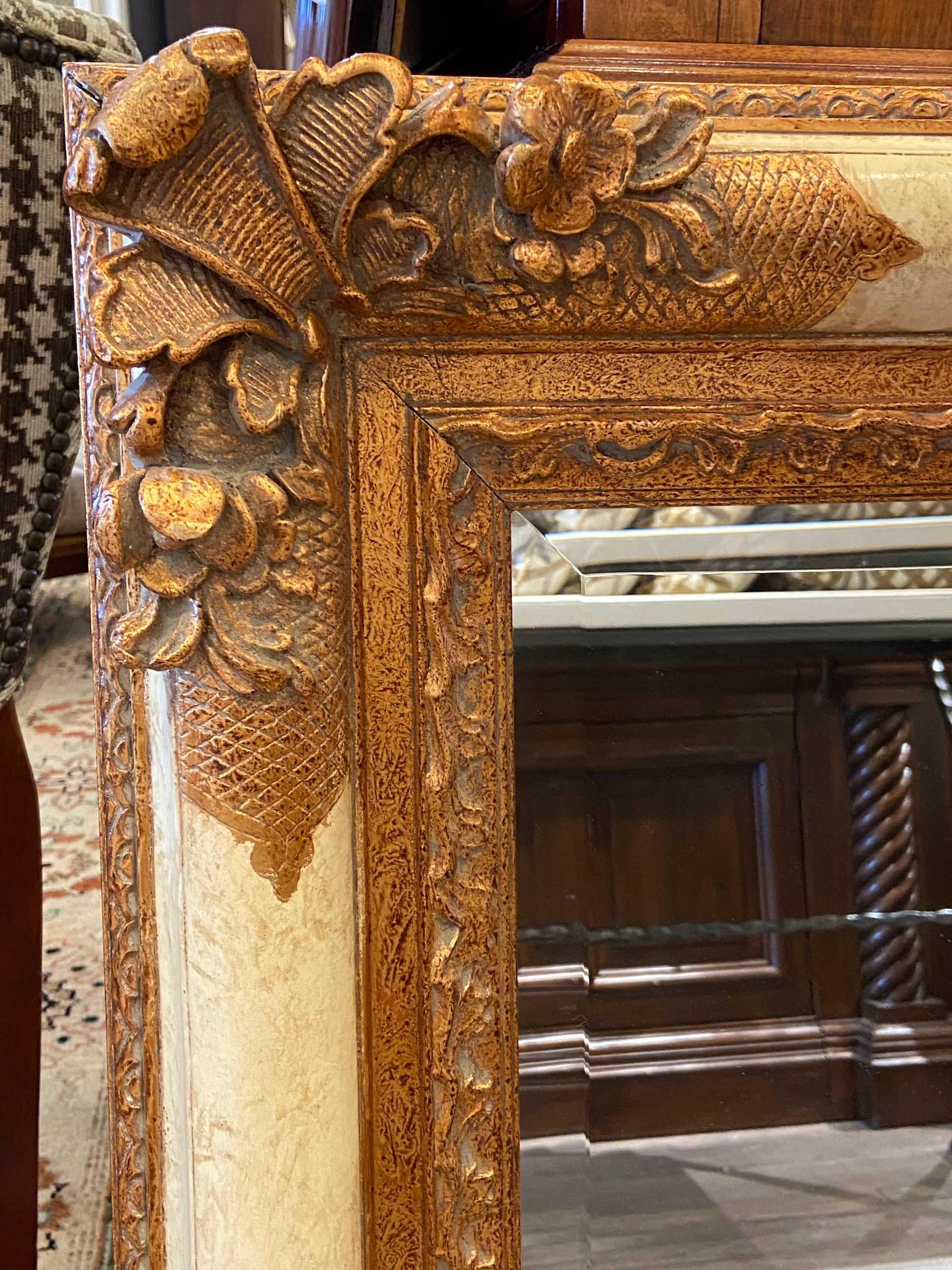 Mirror features a cream frame with floral gilded details on the inner frame, outer frame, and corners. Mirror has a rectangular shape with beveled edges.