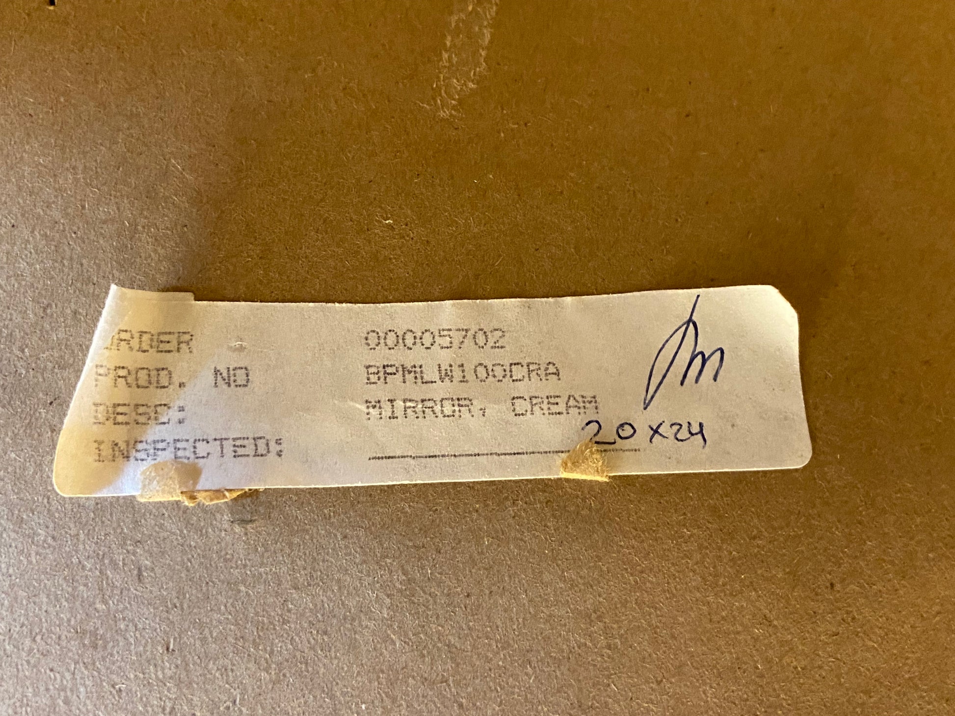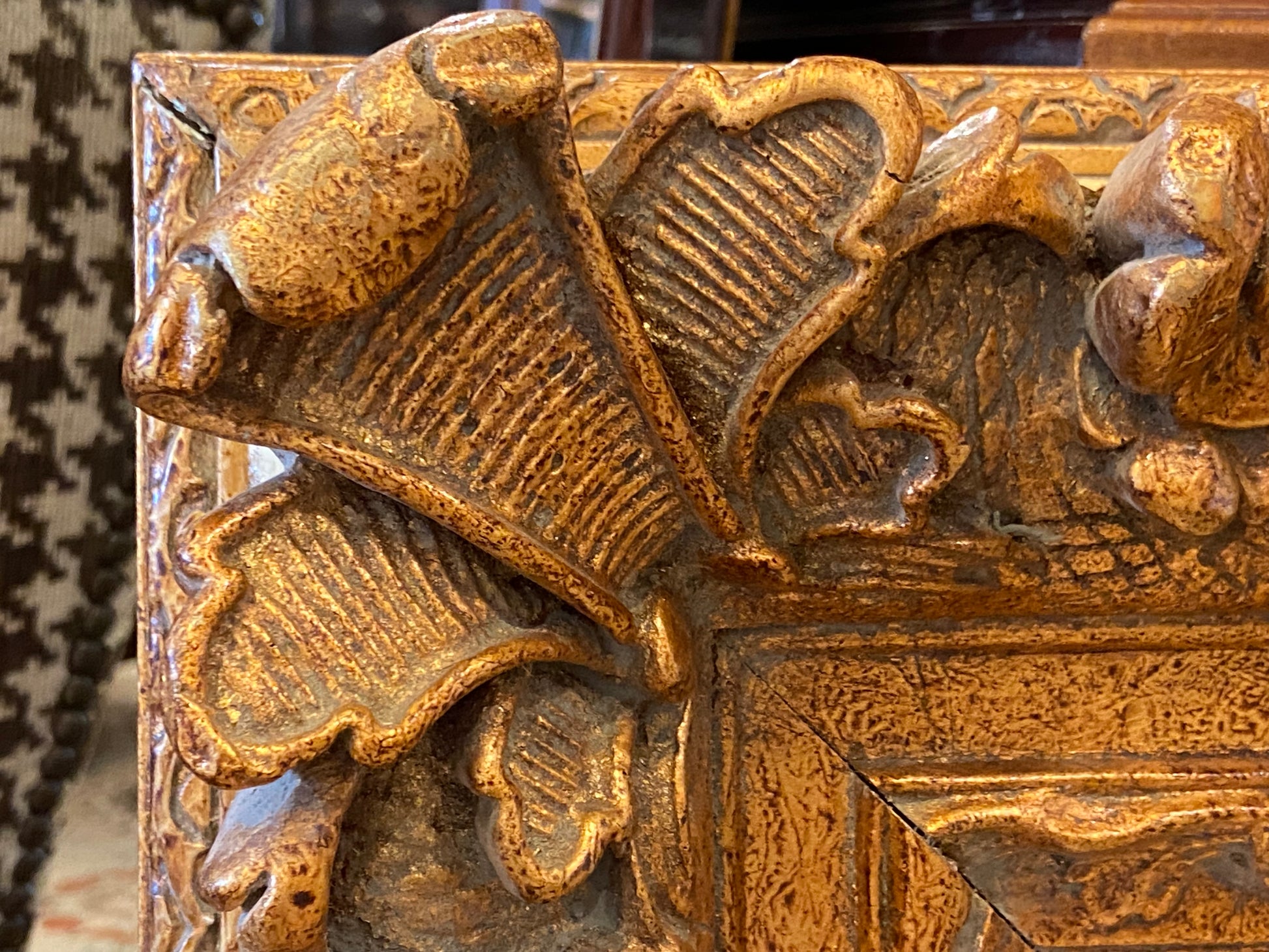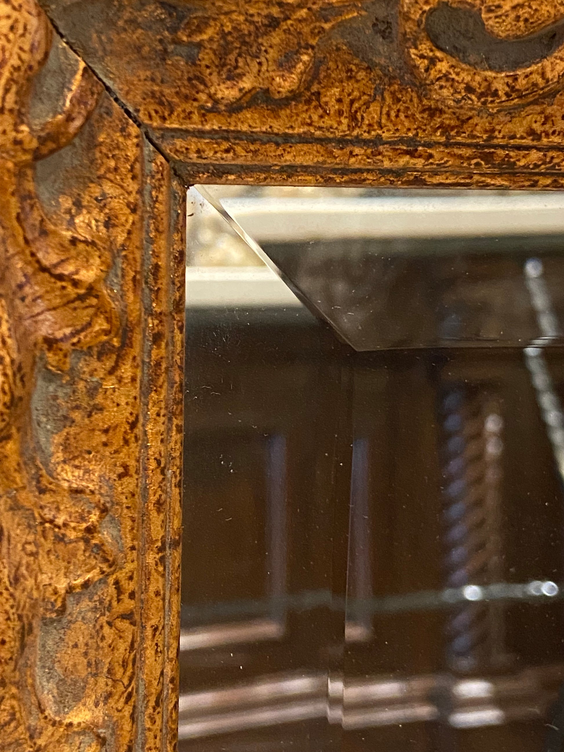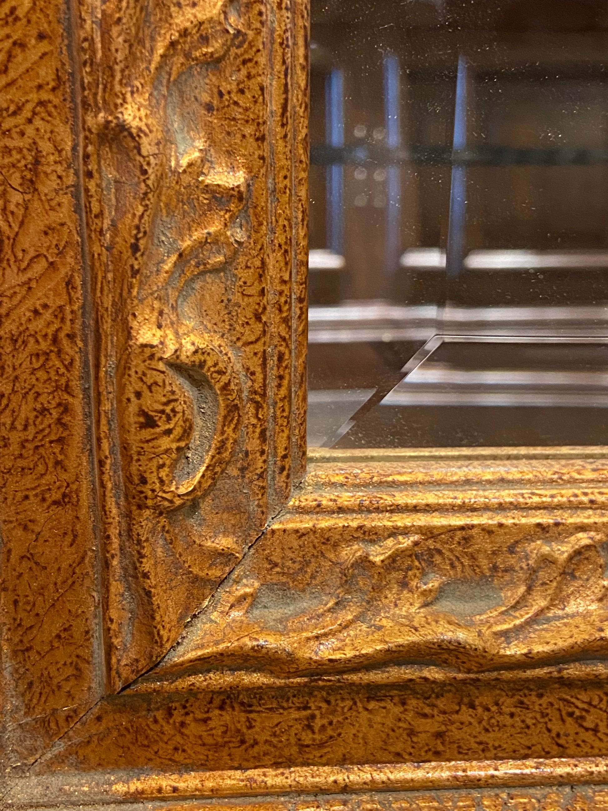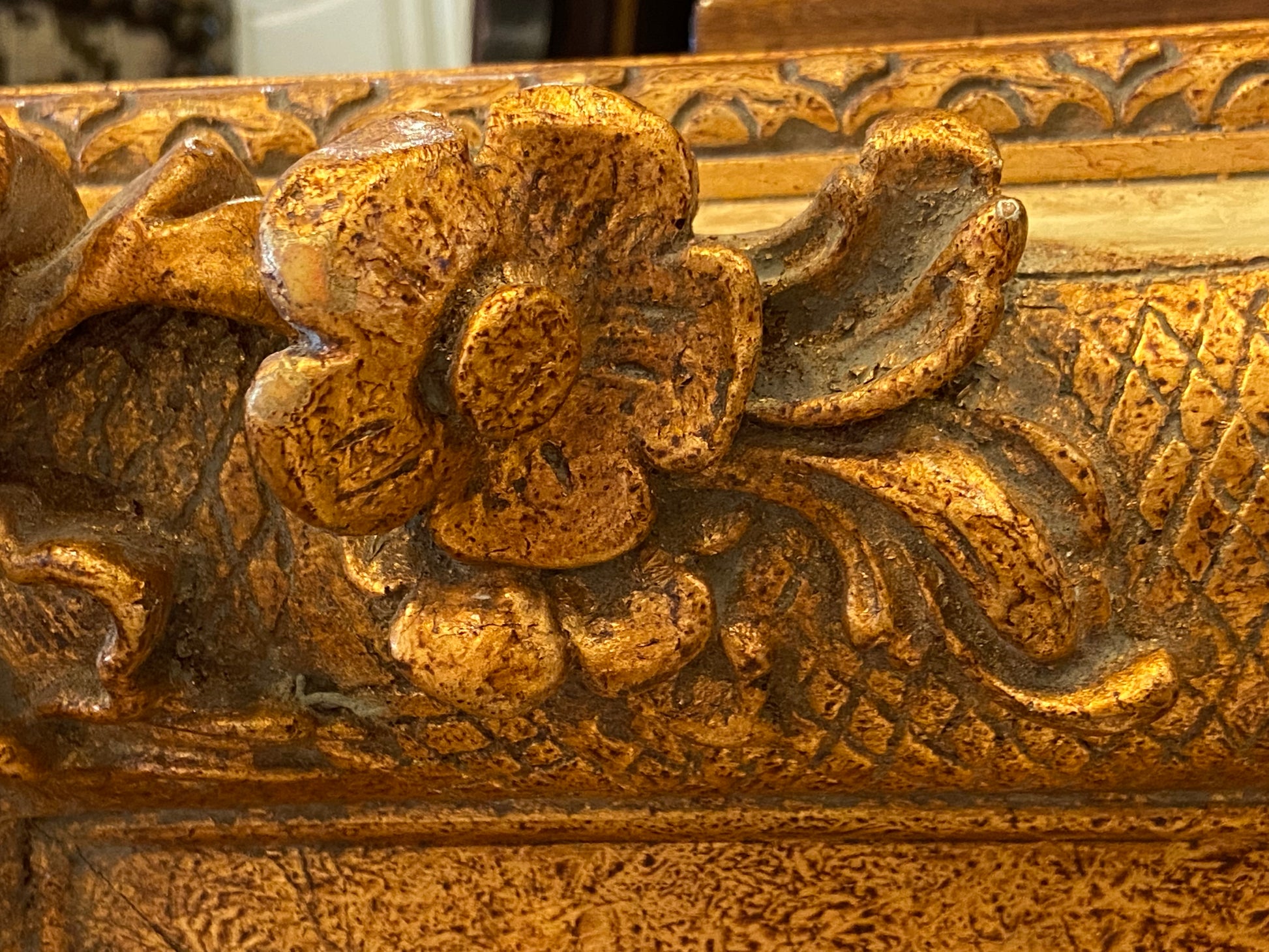 Mirror features a cream frame with floral gilded details on the inner frame, outer frame, and corners. Mirror has a rectangular shape with beveled edges.