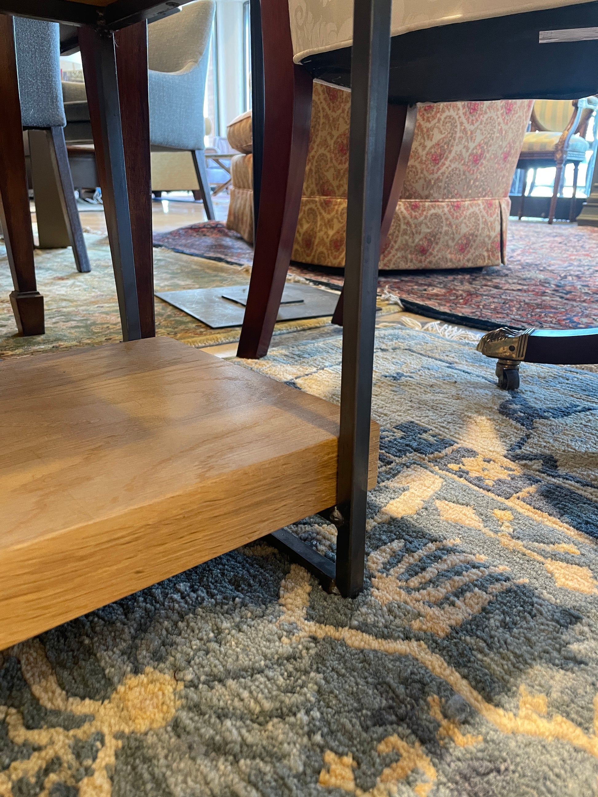 Croft House custom railcar console. This industrial style console features three tiers of light toned wood shelves supported by an iron frame. The back of the console has a cross brace for added design. A beautiful and versatile piece that boasts both storage and design.