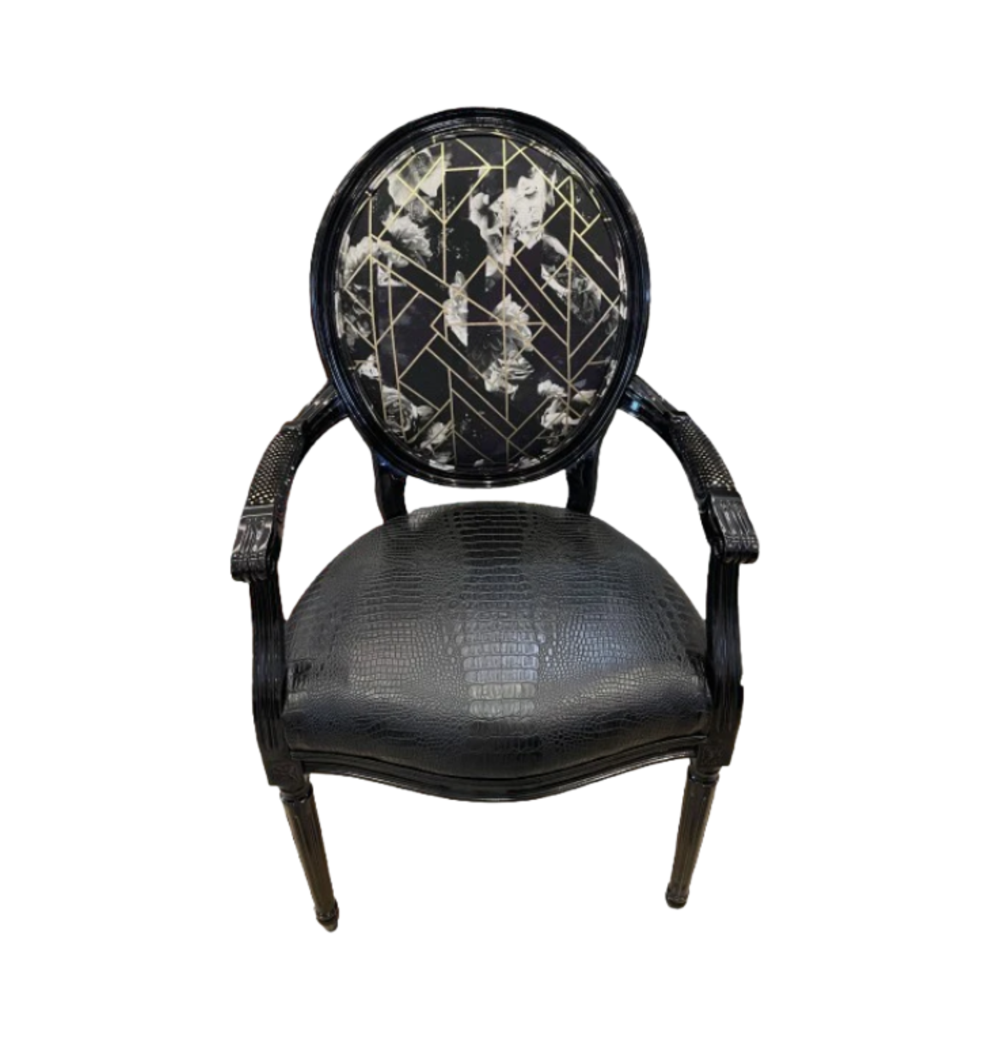 Glamorous black and gold boudoir chair. Features a rounded back and wooden frame painted in black with a glossy finish. A floral, geometric pattern is present on the chair back which pairs stunningly with the black snakeskin upholstery of the seat. Each arm has a black and gold sparkle upholstery that matches the chair back. The perfect way to add statement and glam to your space!