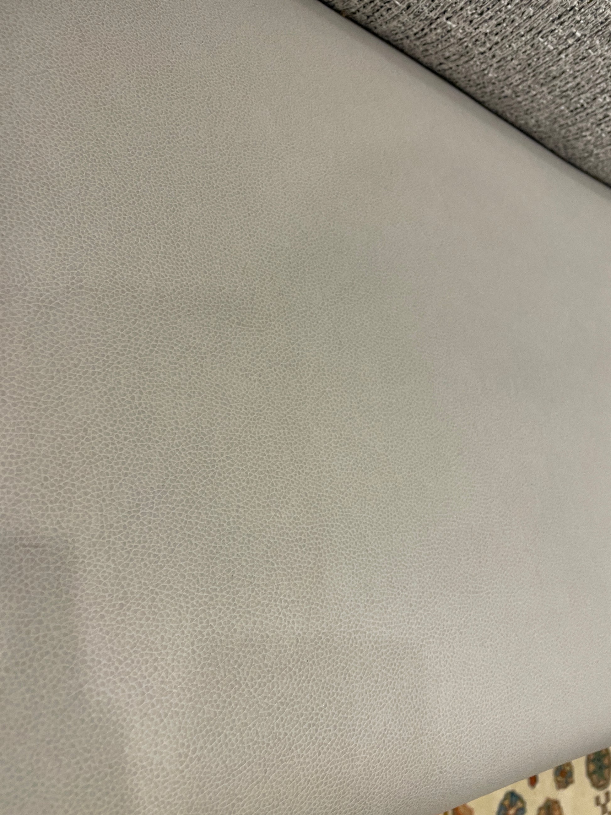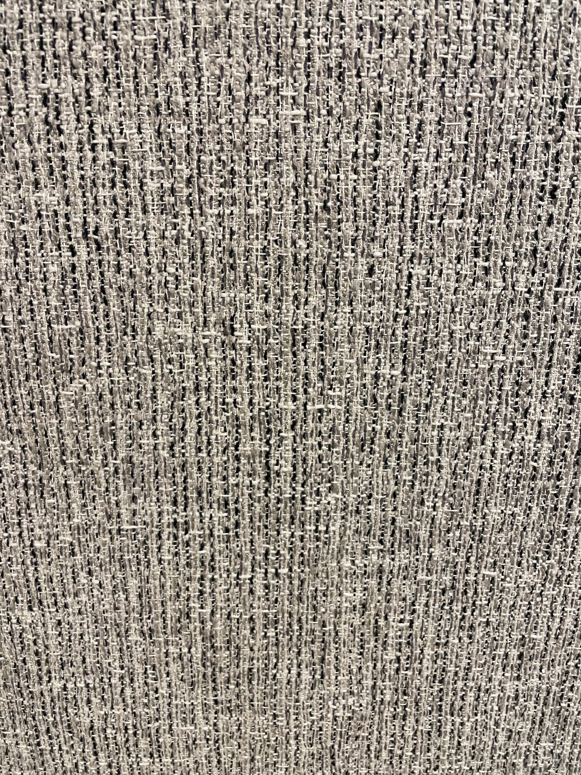 Modern custom banquette. This banquette with two sections features a stunning high back design. The banquette sits on tapered black wooden legs that hold up a white leather upholstered seat. The lower border of the seat is accented with a chrome nailhead trim. The high back of the banquette is upholstered with a comfortable heather gray soft fabric. The banquette's two pieces are not identical. The one side has a corner edge, and the other is more like a bench with no side framing pieces. A comfortable and chic seating arrangement that's sure to elevate a modern space.