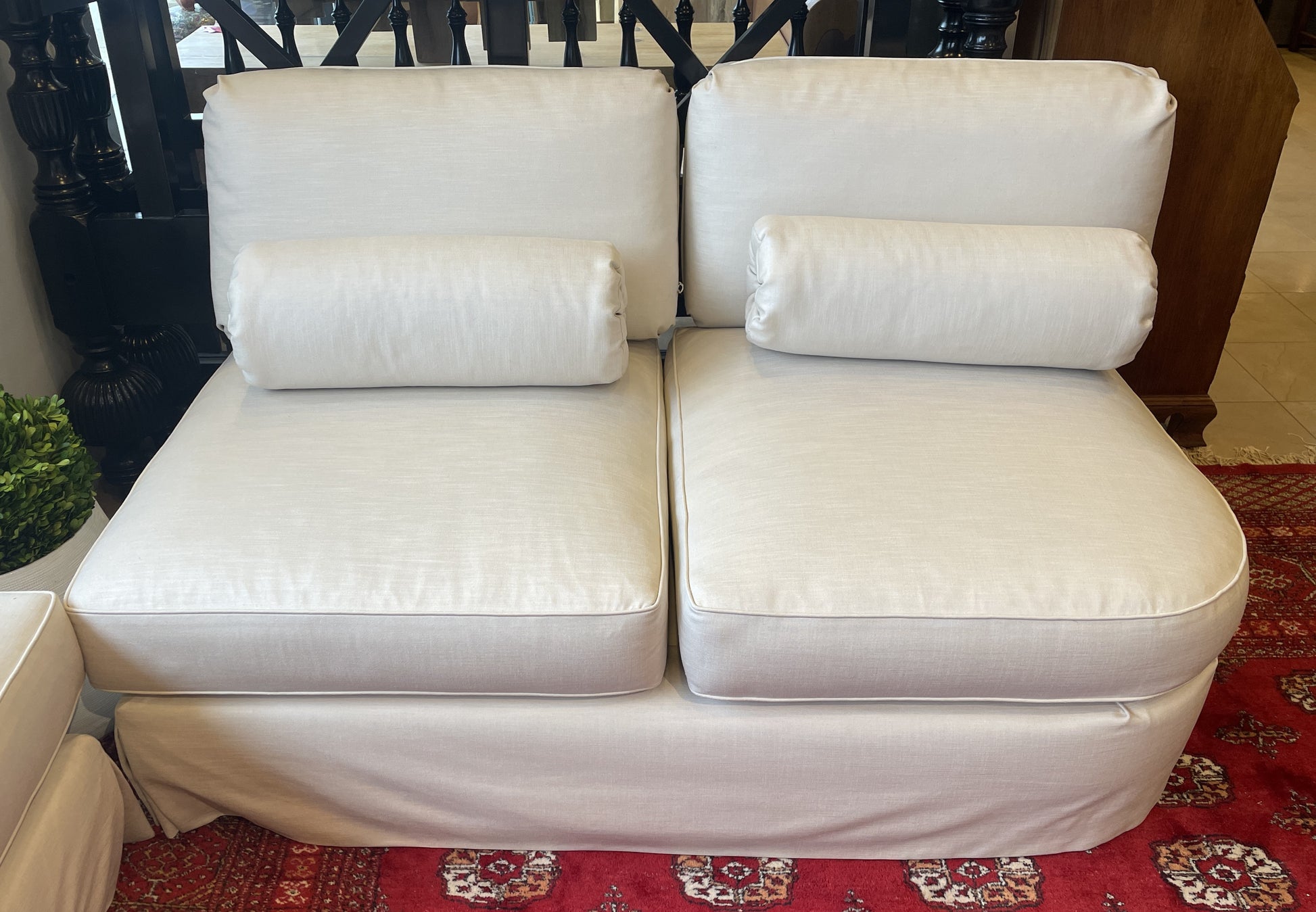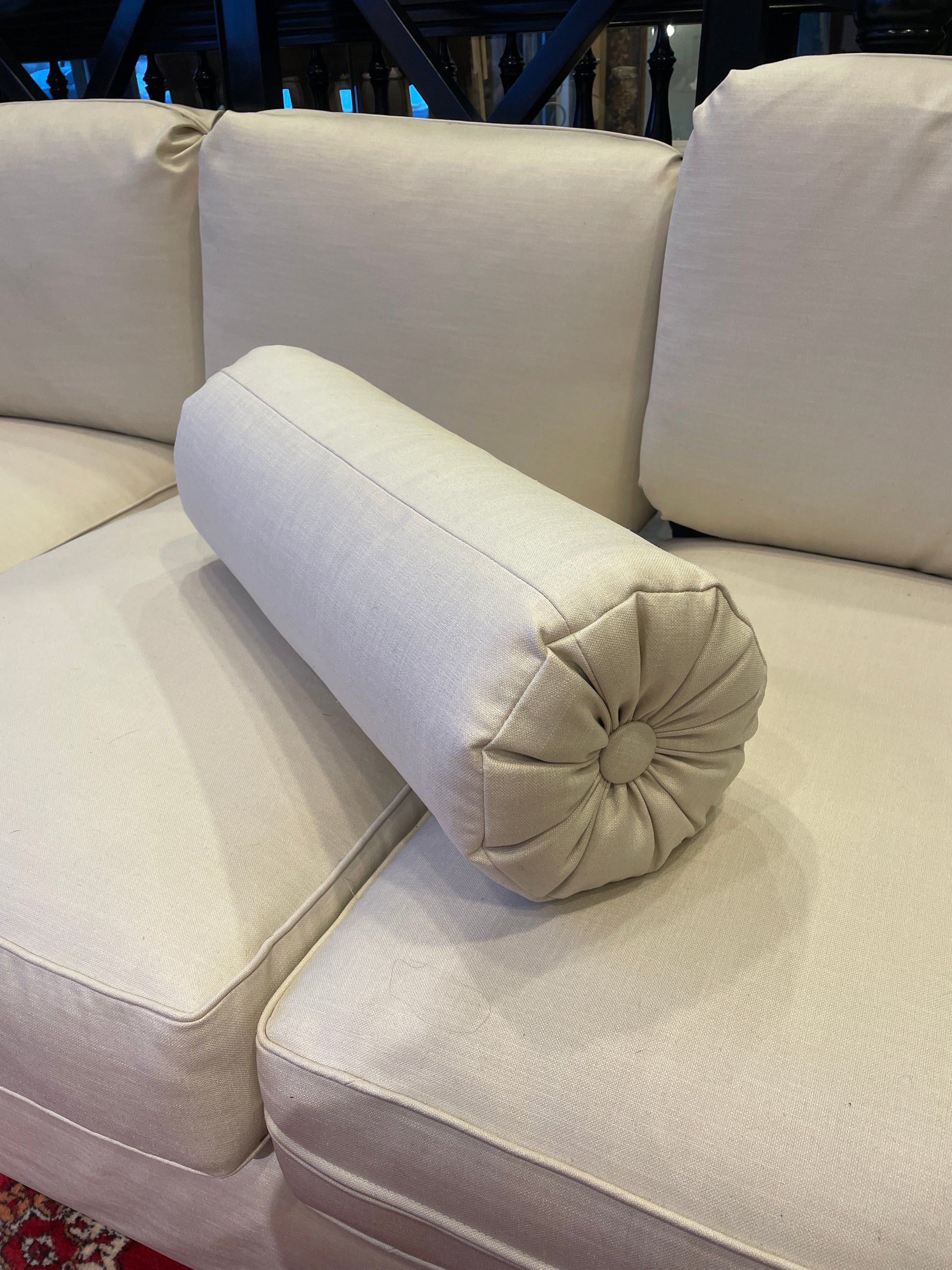 Custom linen banquette. This elegant banquette in white linen seats four. The banquette comes in two pieces - one longer and one shorter. The longer side has three seat cushions, and the shorter has two. The bottom of each piece has an apron that reaches the floor. Each seat has one freestanding back cushion that rests up against the wall along with a bolster pillow. A charming and comfortable piece that is perfect wrapped around a table.