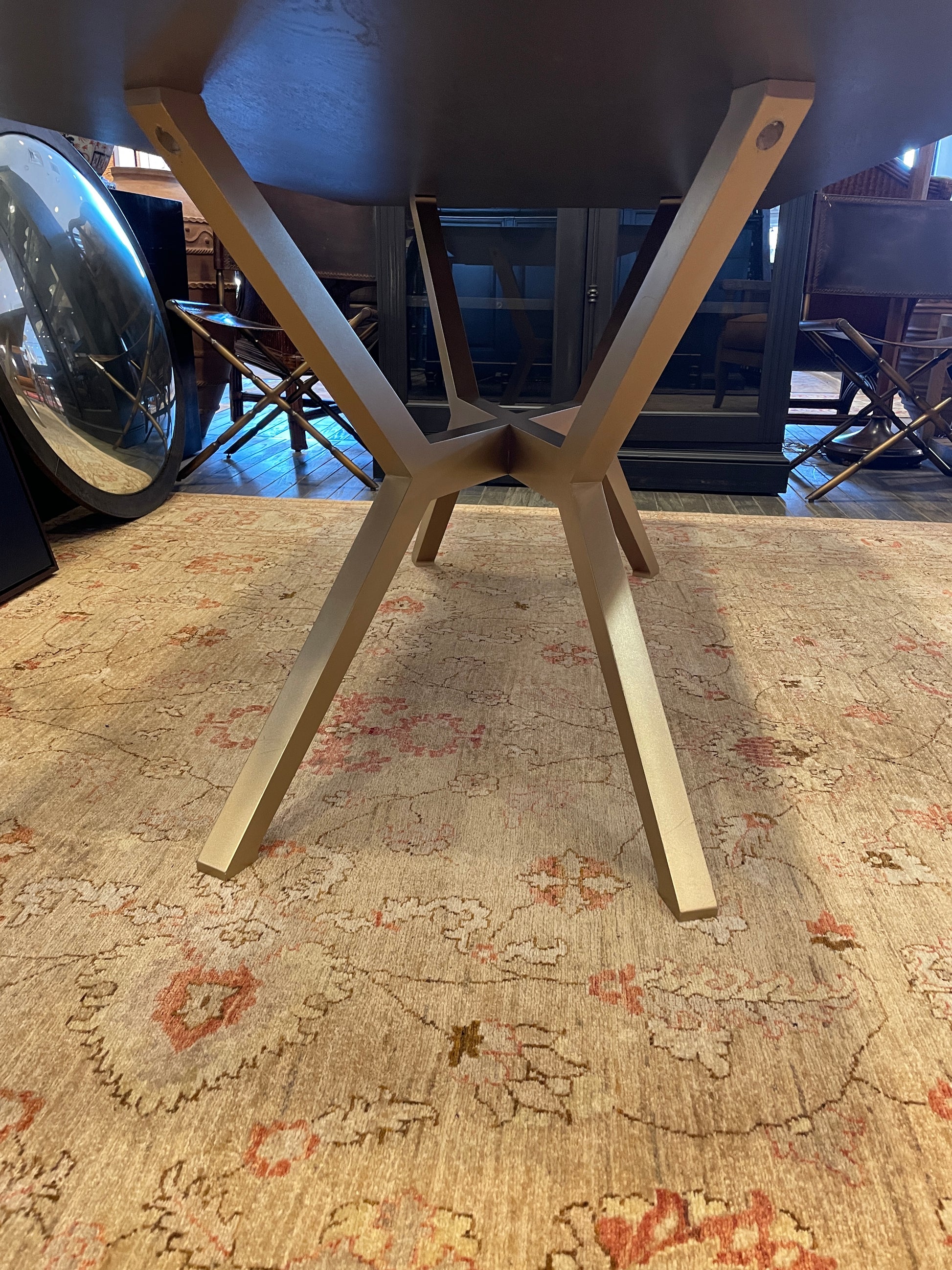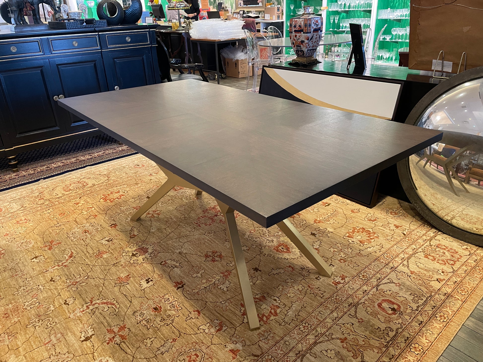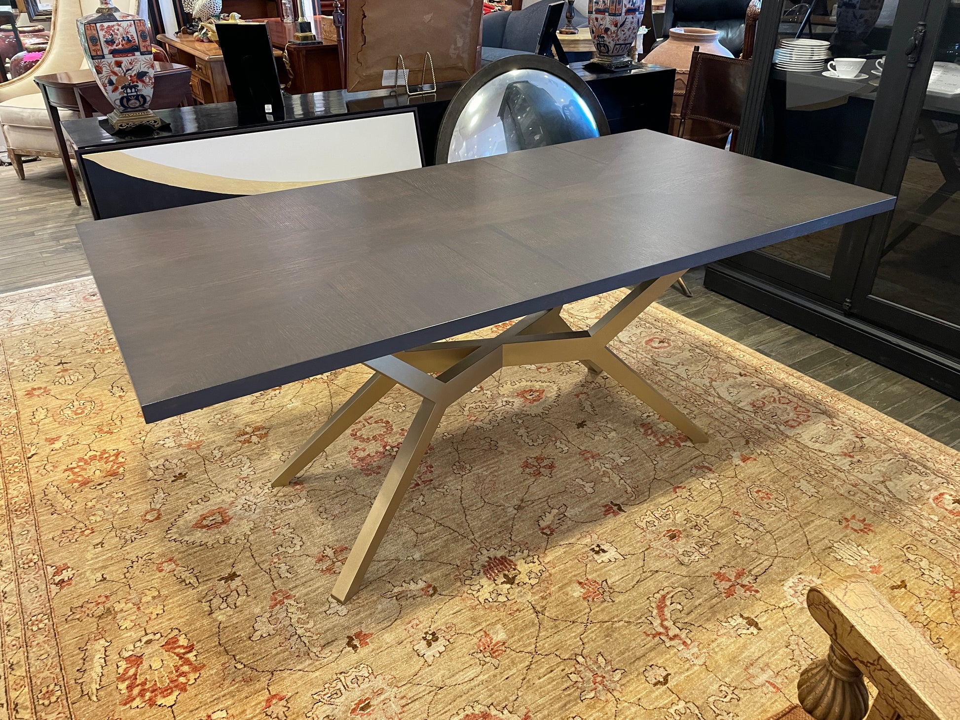 Modern custom dining table attributed to Restoration Hardware. This elegant table sits atop a gold colored frame in a unique shape. Four legs with an x-shaped side and front profile cross in the center and reach up to the tabletop. The tabletop is a dark wood with a smooth finish. An elegant and unique dining table that's sure to elevate a space.