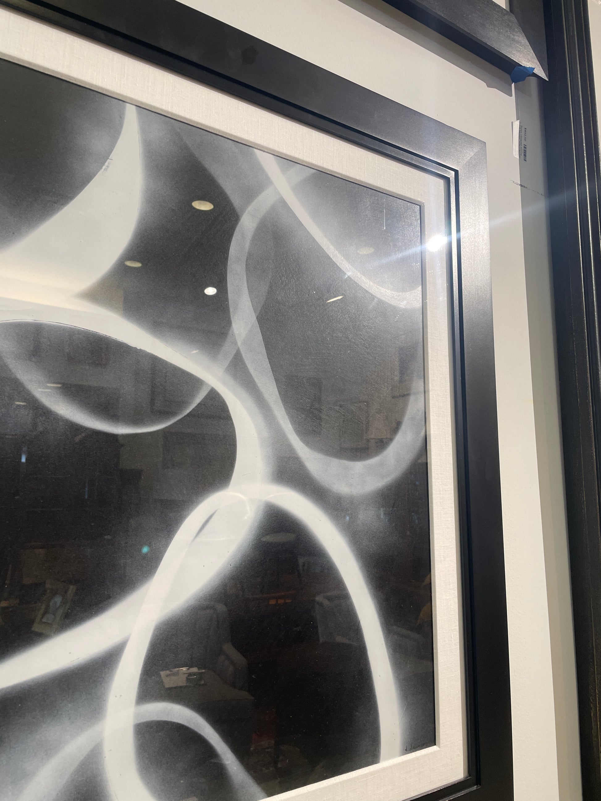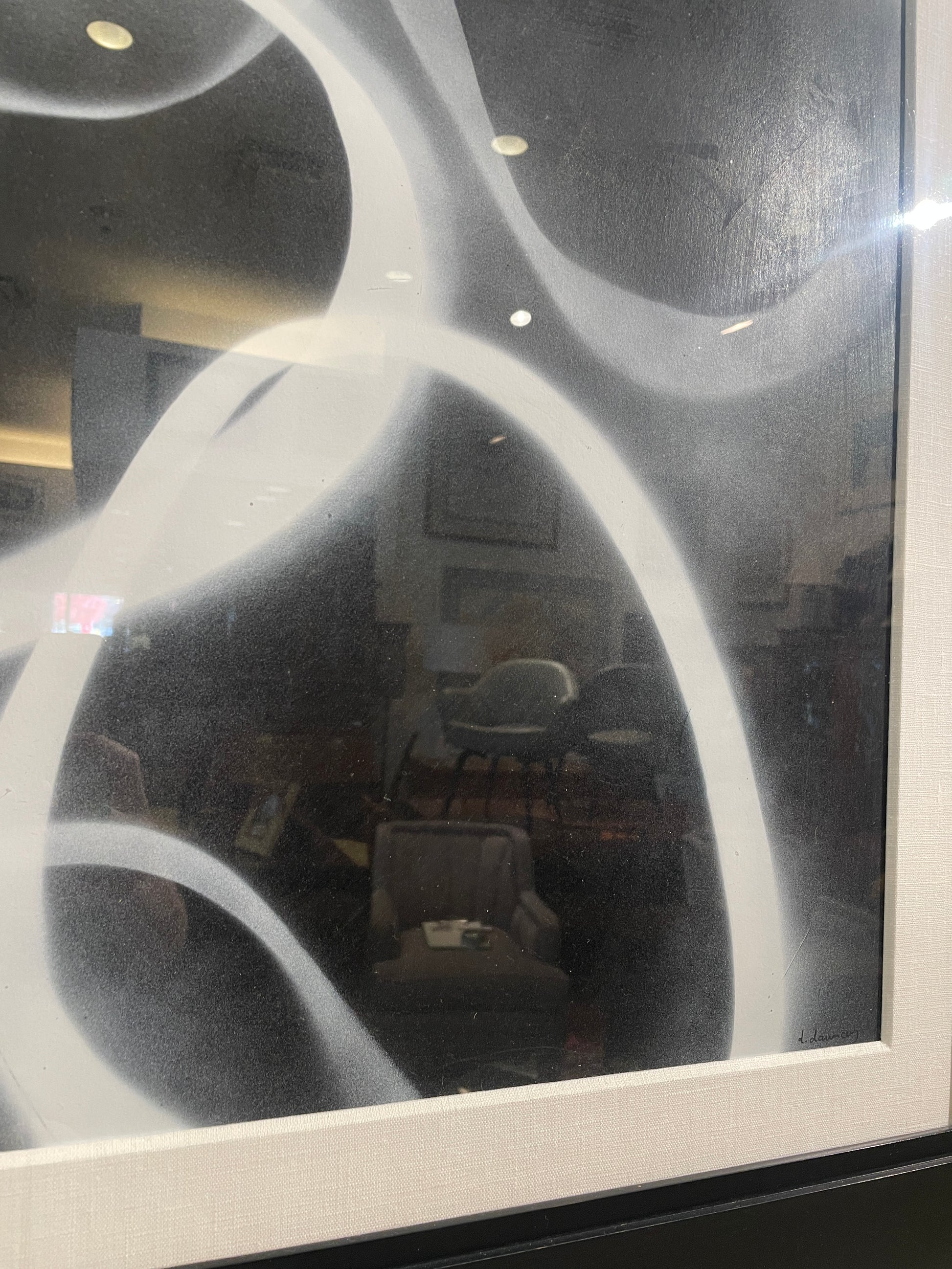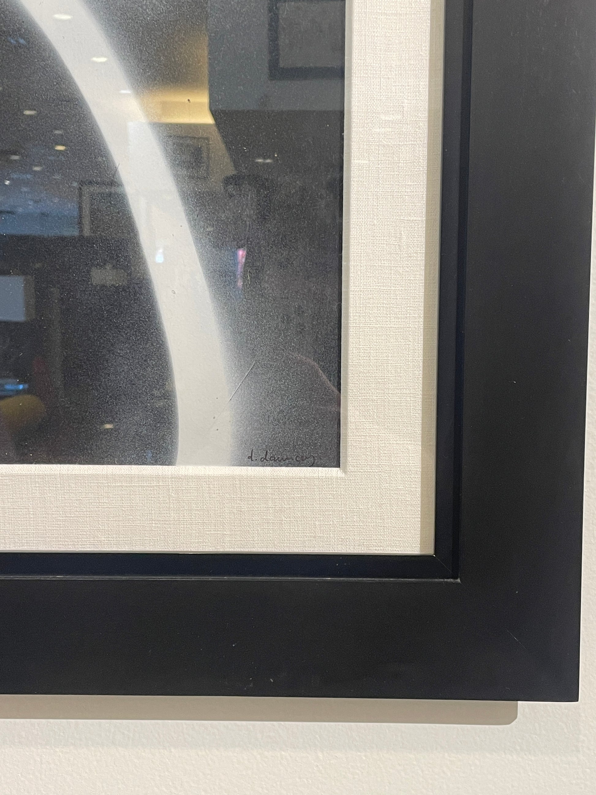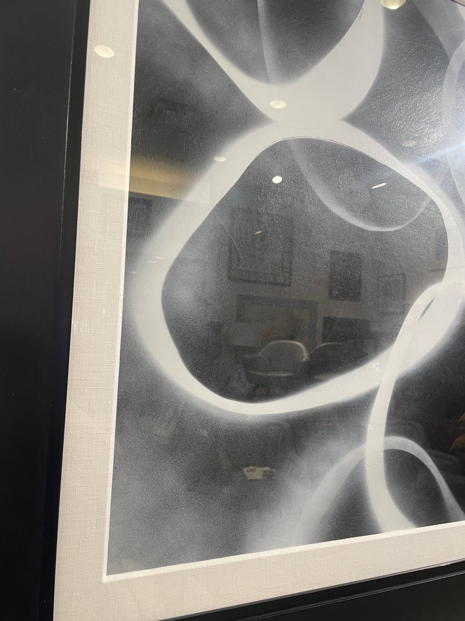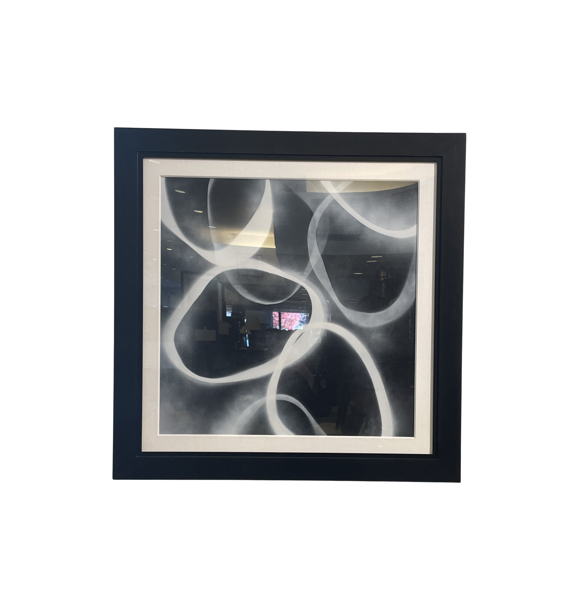 David Dauncey black and white multimedia abstract on paper. Signed lower right. This beautiful piece in shades of black and white has an interlocking ring motif. The shading gives the art an almost X-ray appearance. The piece is set on a white mat and held in a black frame. A charming and versatile piece that is sure to elevate a space.