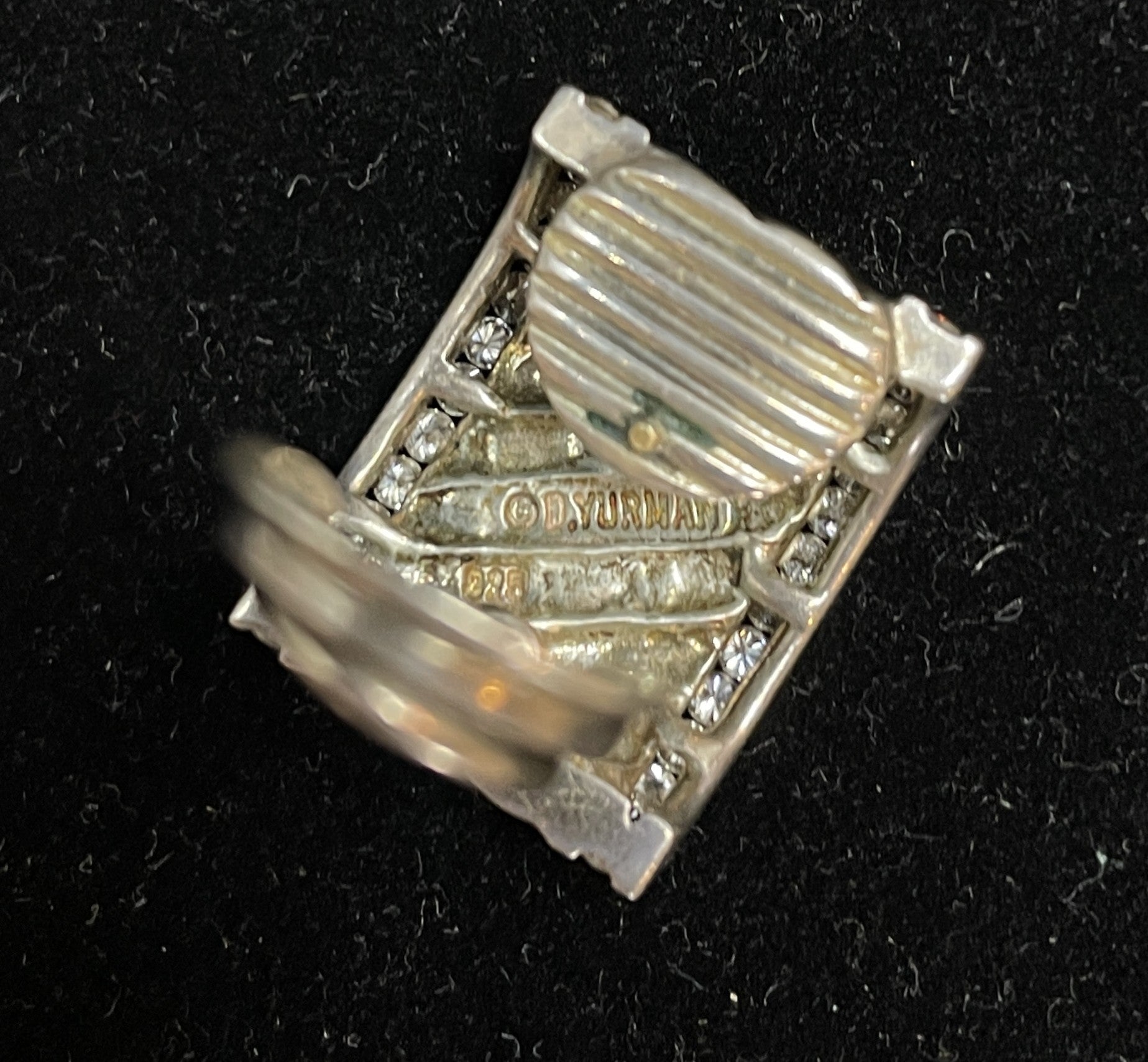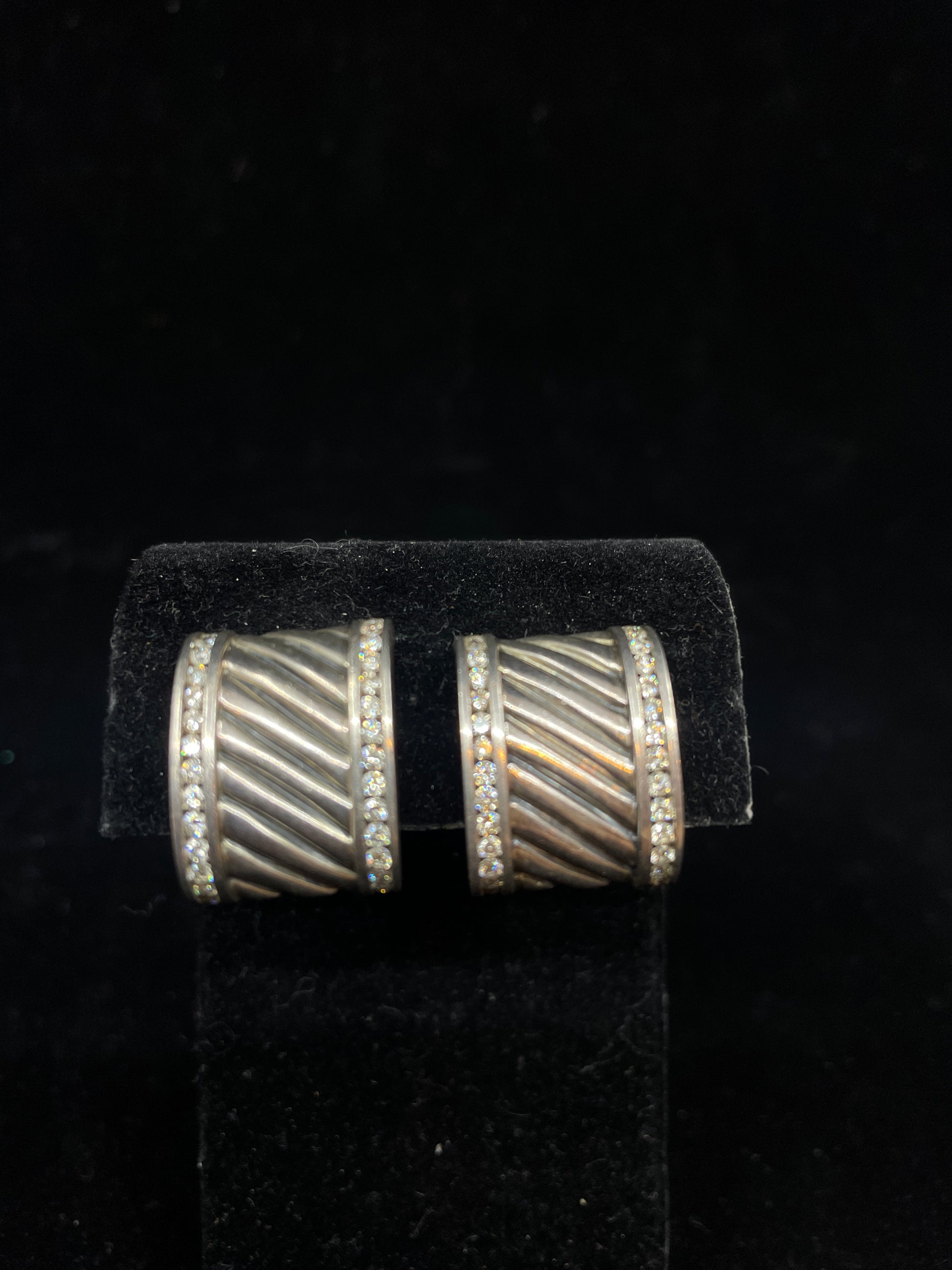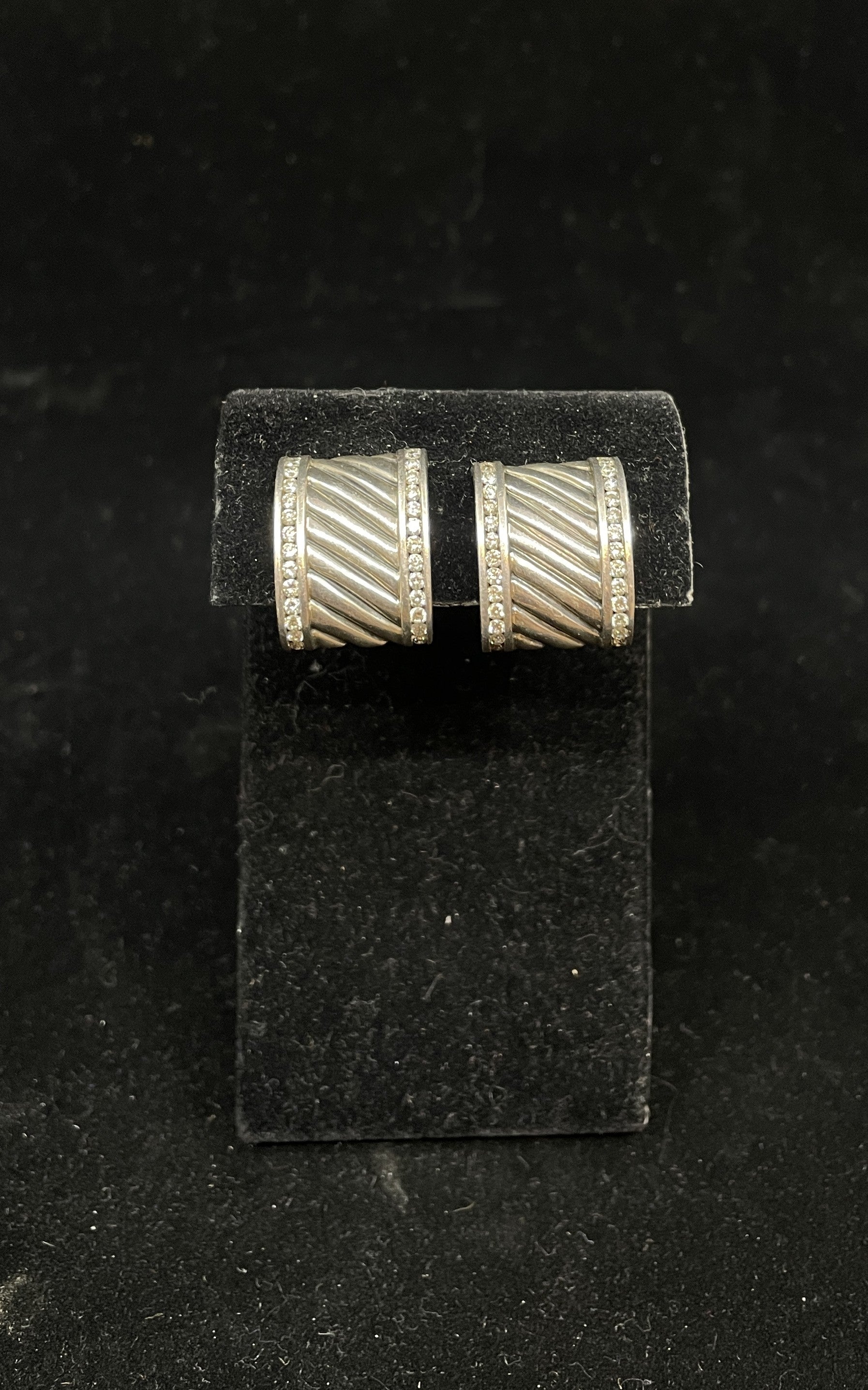 Rectangular clip on earrings by the brand David Yurman. Earrings feature a sterling silver construction with a diagonal line design and 1K diamonds on the edges. Stamped D. Yurman, 925 on the back of the earring