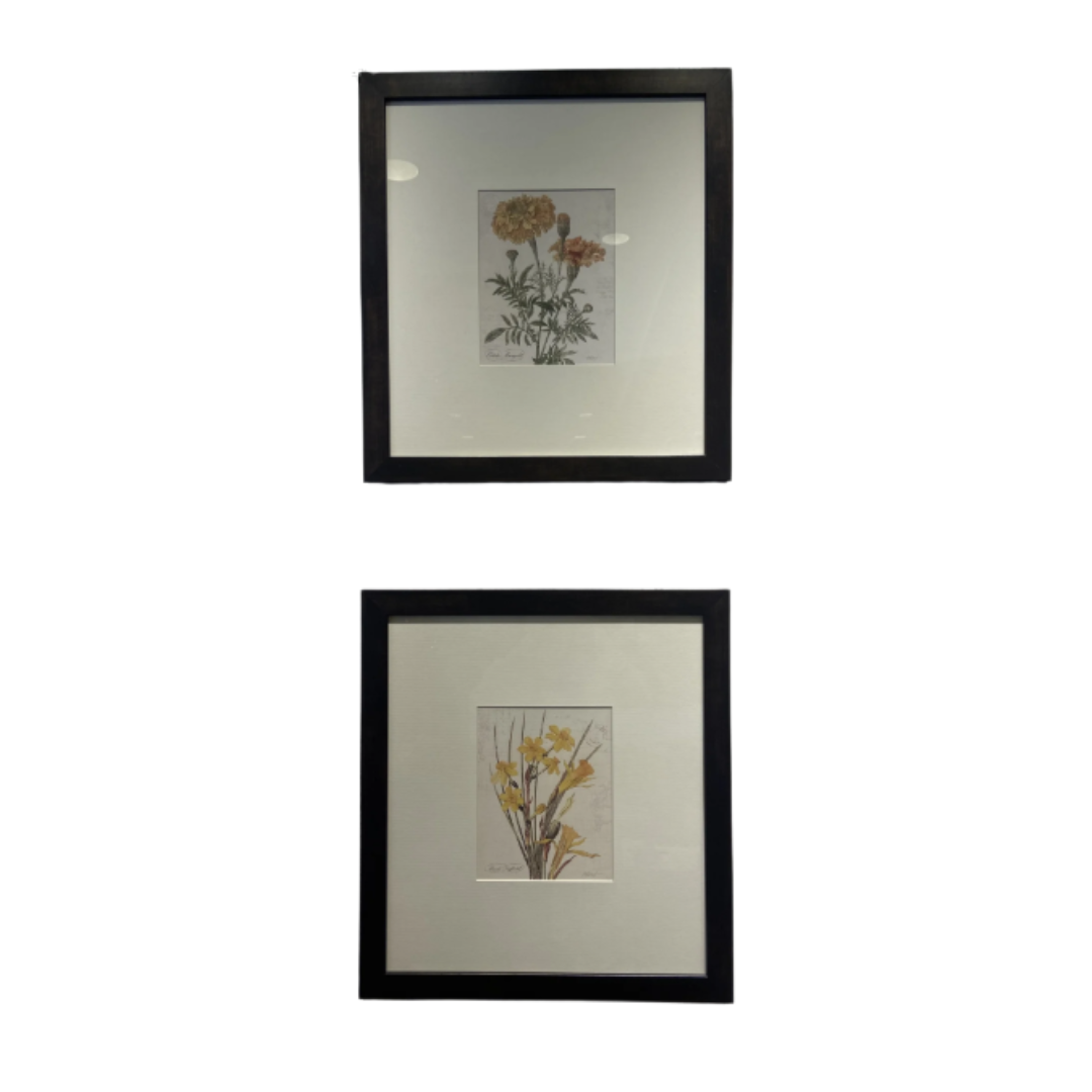 Framed pair of botanical prints by the brand Decorative Arts. Features "March Daffodil" and "October Merigold" prints. "March Daffodil" showcases beautiful golden daffodils leaning gracefully to the side. "October Merigold" depicts a red and gold marigold blooming. Each flower is titled in the bottom left corner and signed in the bottom right. The images are held in matching black frames with white matting. A manufacturer's signature is also present on the back of the frame.